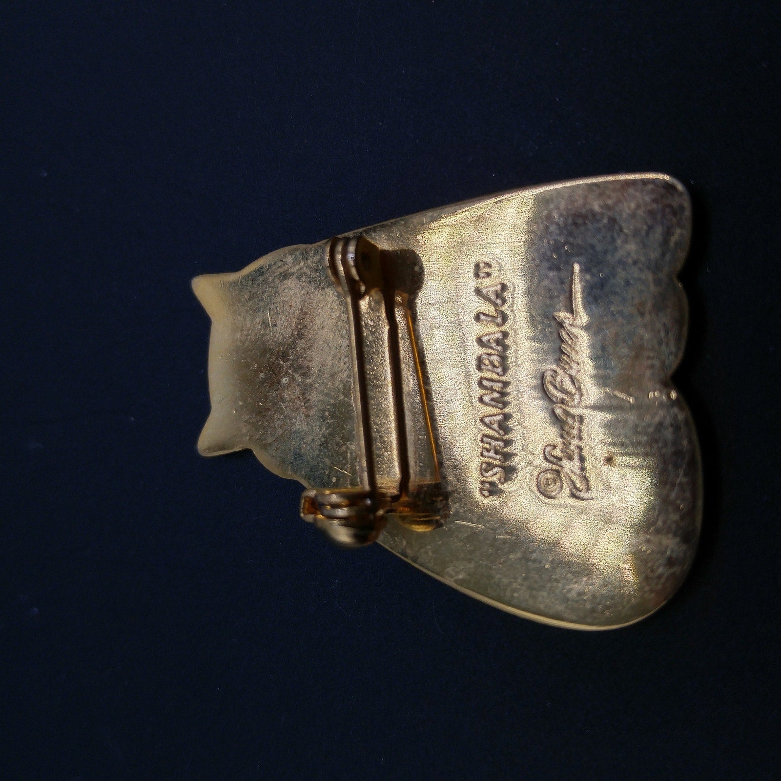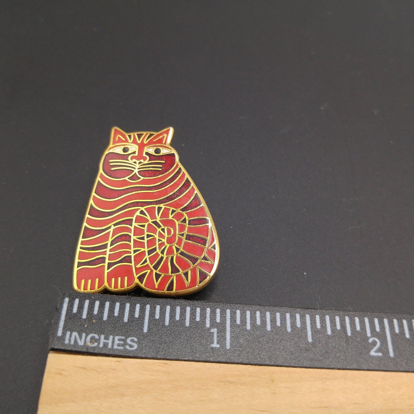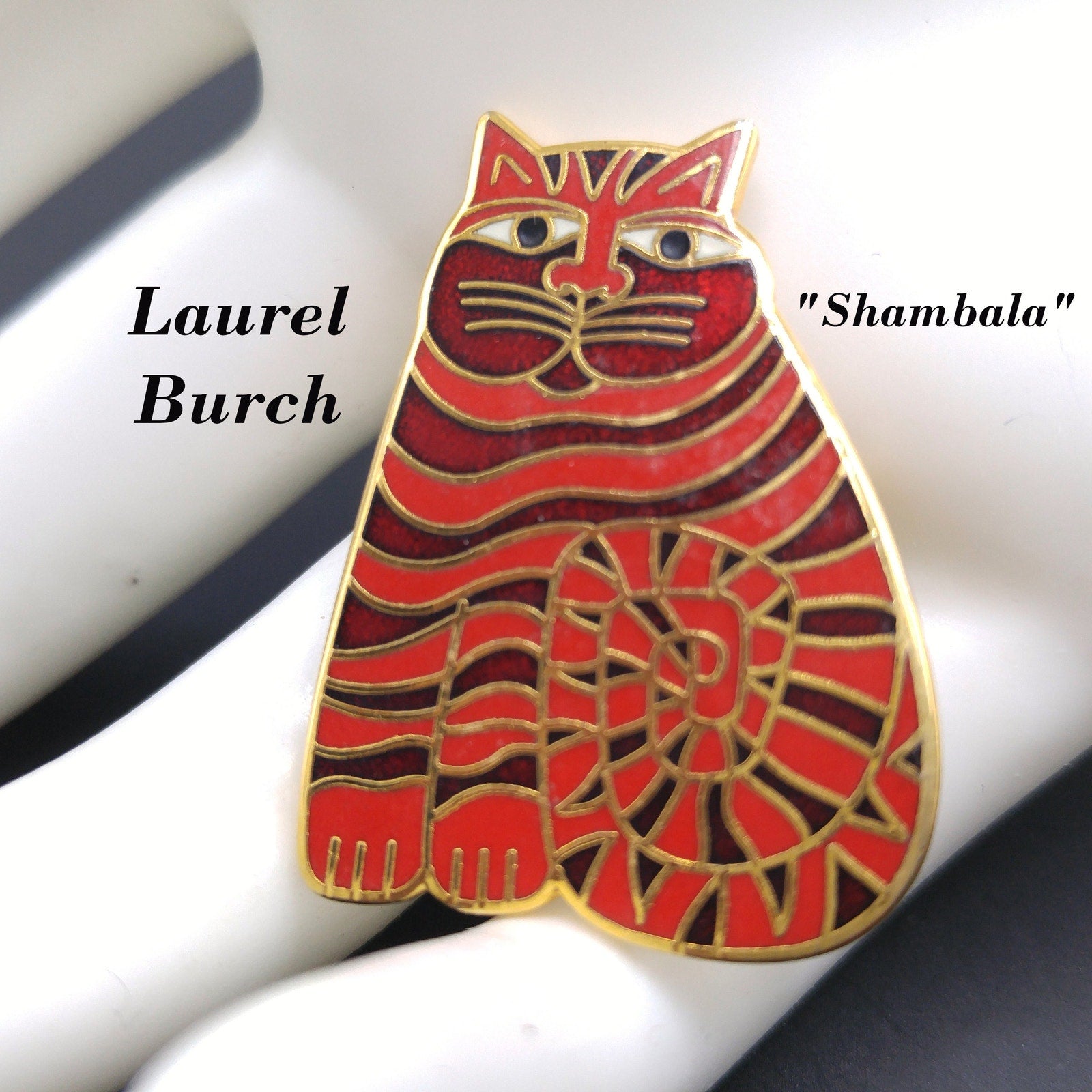*Description: This is a beautiful Laurel Burch "Shambala" cat brooch in two shades of red; medium red and darker metallic red from the 1980s. This brooch is in the Shambala design with gold plated cloisonné with two shades of red enamel, all outlined in gold. This is a perfect brooch for a cat or animal lover. The original paper card is with the brooch and this is where the brooch was stored when not worn. The brooch shows very little wear. This would be a great addition to your vintage jewelry collection or make a great vintage gift!