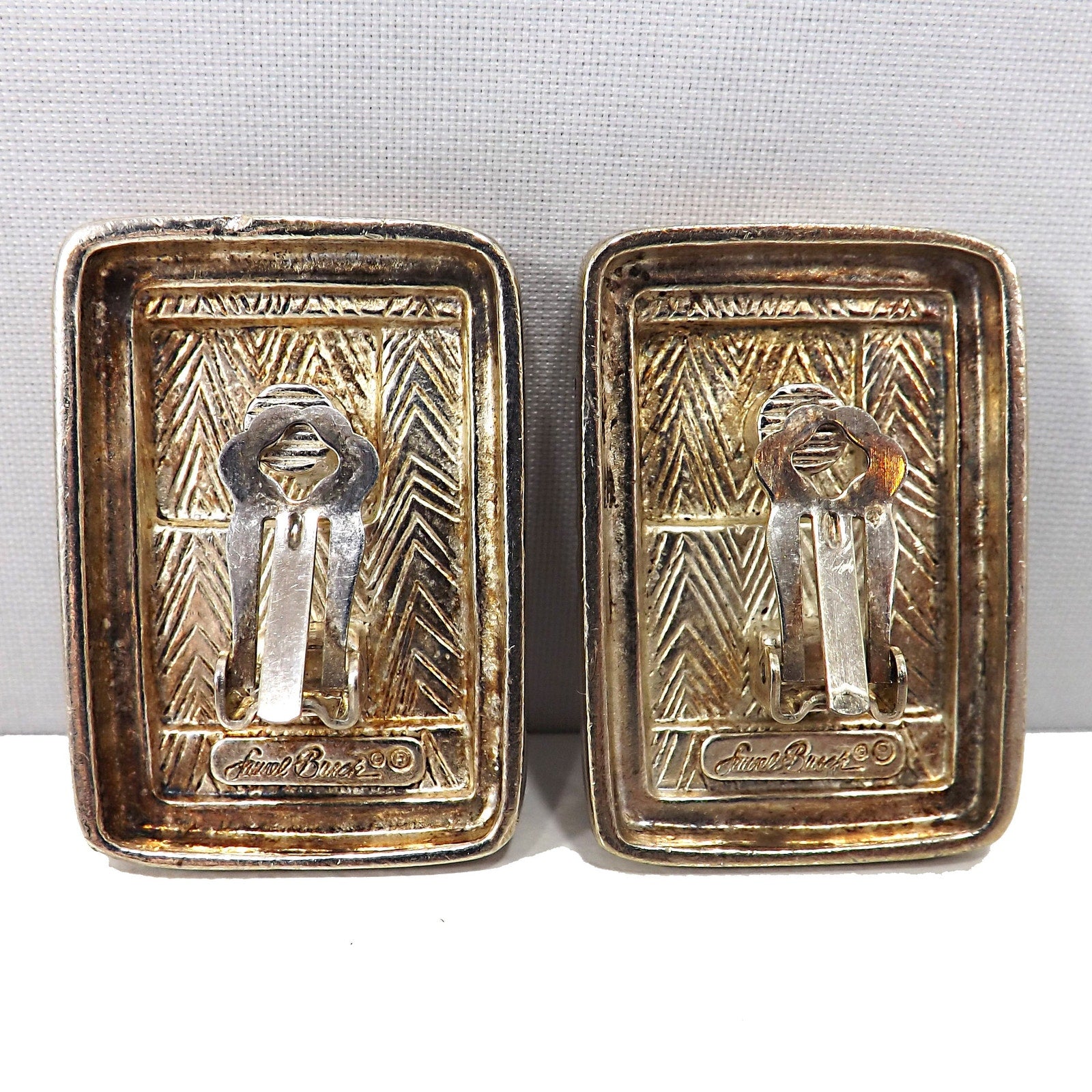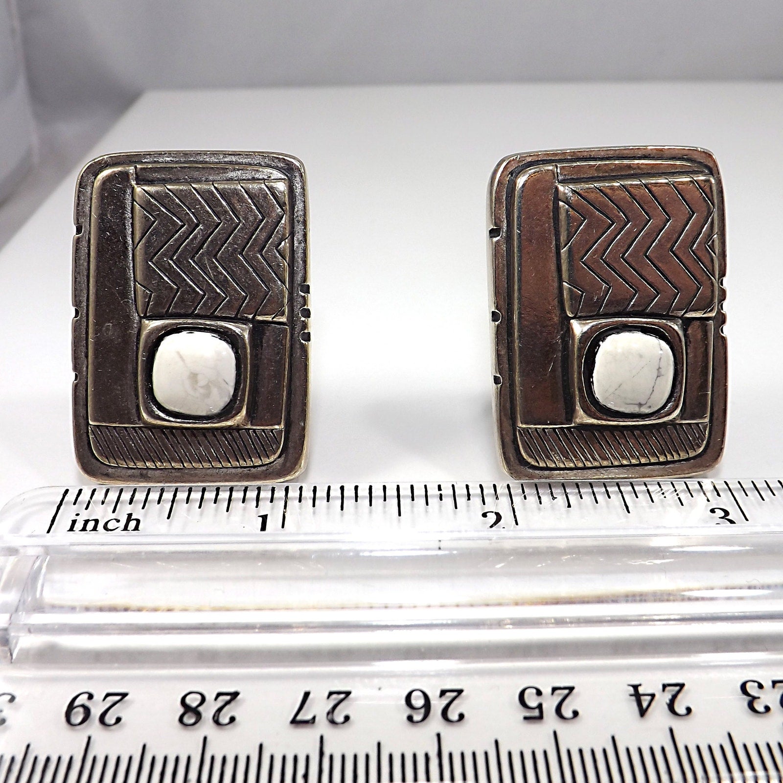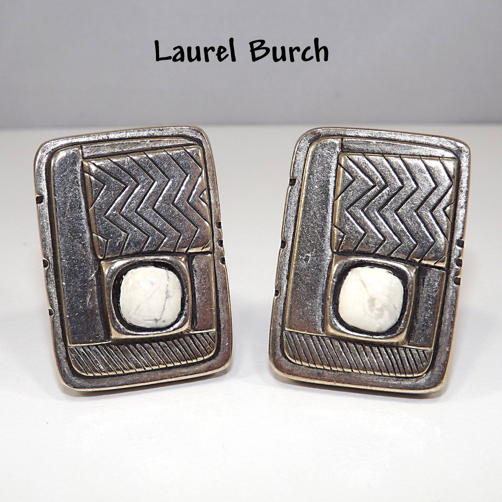 This rare pair of vintage Laurel Burch earrings from the 1980s features a bold rectangular design with chevron and line motifs, accented by a centered white magnesite stone. The earrings are silver plated with natural patina and have not been polished, allowing the darkened areas to beautifully enhance the texture and design. Each earring is signed Laurel Burch on a raised cartouche on the reverse.
