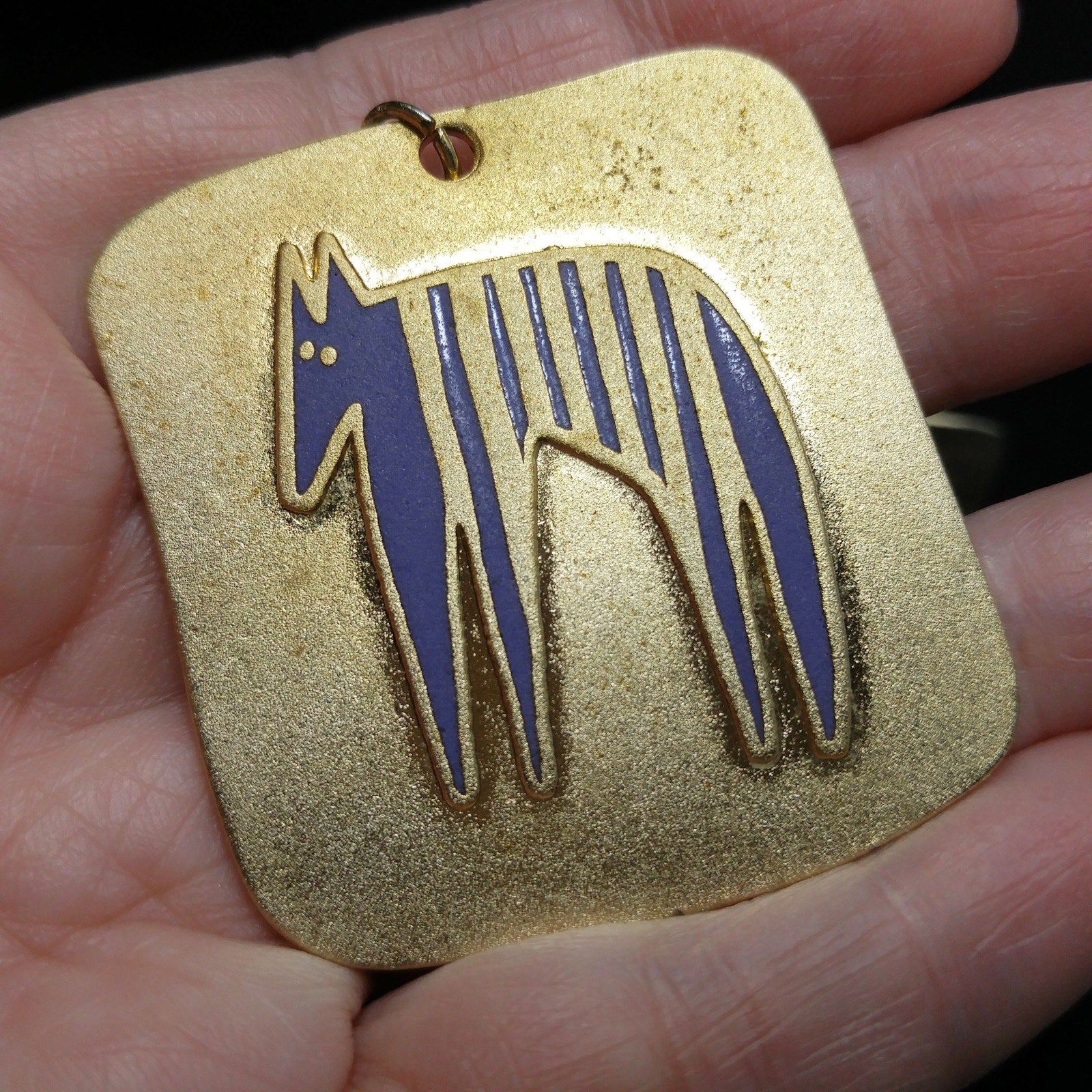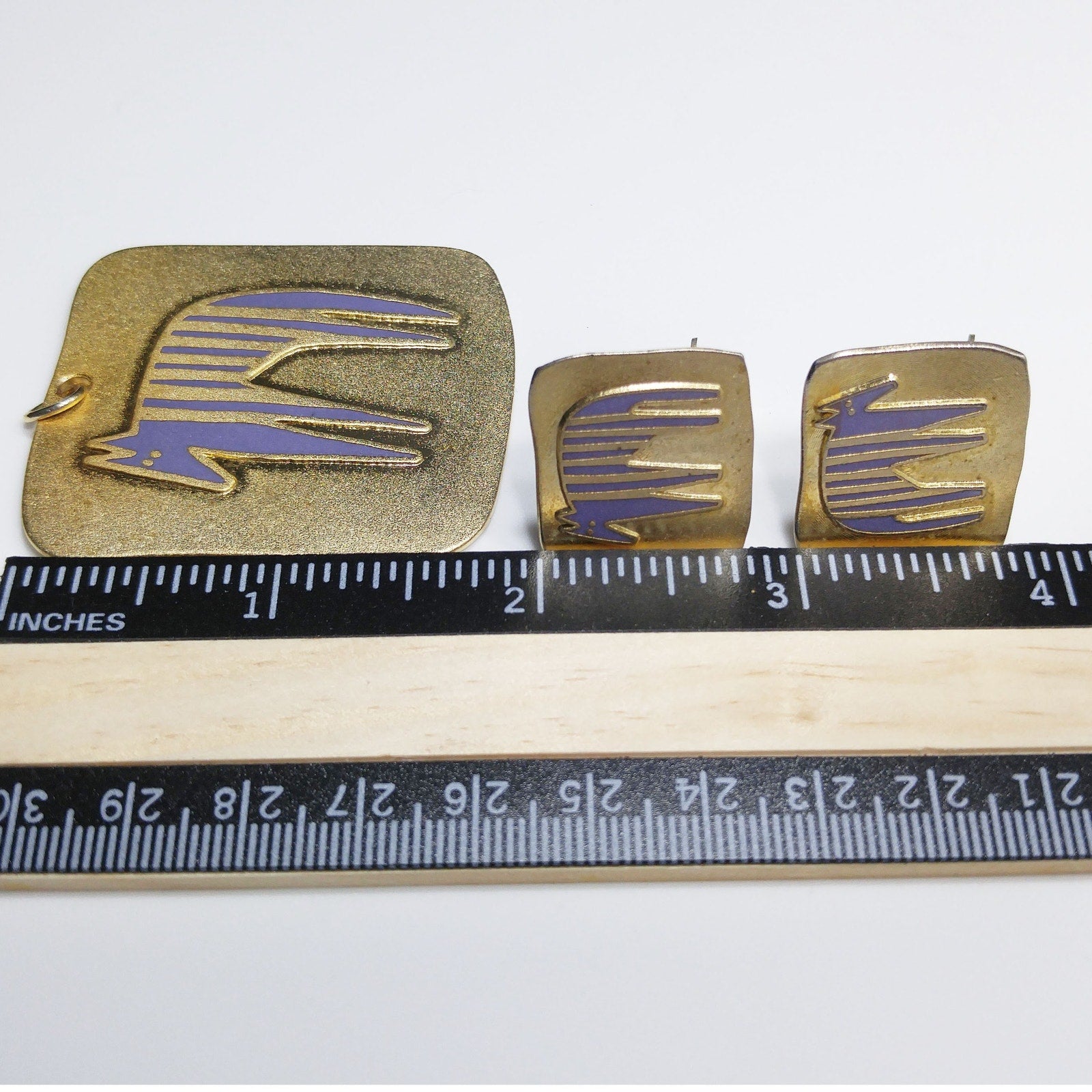 Laurel Burch "Striped Beast" Pendant & Earrings, Brass Purple Enamel, 1980s