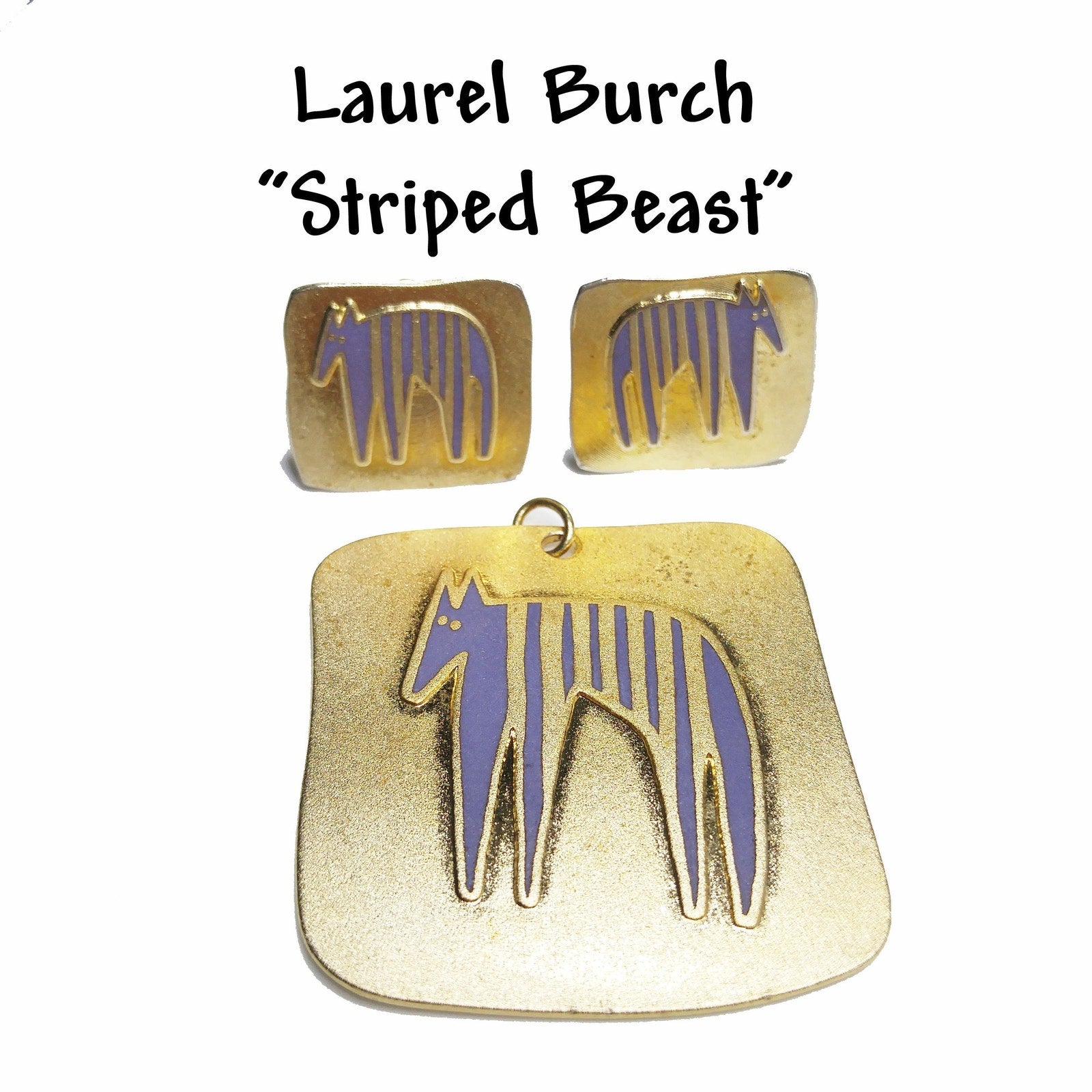 *Description: This is a great jewelry set by Laurel Burch from the 1980s. The design is entitled "Striped Beast" and is cloisonne enamel in purple on a brass background. Both the earrings and pendant have the purple striped beast and are signed on the back with the design title and designers signature engraved. This is a very unique set and would be a great vintage gift or a wonderful addition to your Laurel Burch jewelry collection.