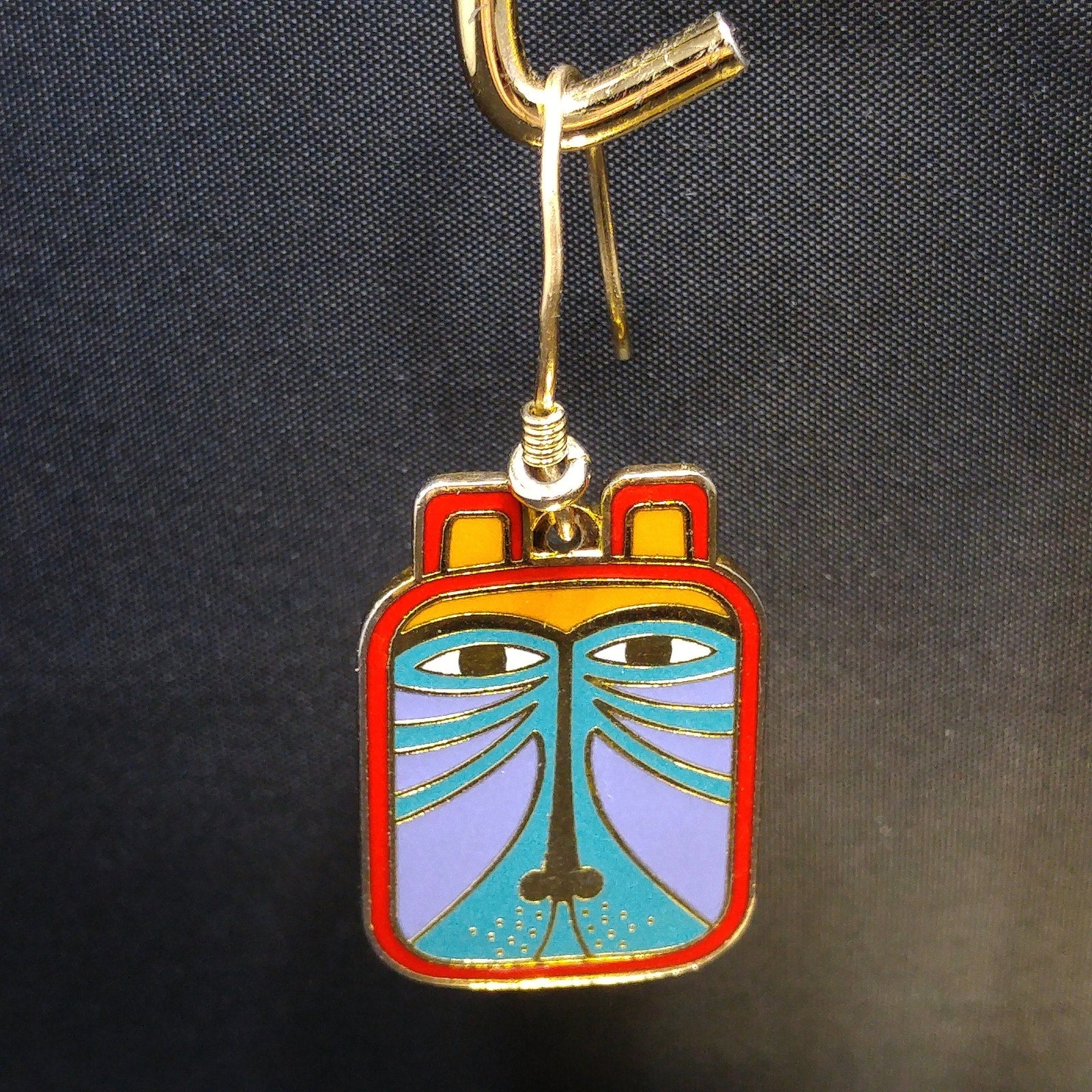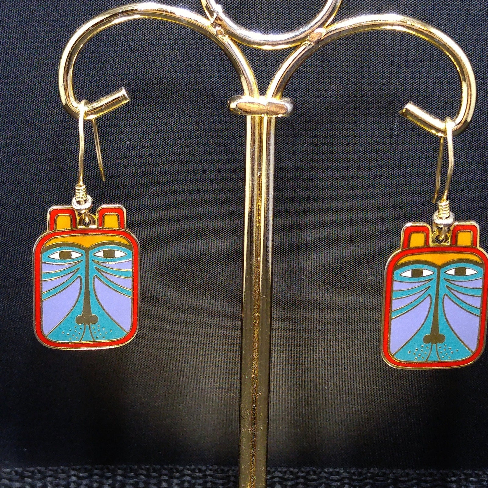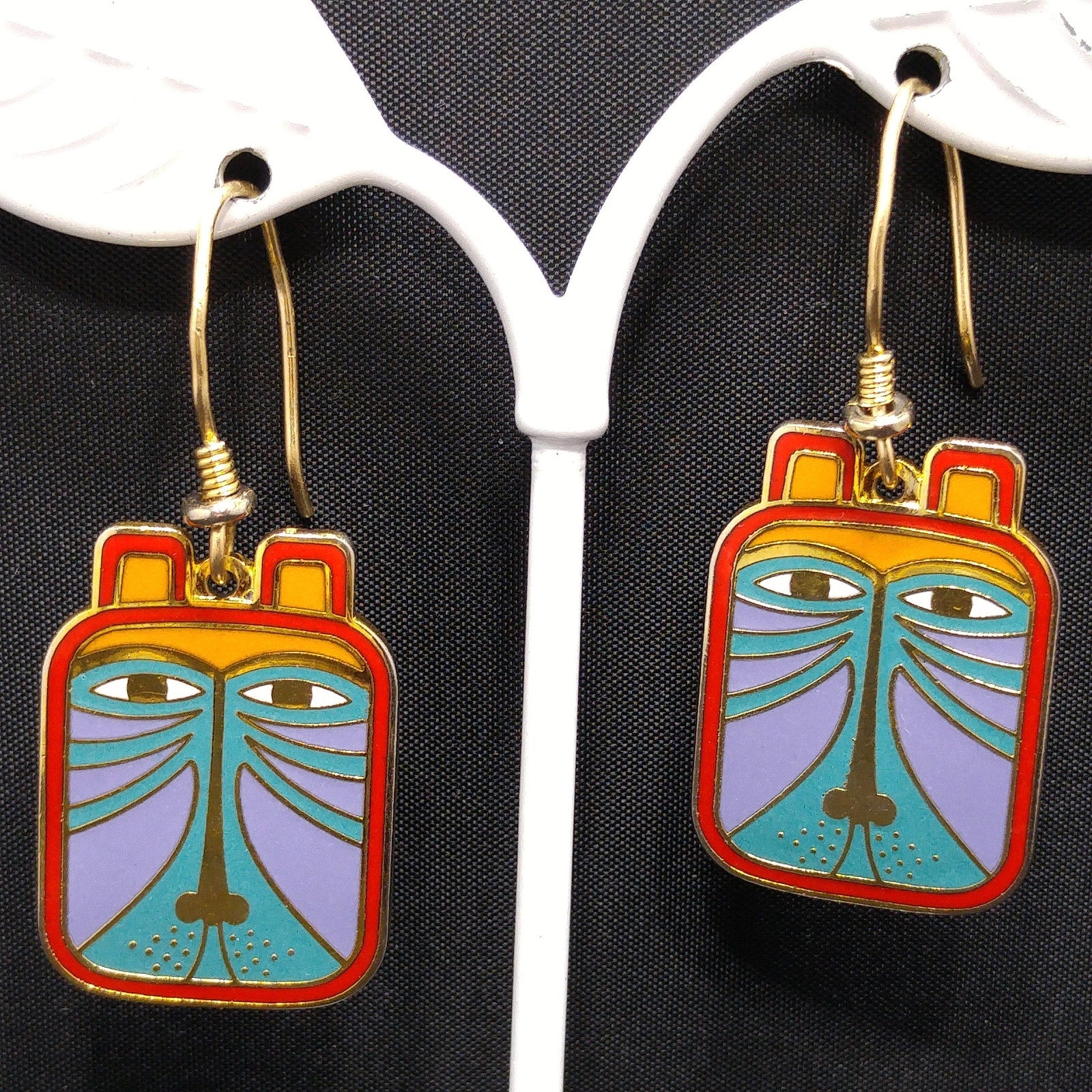 *Description: This is a great pair of Laurel Burch "Toshio" dangle earrings from the 1980s. The earrings are gold plated cloisonné and backing with enamel in a variety of colors, which include a purple blue around the face which could be mane, red and orange ears and top of head, teal green and lavender face, all outlined with the gold. The ear wires are gold filled. The design name and designer are stamped on the back of each. This is a great tribal look pair of earrings. Note: The ear wires have been misshaped so please review photos prior to purchase. This would be a great addition to your vintage jewelry collection or make a great vintage gift!