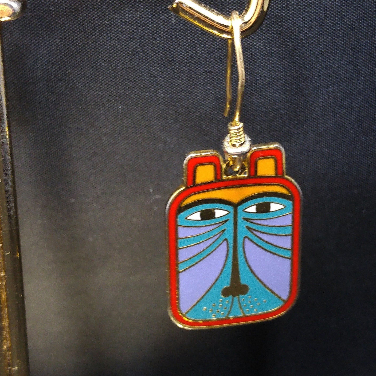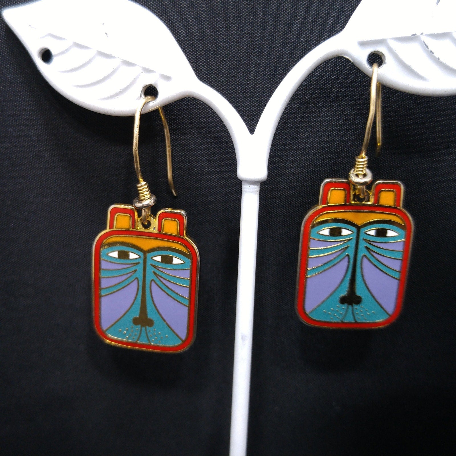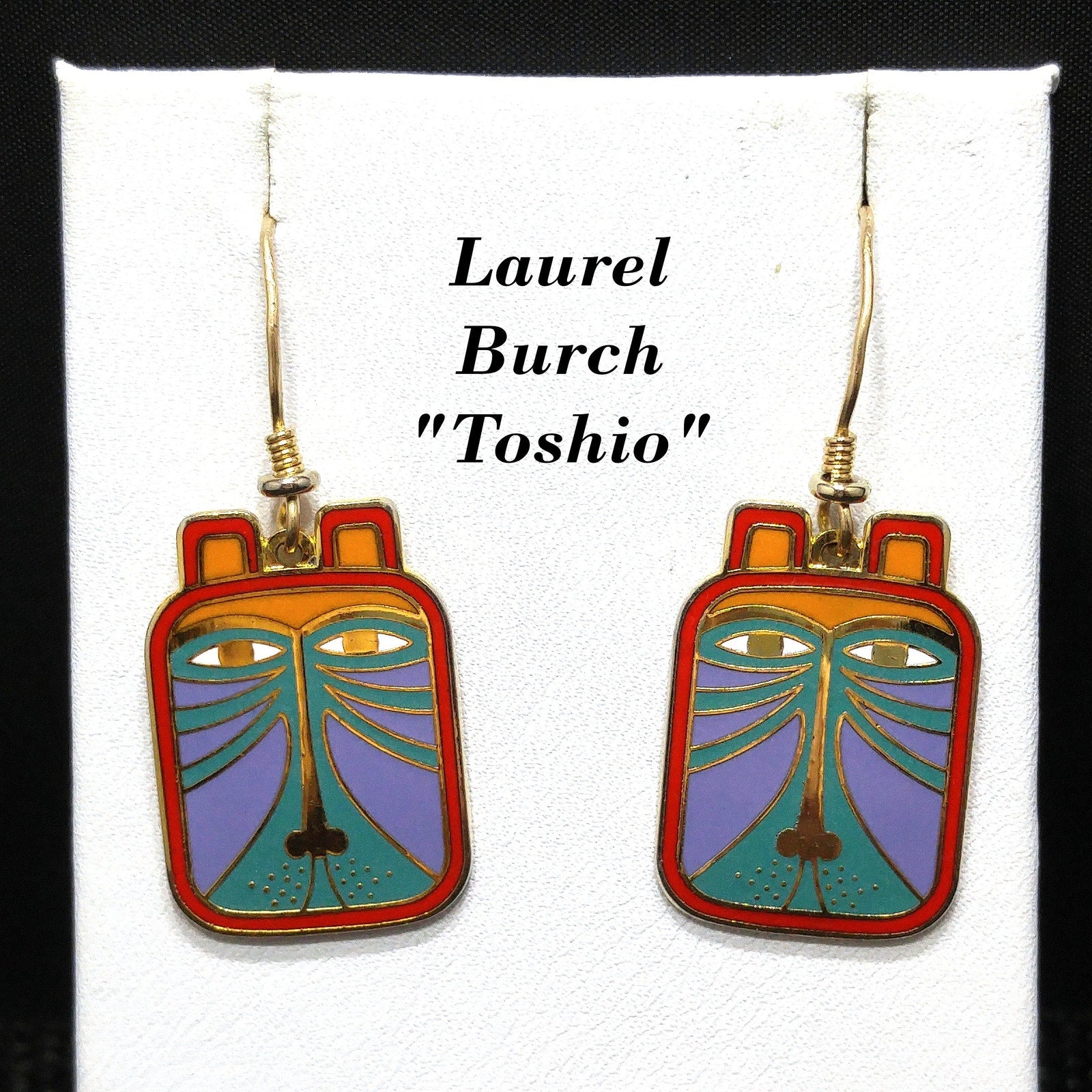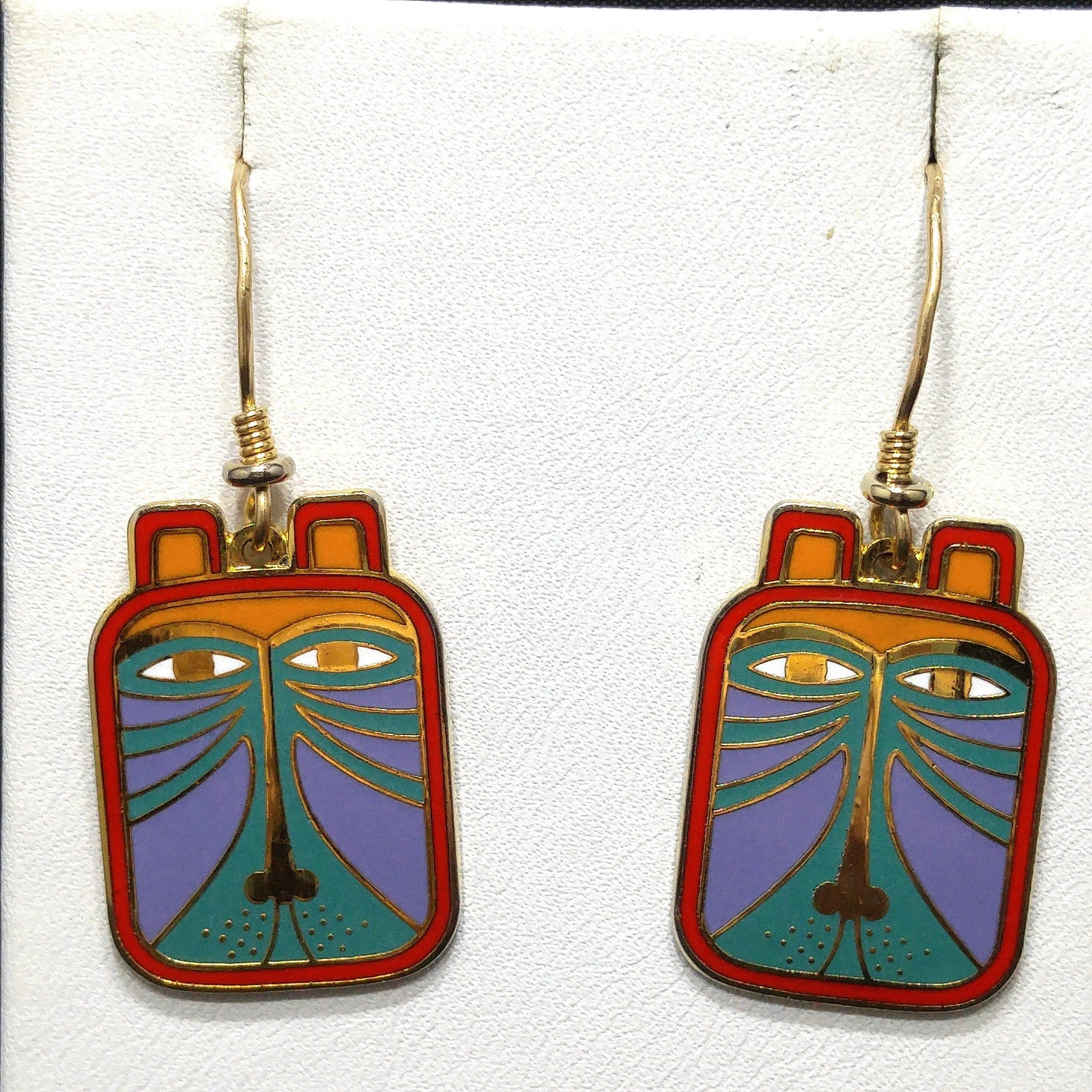 *Description: This is a great pair of Laurel Burch "Toshio" dangle earrings from the 1980s. The earrings are gold plated cloisonné and backing with enamel in a variety of colors, which include a purple blue around the face which could be mane, red and orange ears and top of head, teal green and lavender face, all outlined with the gold. The ear wires are gold filled. The design name and designer are stamped on the back of each. This is a great tribal look pair of earrings. Note: The ear wires have been misshaped so please review photos prior to purchase. This would be a great addition to your vintage jewelry collection or make a great vintage gift!
