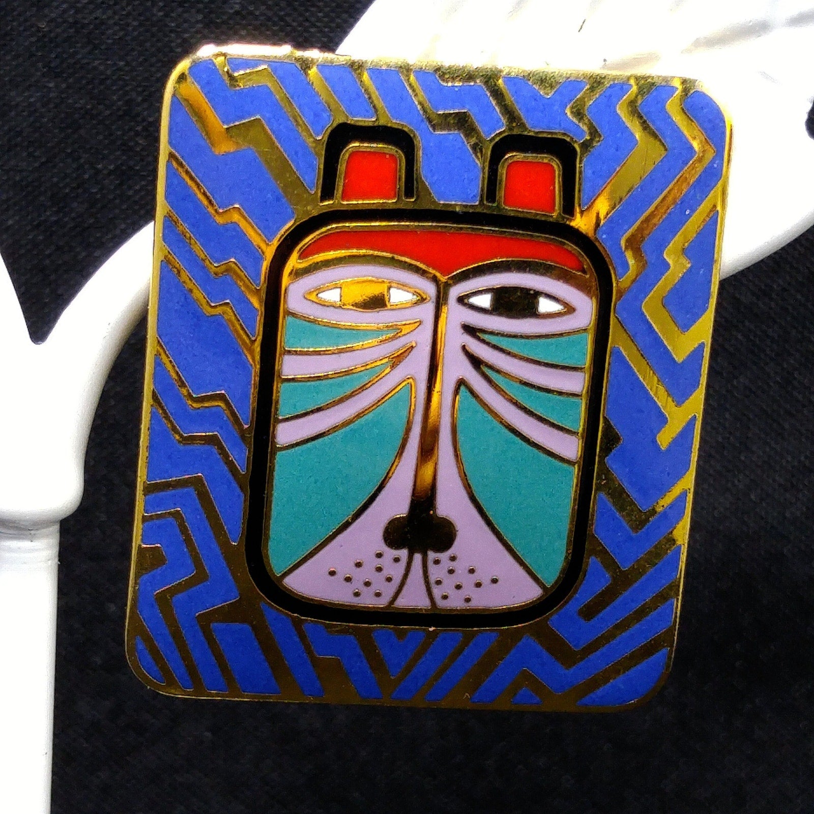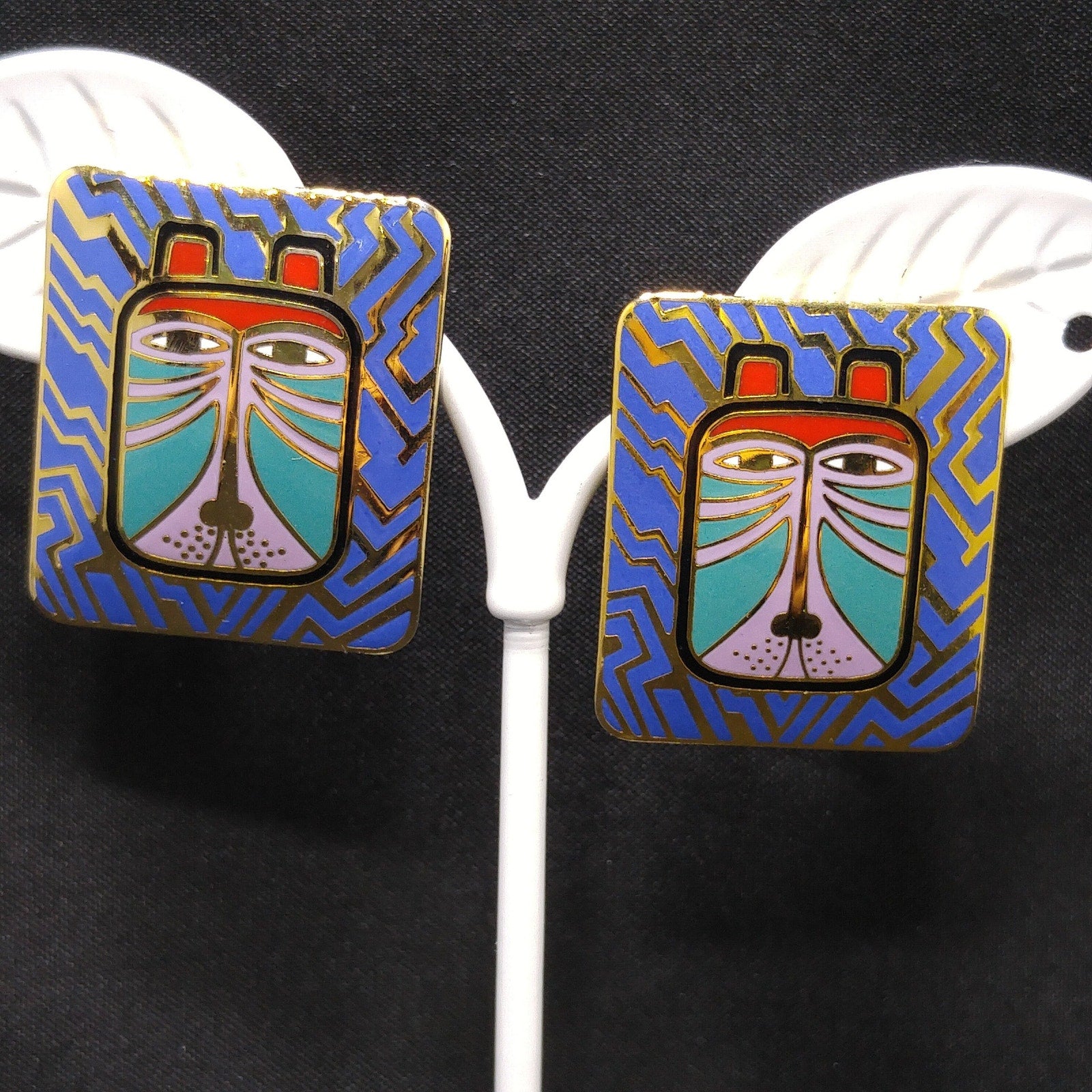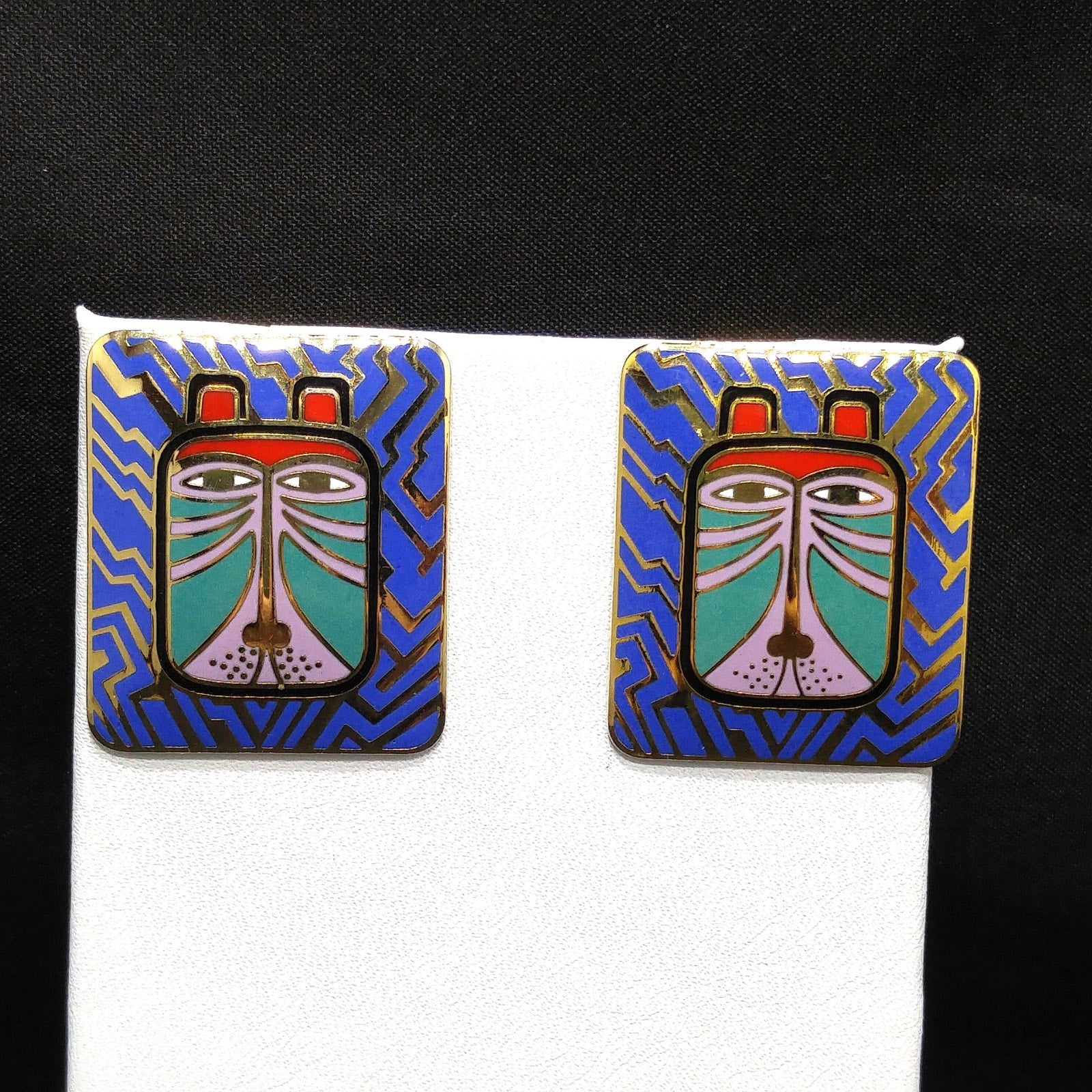 *Description: This is a great pair of Laurel Burch "Toshio" post earrings from the 1980s. The earrings are gold plated cloisonné and backing with enamel in a variety of colors, which include a purple blue around the face which could be mane, red ears and top of head, teal green and lavender face, all outlined with the gold. The post earrings are gold filled. The design name and designer are stamped on the back of each. This is a great tribal look pair of earrings. This would be a great addition to your vintage jewelry collection or make a great vintage gift!