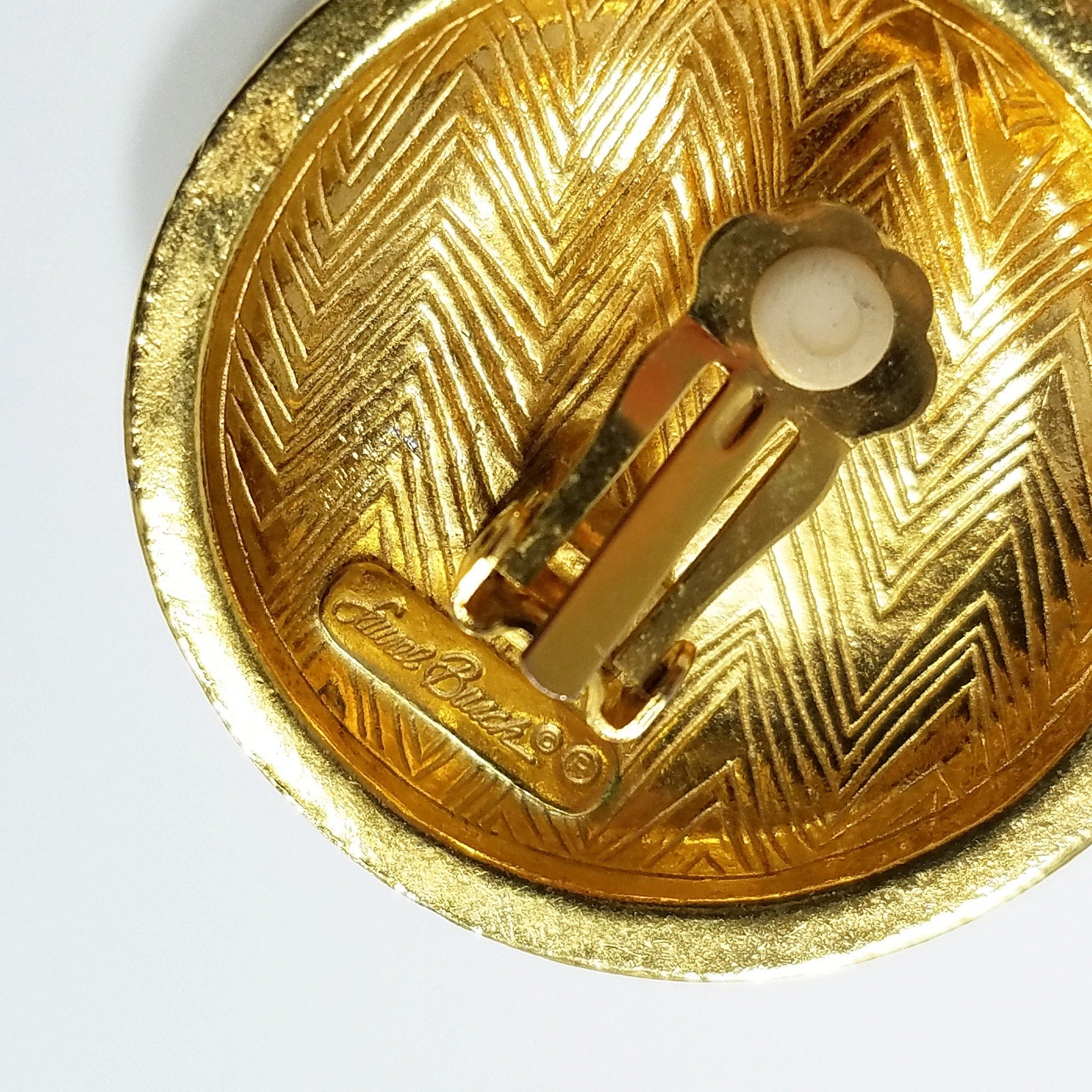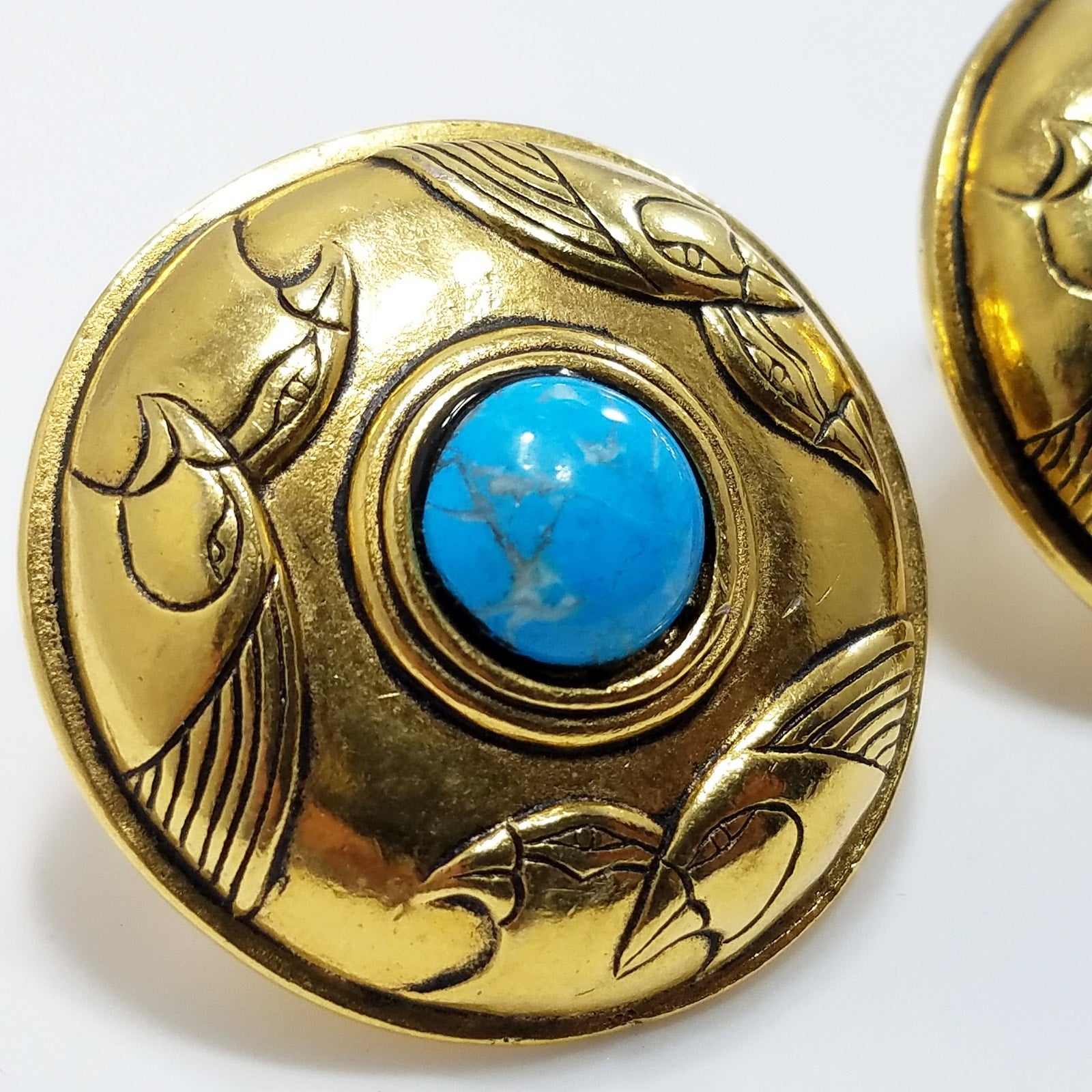 *Description: This is a beautiful pair of Laurel Burch vintage clip earrings. The center turquoise colored gemstones are the center cabochon which is surrounded by gold plated circular domed clip earrings. The theme is designed with three sets of two birds encircling the stone. These earrings are beautifully designed by artist LAUREL BURCH and signed on the back; vintage from the 1980s.