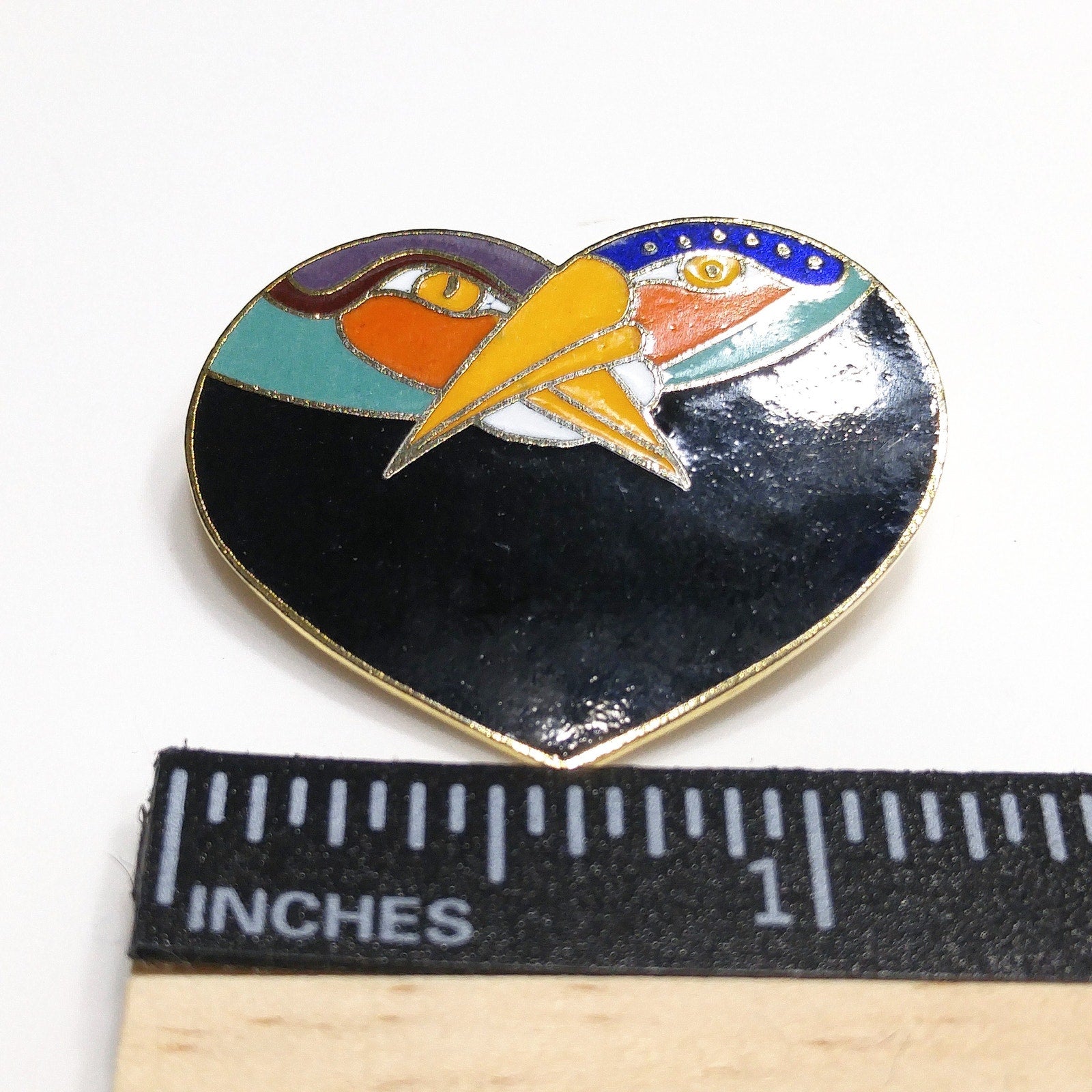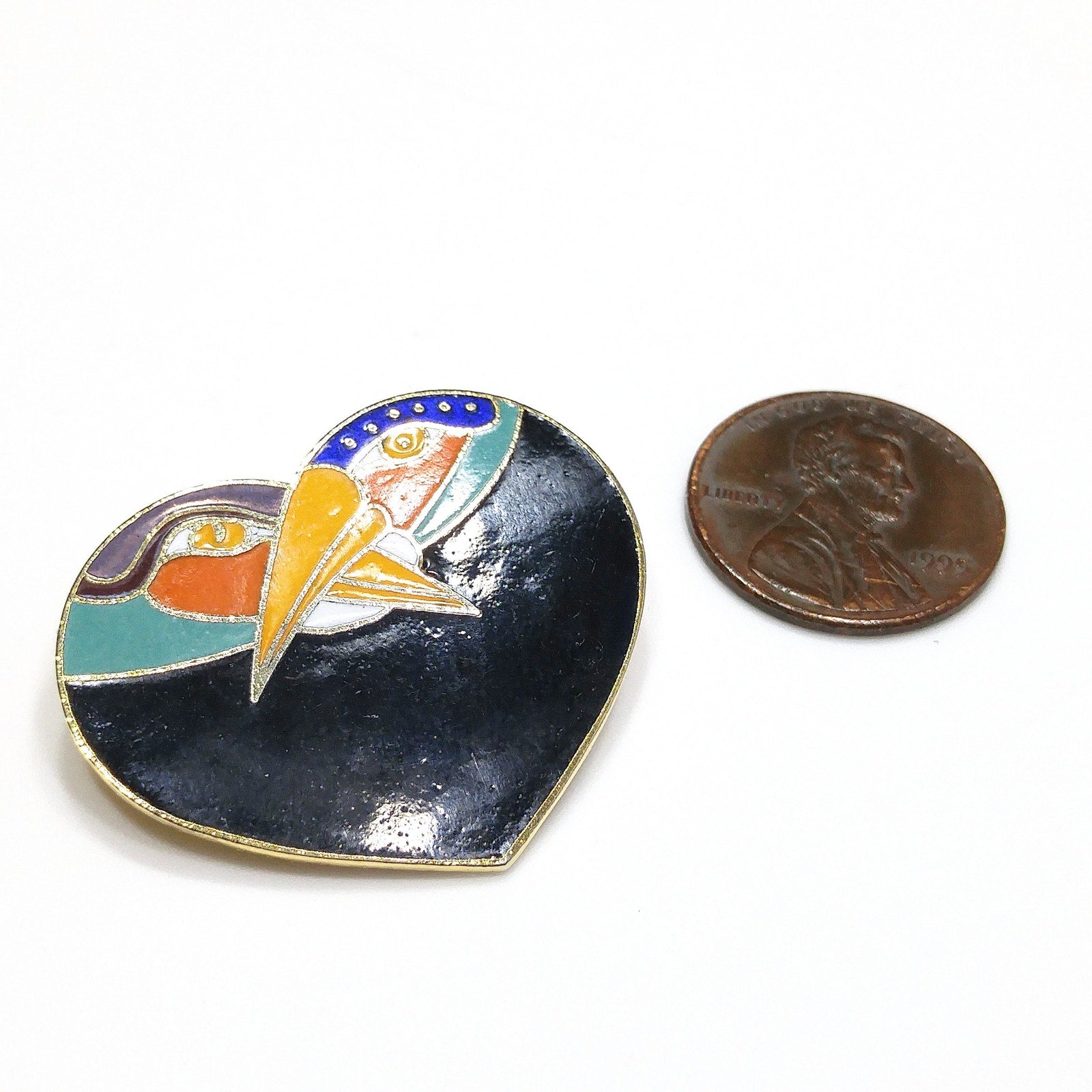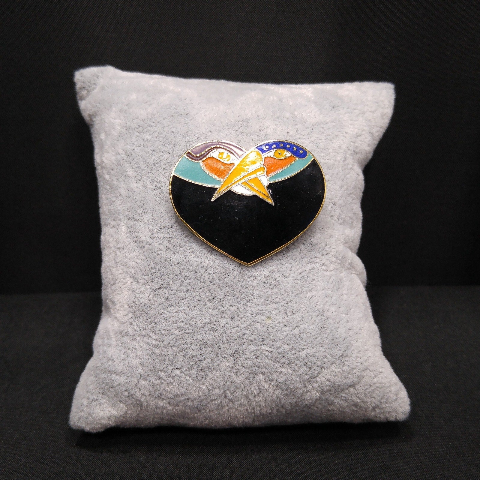 *Description: This is a beautiful Laurel Burch heart brooch featuring two birds with their beaks intertwined from the 1980s. The gold plated cloisonne brooch outlines and backing has birds with black enamel bodies and their heads have orange beaks, darker orange, teal, and dark blue faces. The brooch has been previously loved. This would be a great addition to your vintage jewelry collection or make a great vintage gift!