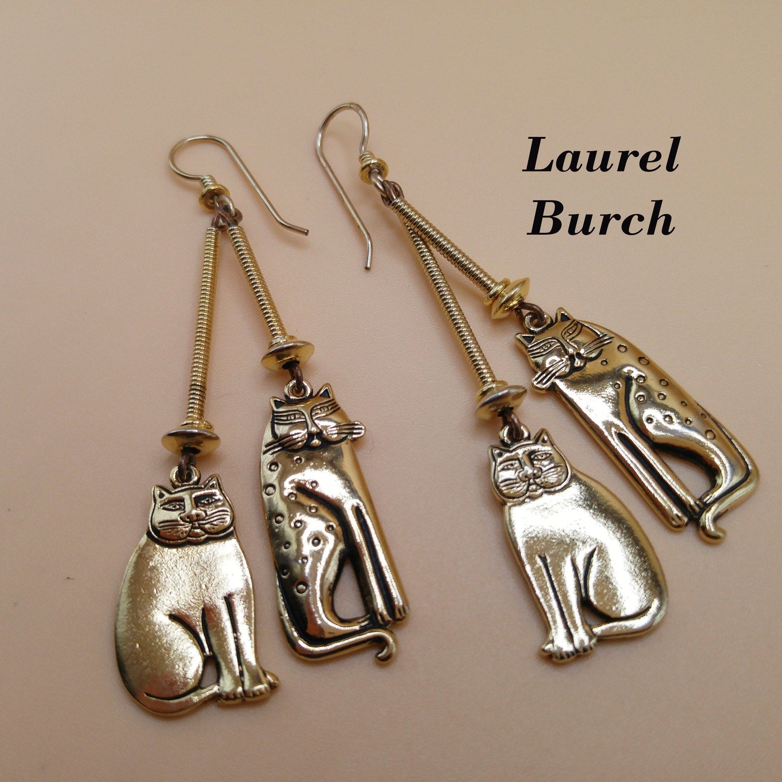 *Description: This is a great pair of Laurel Burch cat earrings featuring two of her cat designs: Siamese Cat and Mystic Cat, from the 1980s. Each cat is gold plated and the ear wires are gold filled. Each cat is stamped Laurel Burch on the back. These are a great pair of earrings for the cat or animal lover. This would be a great addition to your vintage jewelry collection or make a great vintage gift!
