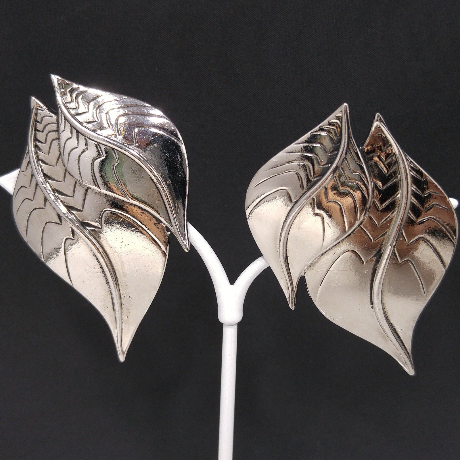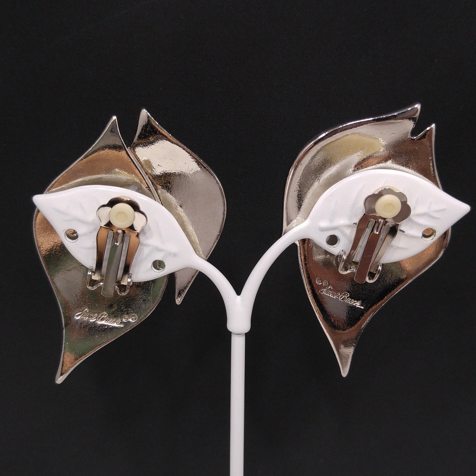 *Description: This is a great pair of Laurel Burch vintage two leaves clip on earrings from the 1980s. Each earring has two large rhodium plated leaves with black enamel in the creases of the design. The large clip earrings have two over lapping leaves with veins and stems. This pair of earrings is in great condition and look to have rarely been worn. This would be a great addition to your vintage jewelry collection or make a great vintage gift!