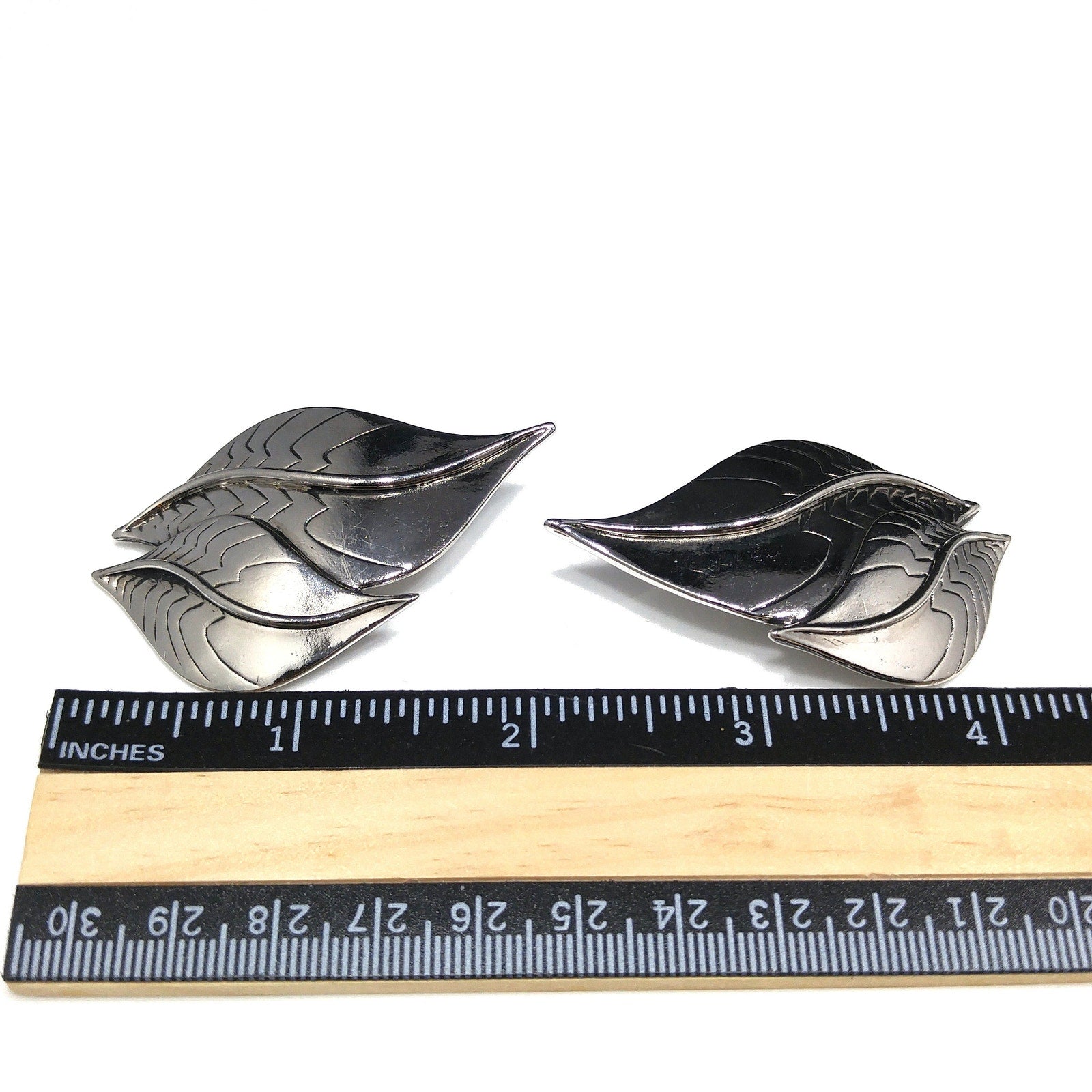 Laurel Burch Two Leaves Clip Earrings, Rhodium Plated, 1980s Vintage Jewelry