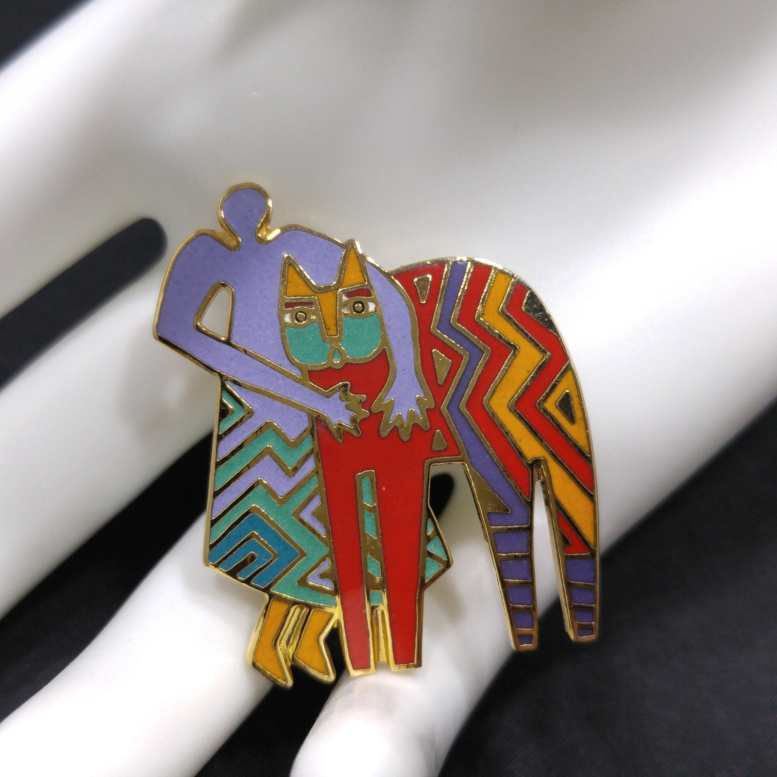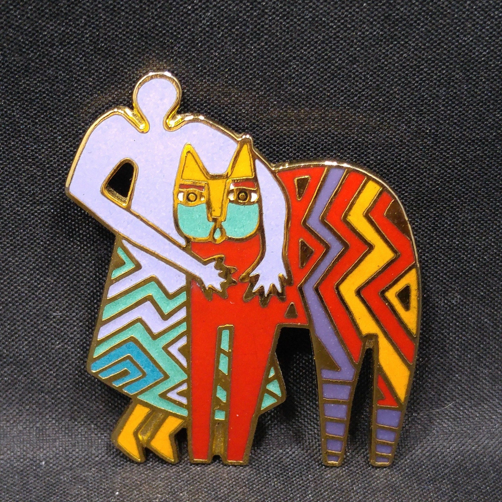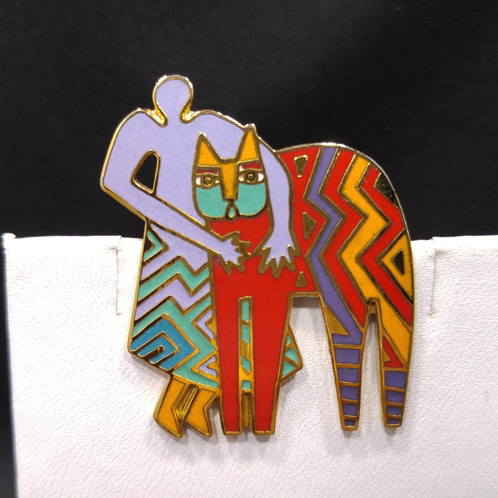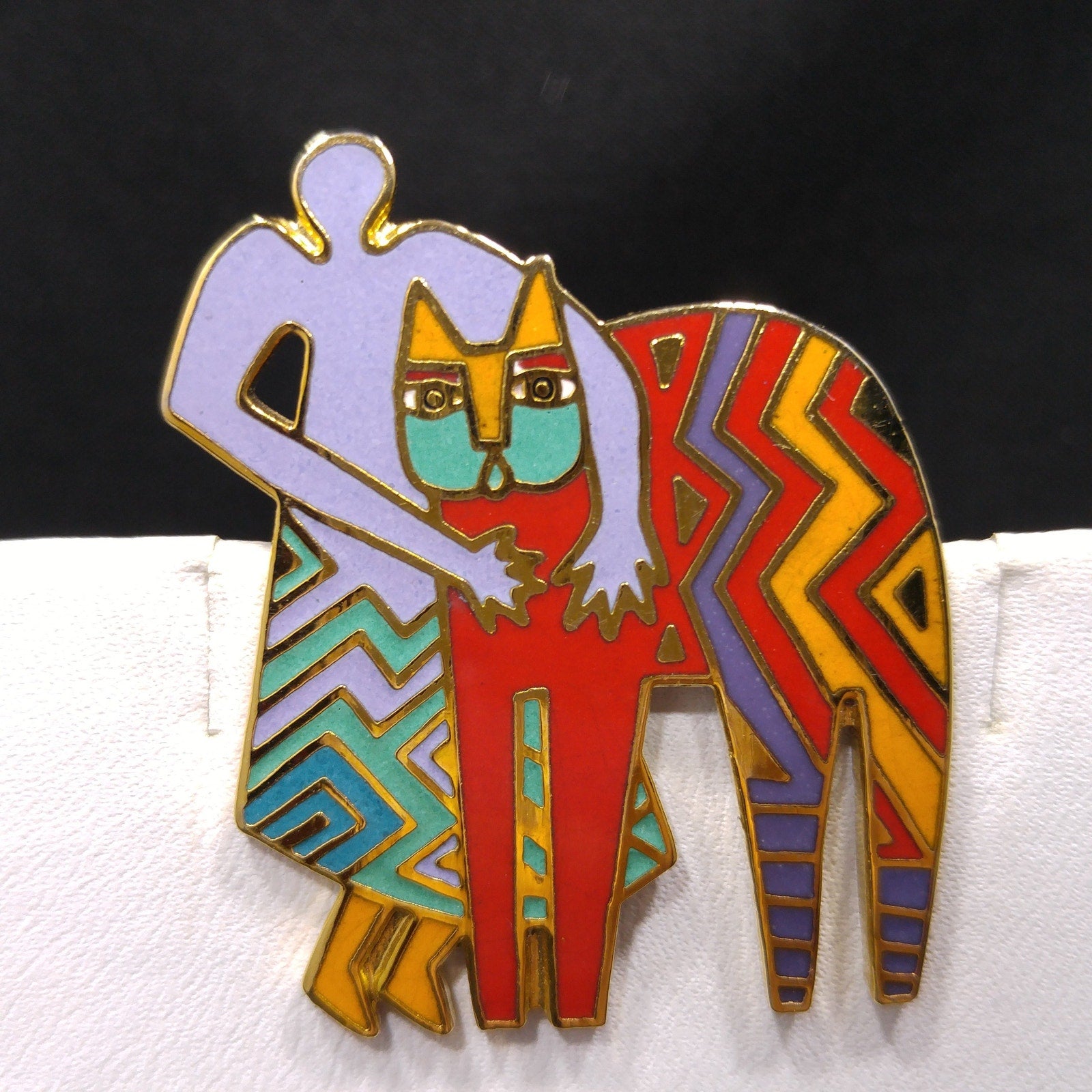 *Description: This is a great brooch, Laurel Burch's "Best Friends" which features a lady and her large cat, from the 1980s. The gold plated cloisonne is the outline and backing with enamel in purple, green, yellow, red, and lavender. It is a great vintage brooch by this wonderful artist. This would be a great addition to your vintage jewelry collection or make a great vintage gift!