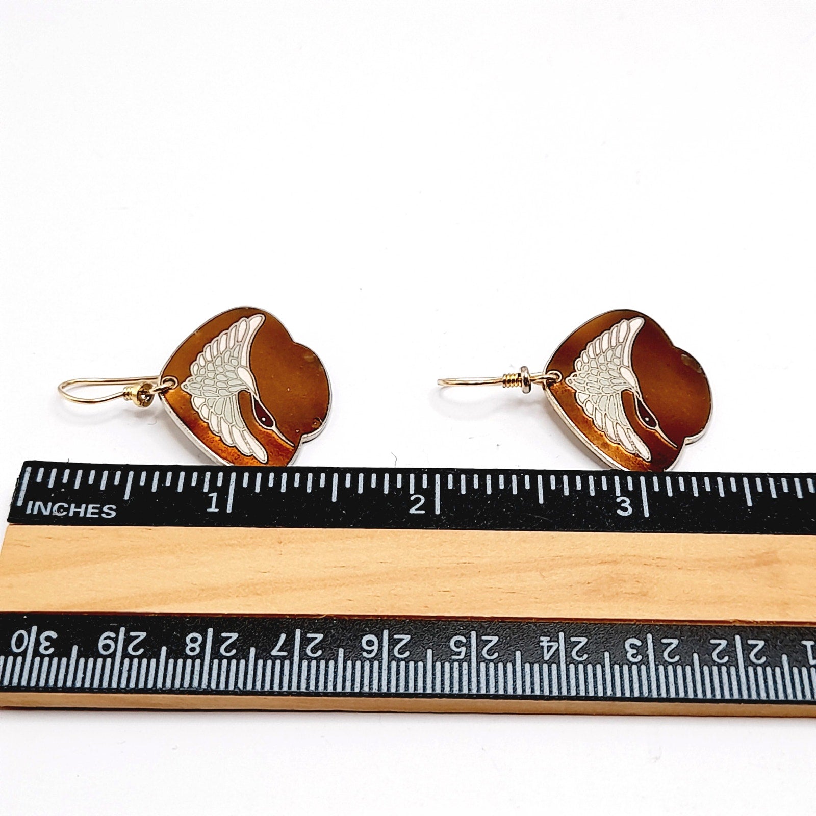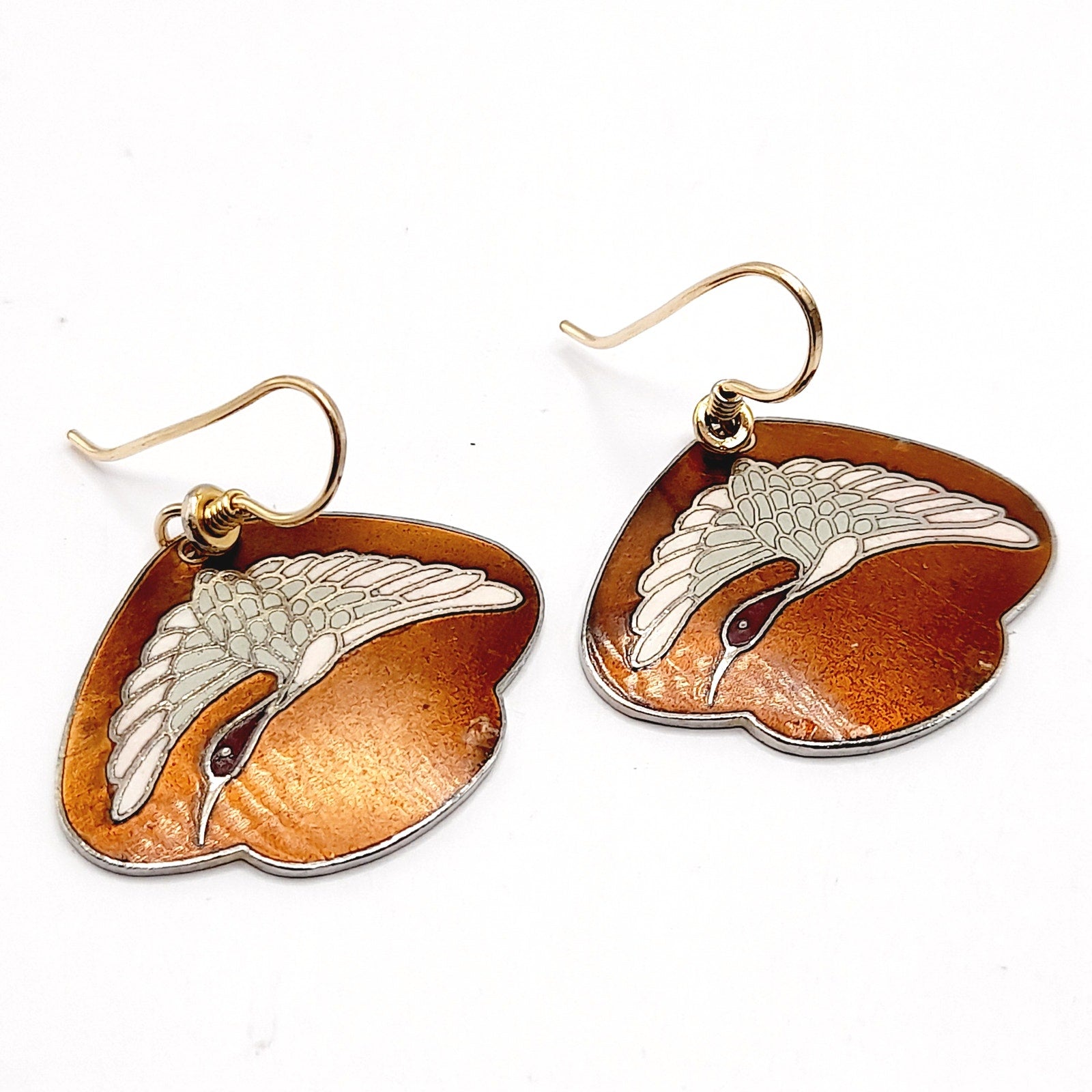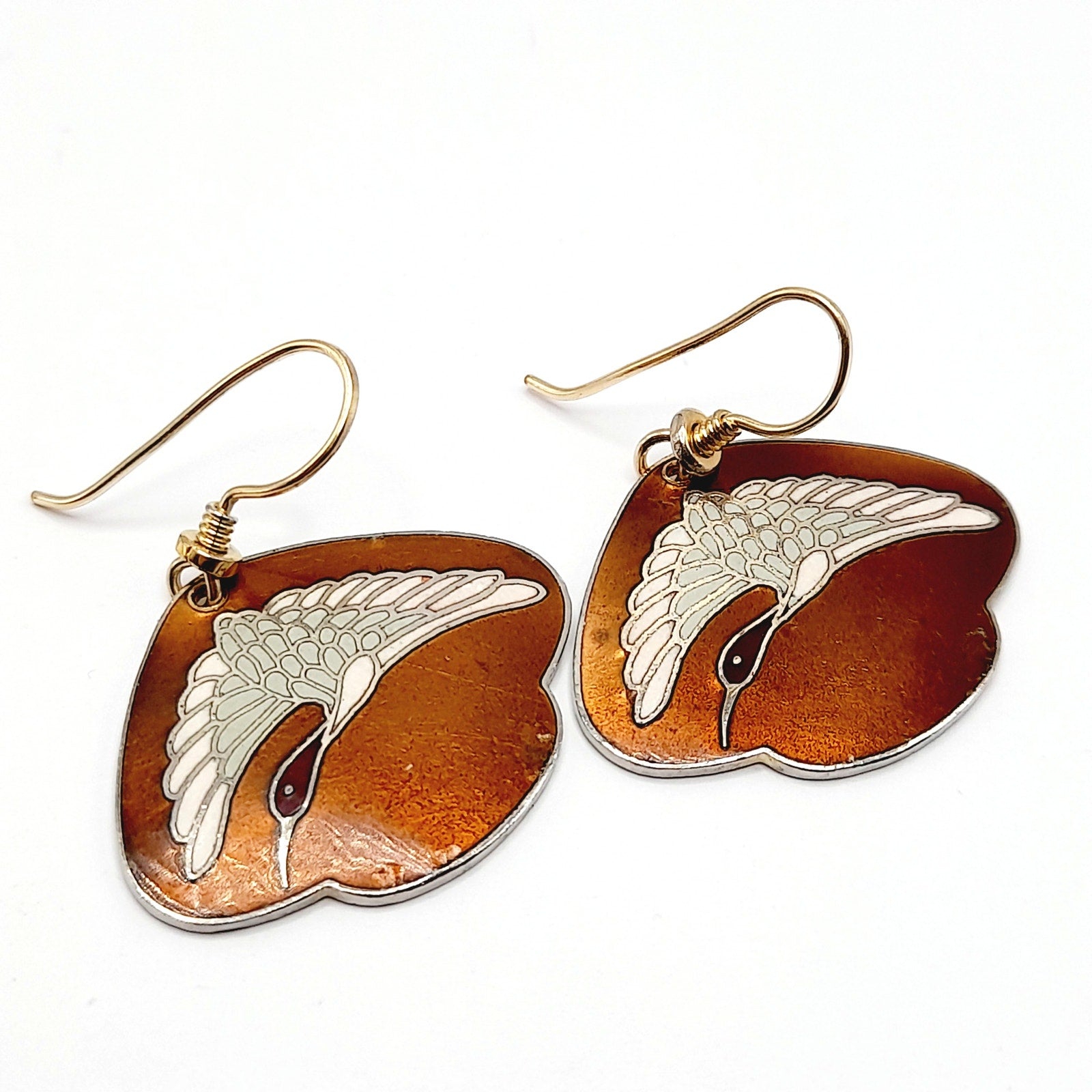 Laurel Burch White Crane Earrings, Vintage Enamel Bird Jewelry, Gold Plated Dangle Earrings, 1980s Artistic Statement Jewelry