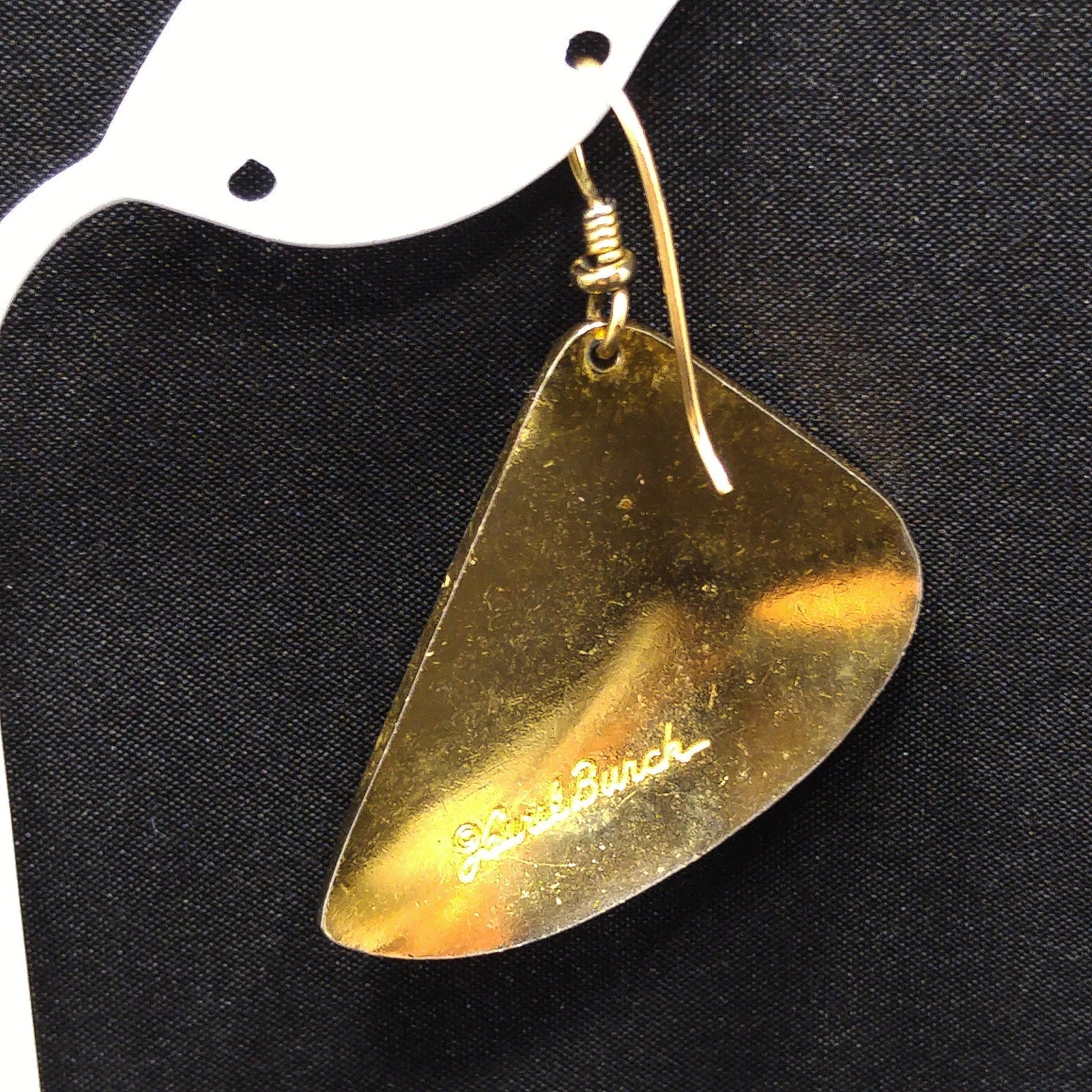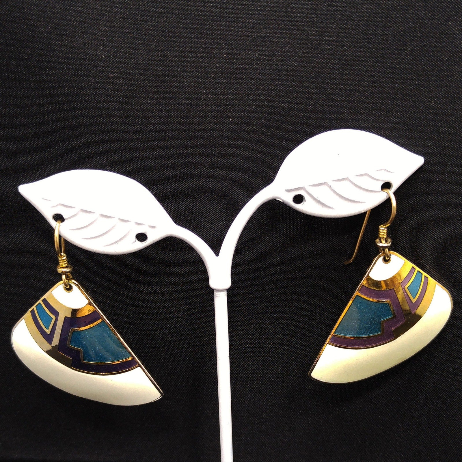 *Description: This is a beautiful matching pair of Laurel Burch fan earrings; blue, purple, and creamy white enamel with gold plated cloisonne outlines, all in a fan shape with mirrored images from the 1980s.