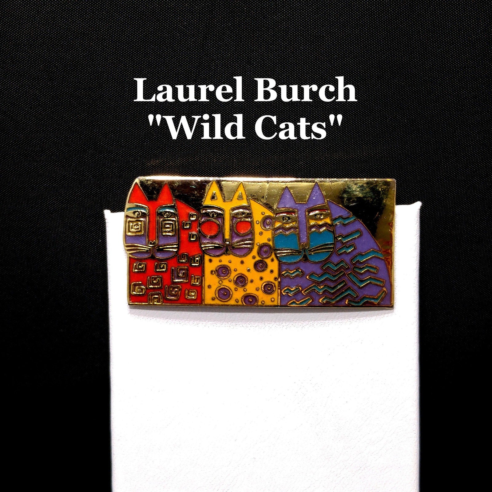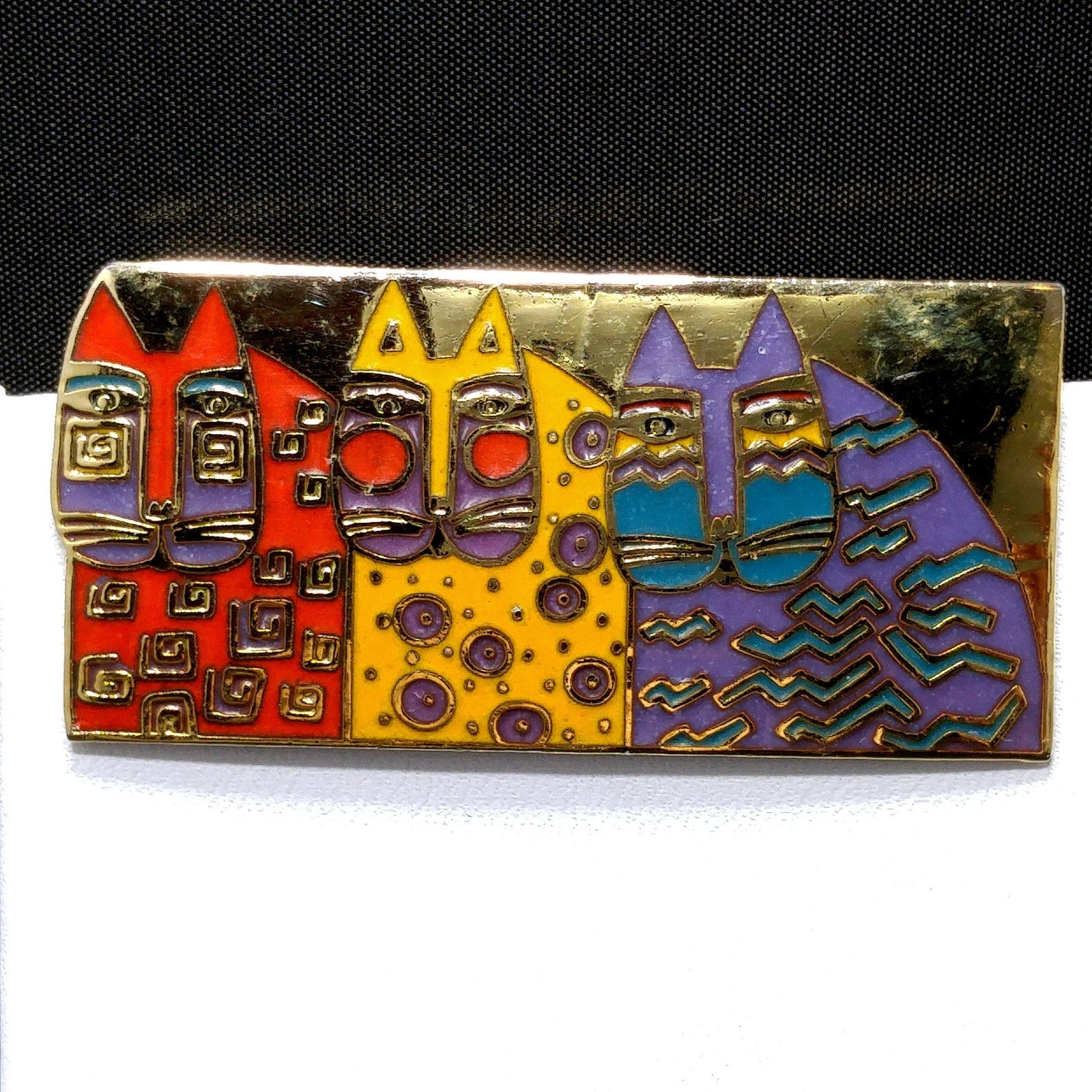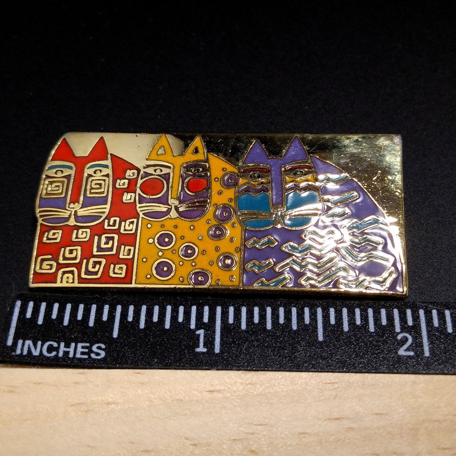 *Description: This is a great Laurel Burch "Wild Cats" cloisonné, gold plated brooch from the 1980s. The near rectangular pin has three enamel cats in red, yellow, and purple on a gold reflective background. Each cat has a unique pattern on its body, contrasting facial colors, and all outlines with gold plated cloisonné technique. This would be a great brooch for the cat or animal lover. It would also be a great addition to your vintage jewelry collection or make a great vintage gift!