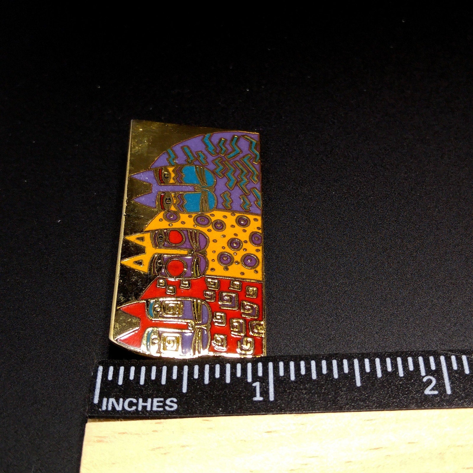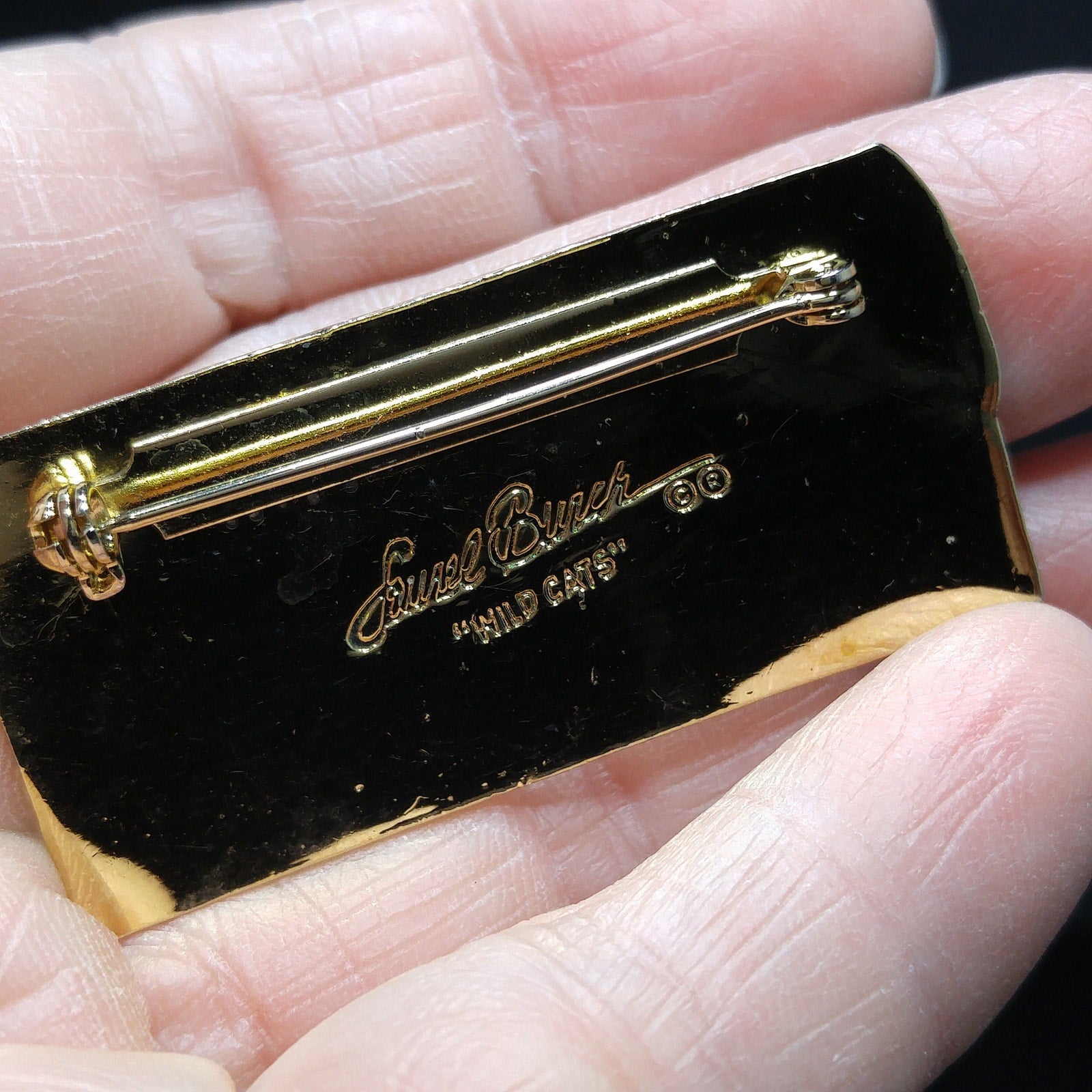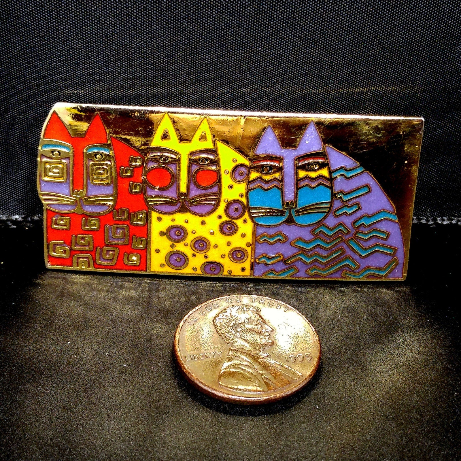 *Description: This is a great Laurel Burch "Wild Cats" cloisonné, gold plated brooch from the 1980s. The near rectangular pin has three enamel cats in red, yellow, and purple on a gold reflective background. Each cat has a unique pattern on its body, contrasting facial colors, and all outlines with gold plated cloisonné technique. This would be a great brooch for the cat or animal lover. It would also be a great addition to your vintage jewelry collection or make a great vintage gift!