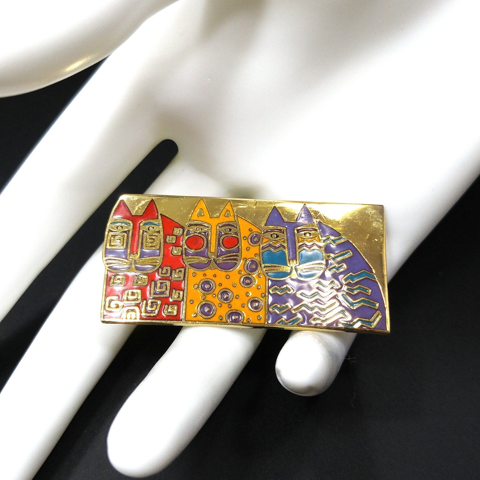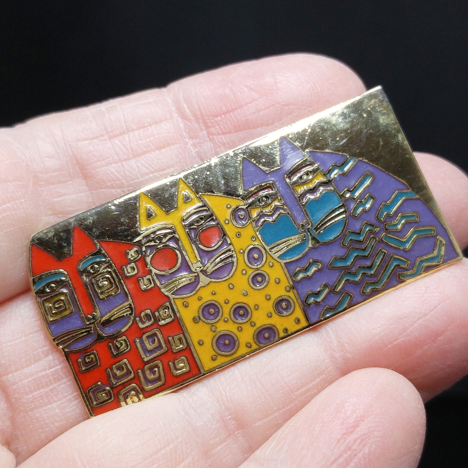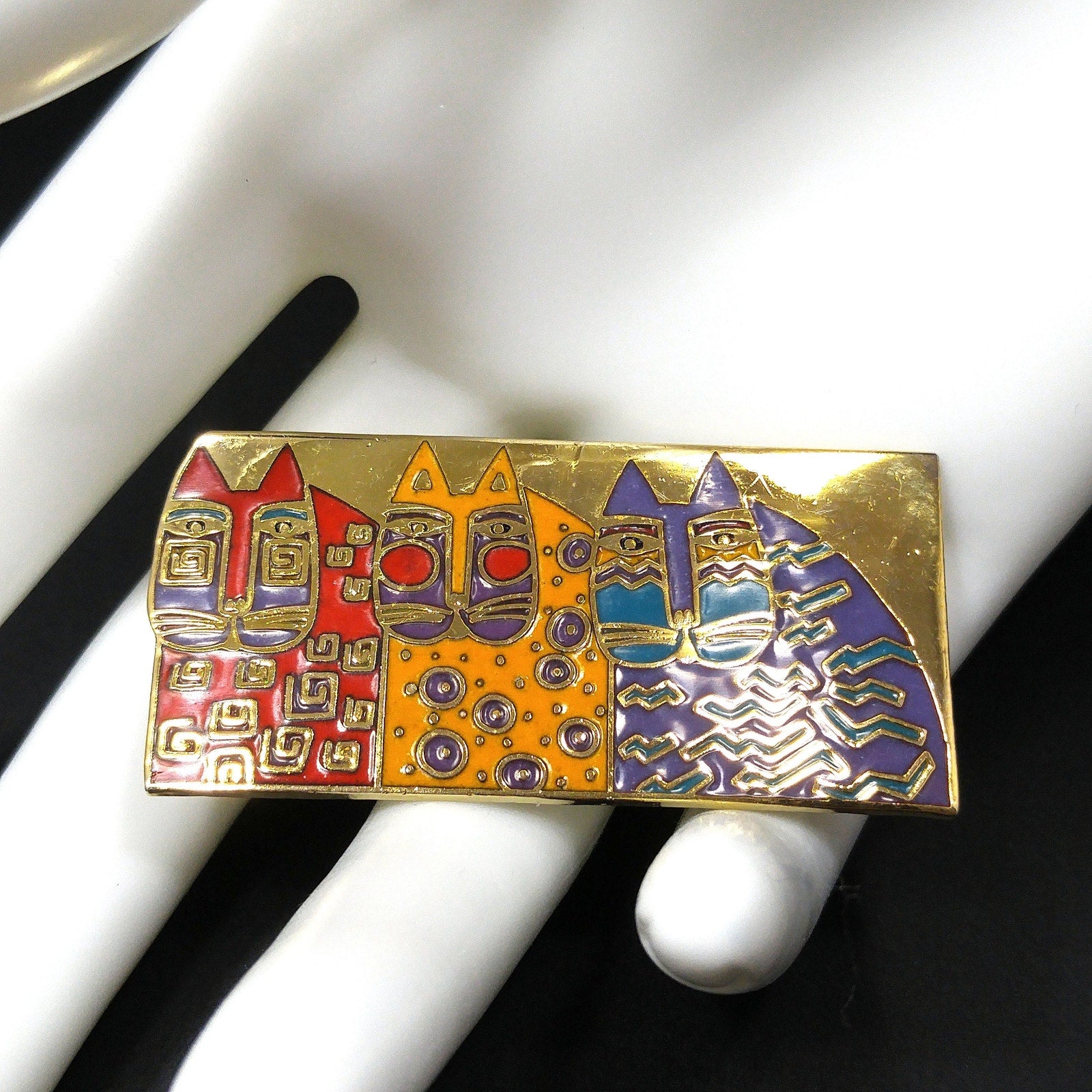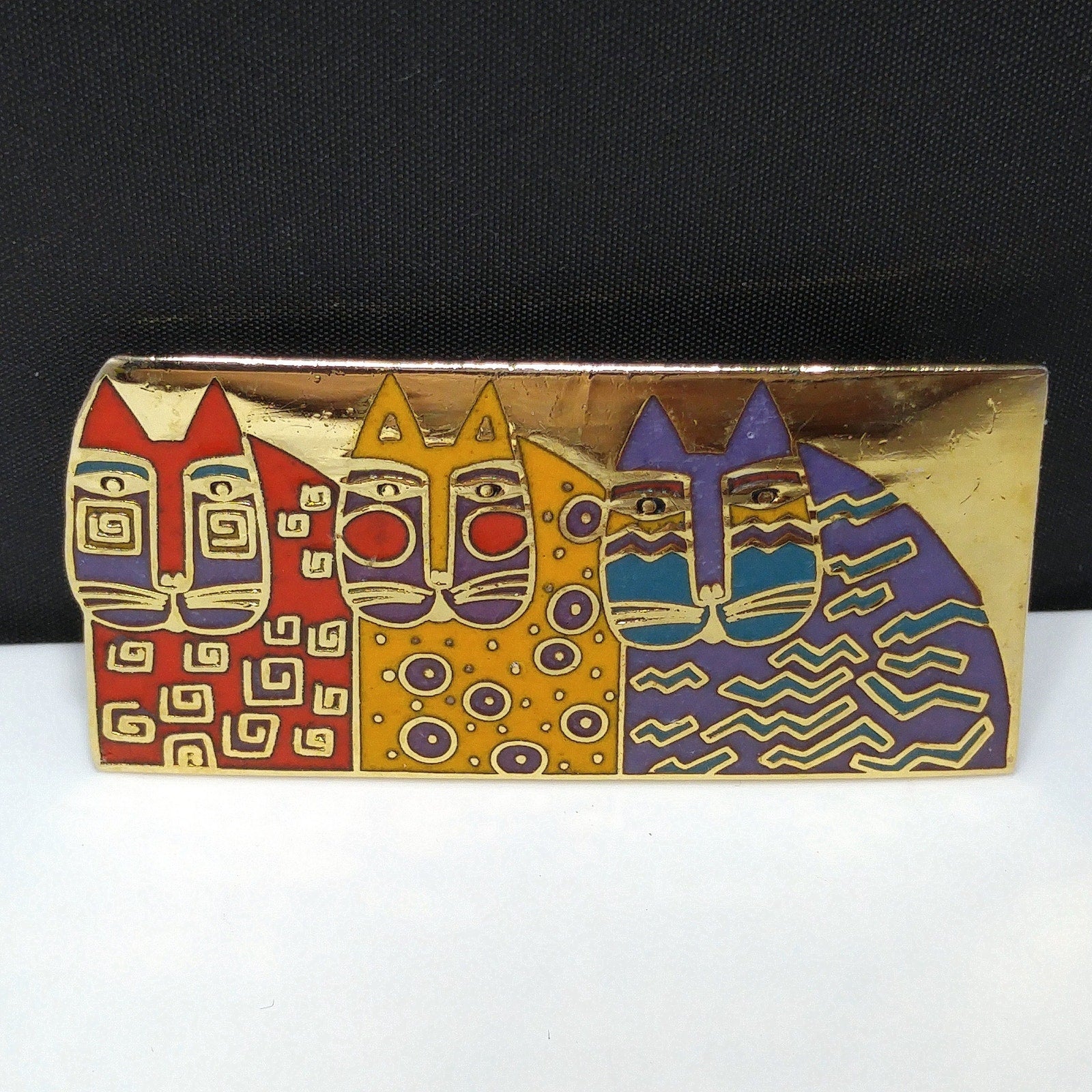 Laurel Burch "Wild Cats" Cloisonné Brooch, Three Cats Pin, 1980s Vintage Jewelry