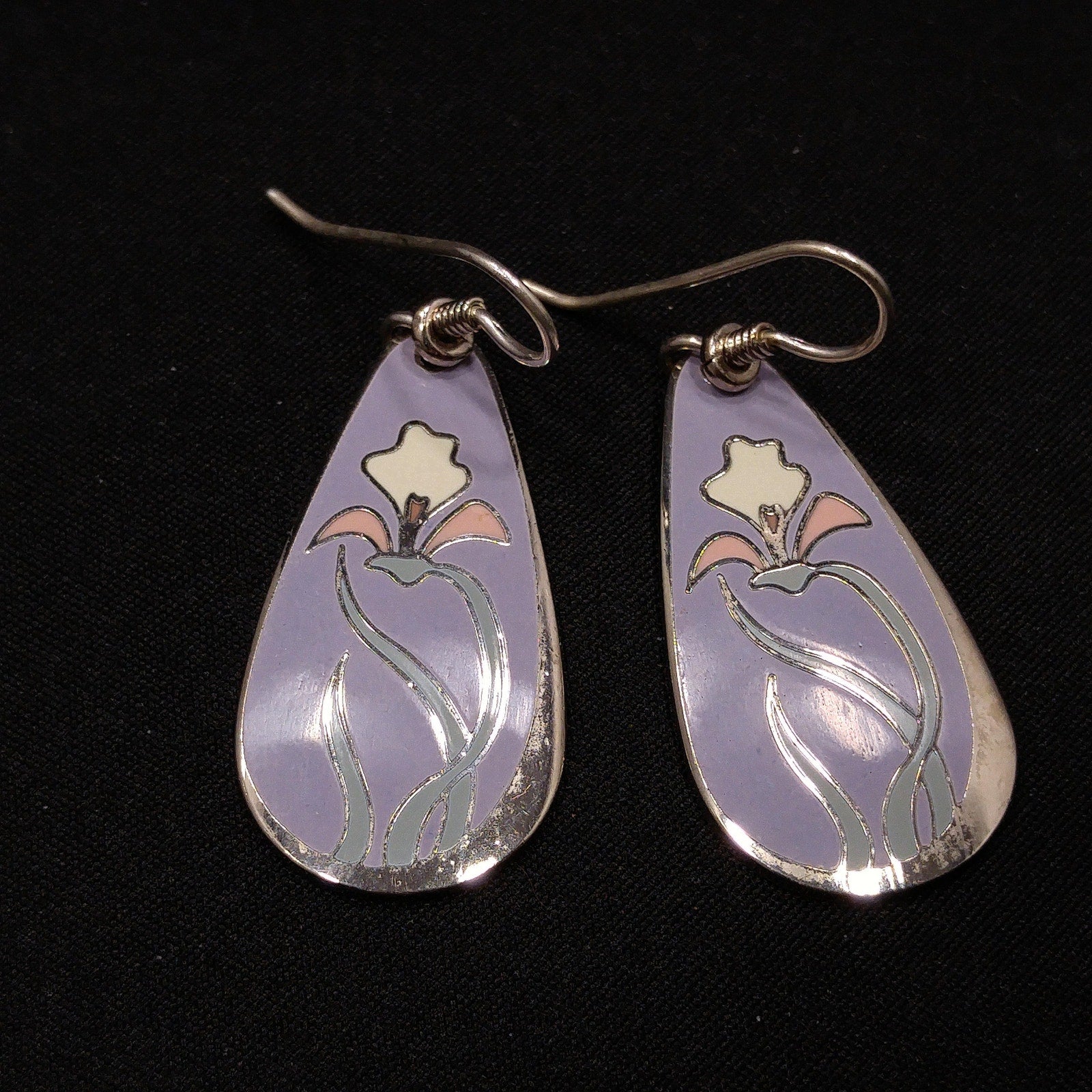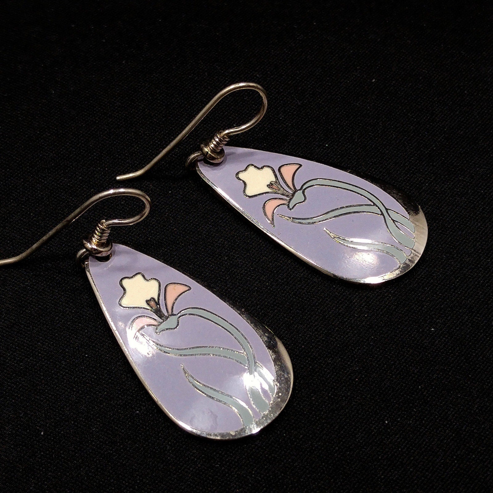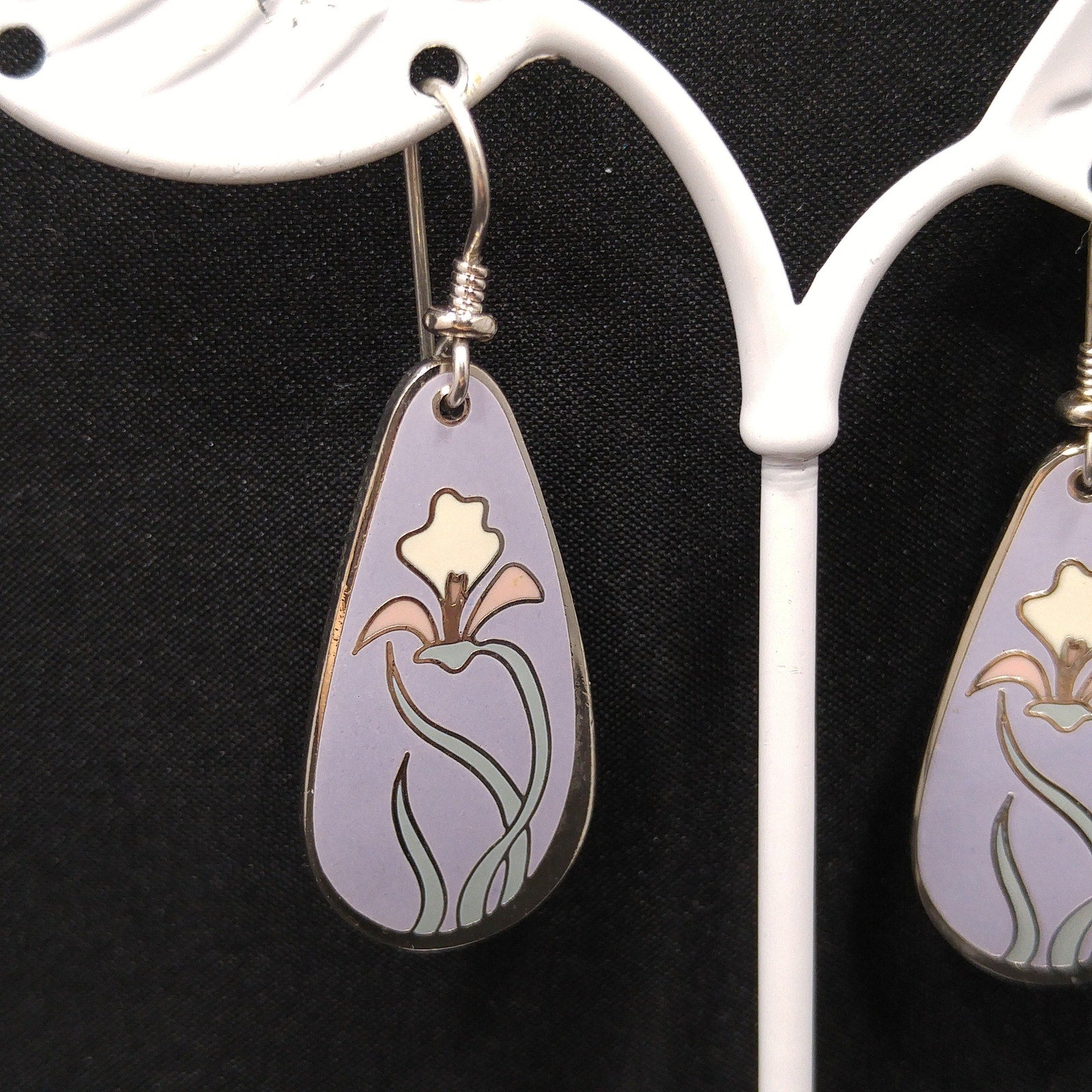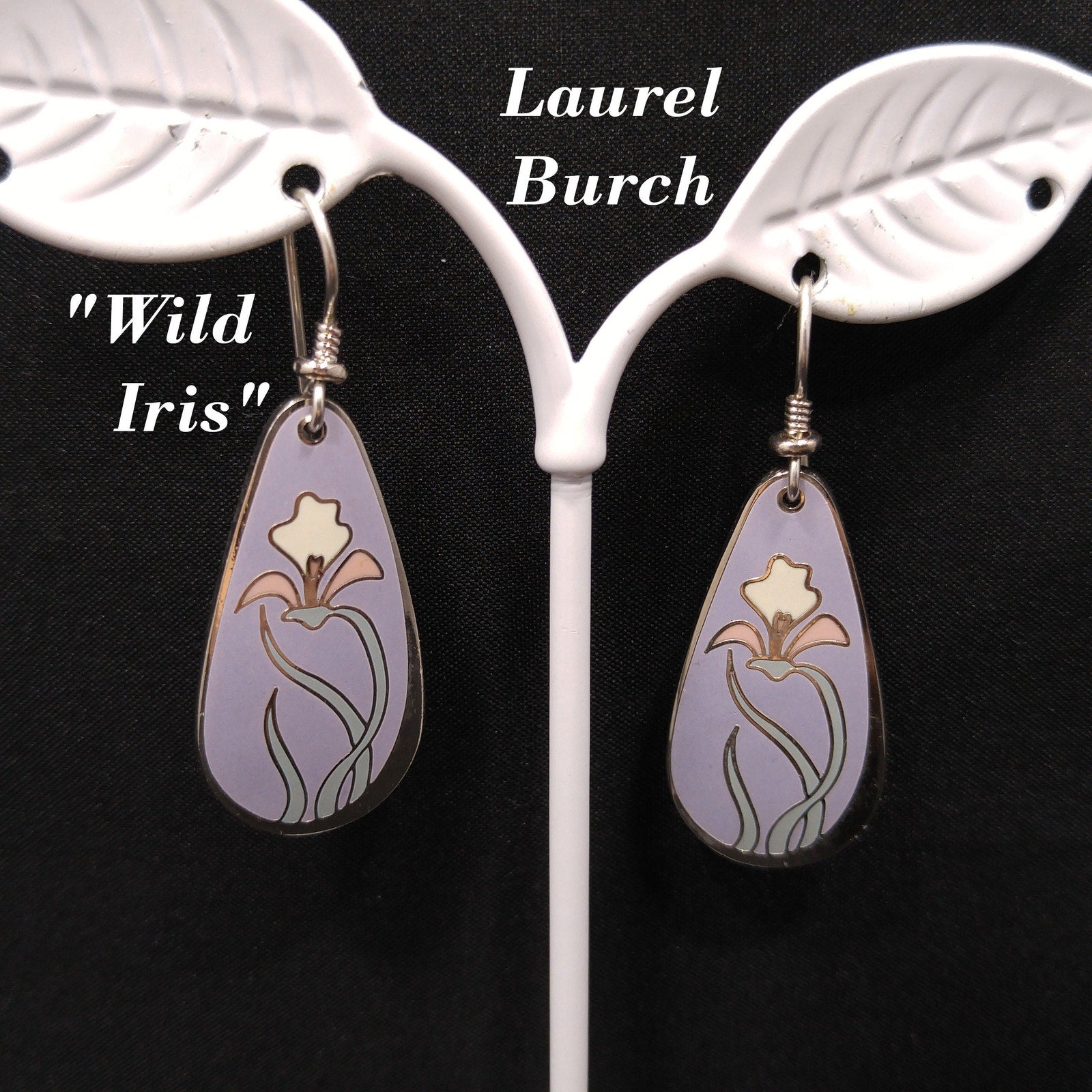 *Description: This is a beautiful pair of "Wild Iris" Laurel Burch earrings from the 1980s. The enamel background is a pretty lavender with rhodium plate cloisonne and a pink and white lily with light mint green leaves. The back is stamped with LAUREL BURCH and "Wild Iris" on both earrings. This would be a great addition to your vintage jewelry collection or make a great vintage gift!