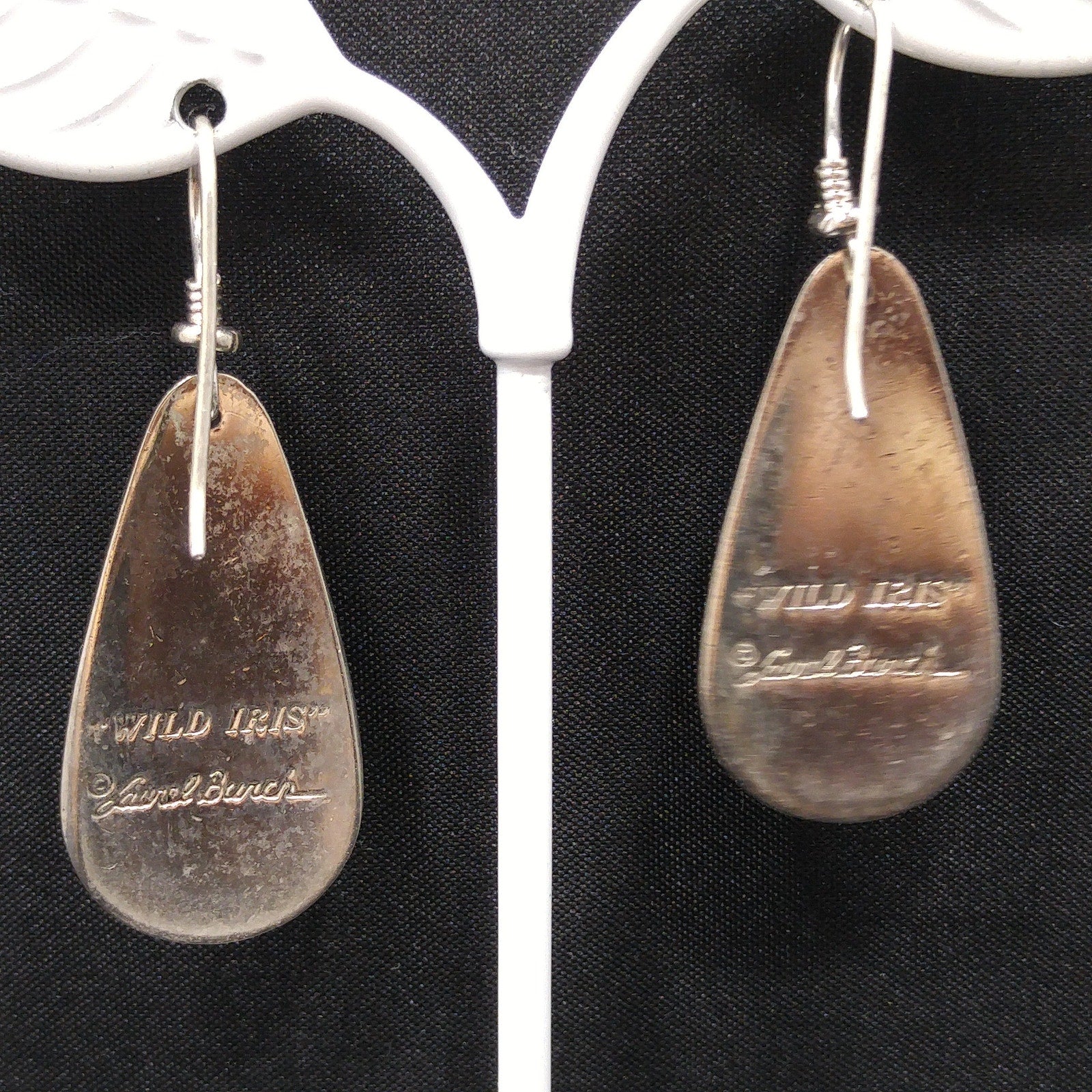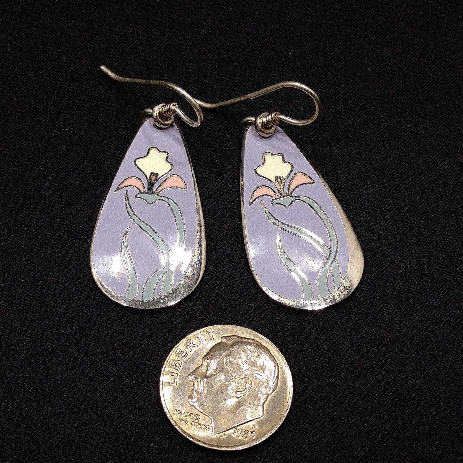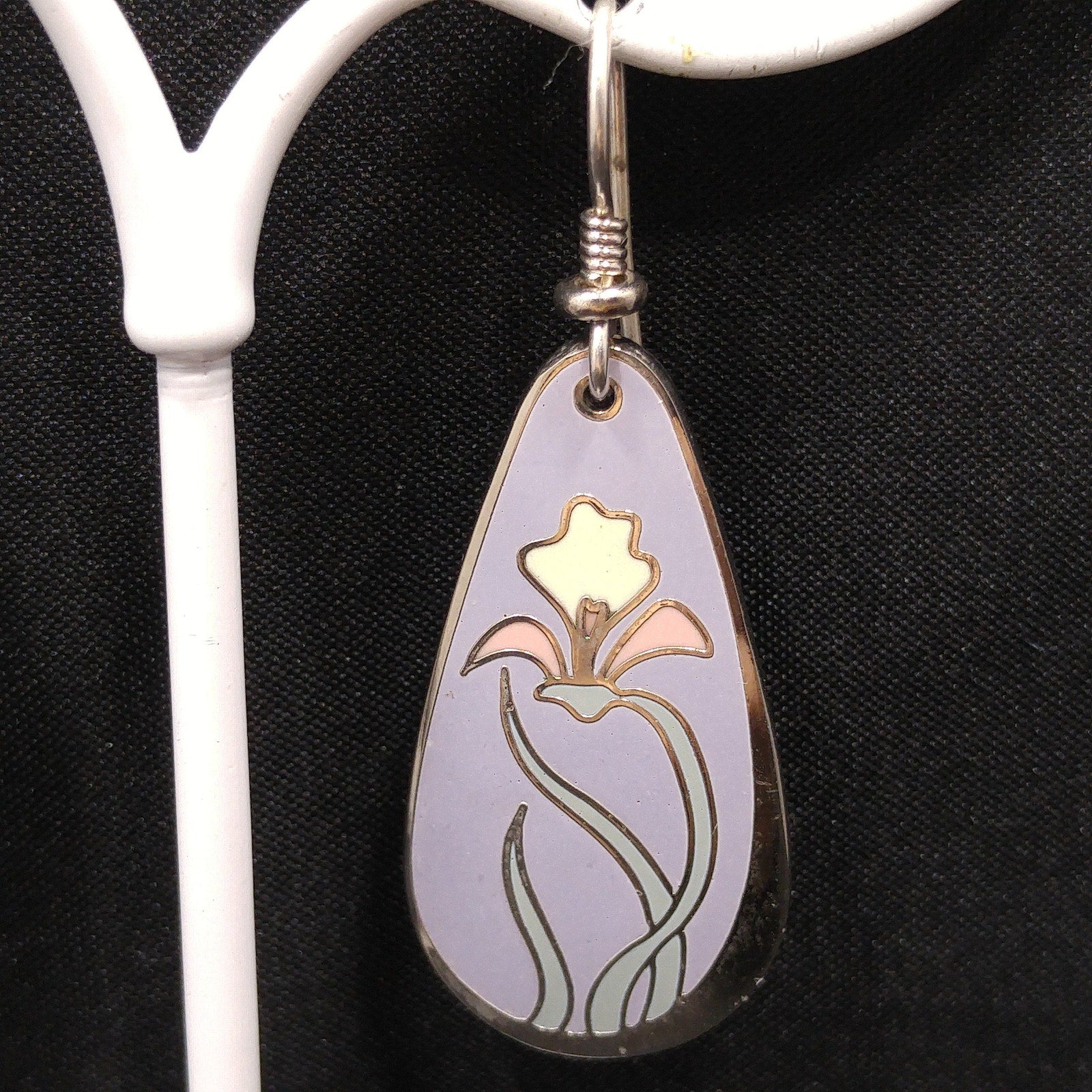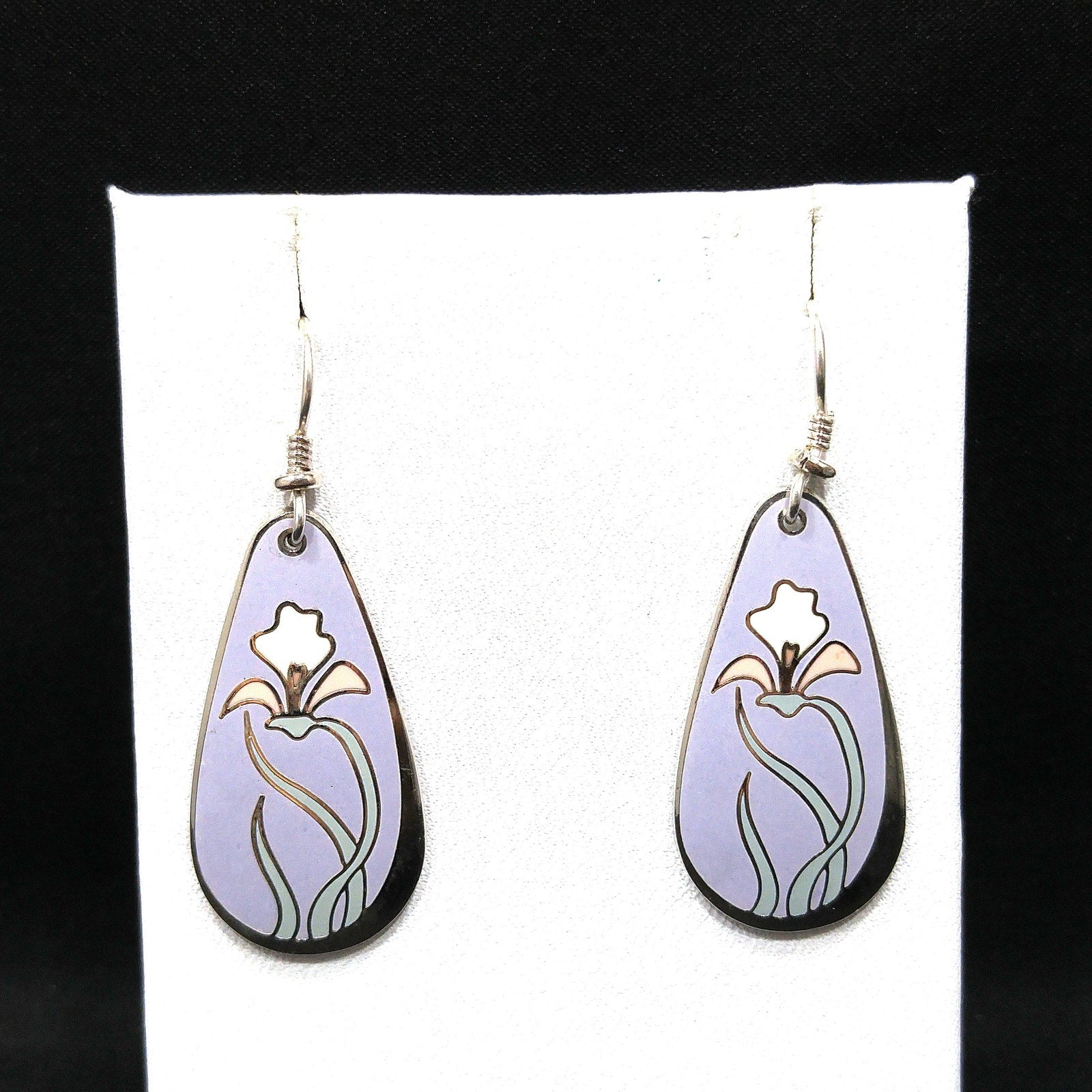 *Description: This is a beautiful pair of "Wild Iris" Laurel Burch earrings from the 1980s. The enamel background is a pretty lavender with rhodium plate cloisonne and a pink and white lily with light mint green leaves. The back is stamped with LAUREL BURCH and "Wild Iris" on both earrings. This would be a great addition to your vintage jewelry collection or make a great vintage gift!