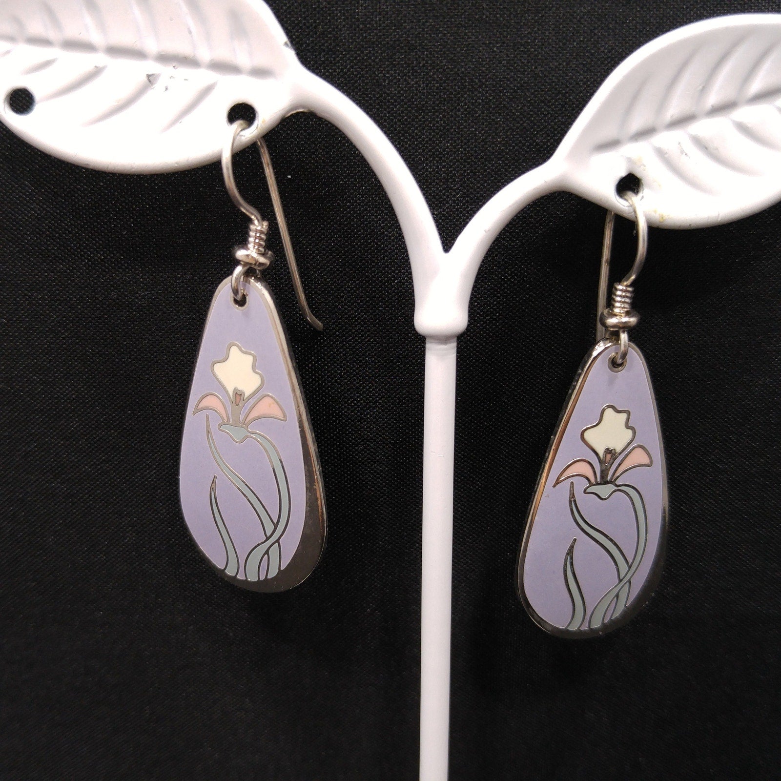 Laurel Burch "Wild Iris" Cloisonne Earrings, Lavender Enamel, White & Pink Flower, Rhodium Plate, 1980s Vintage Jewelry