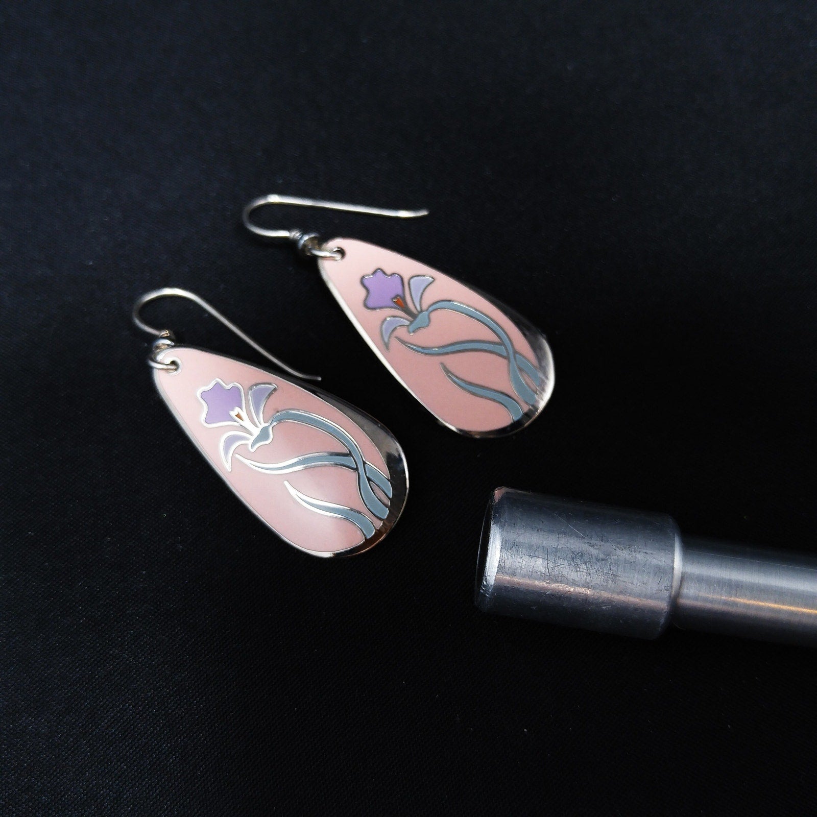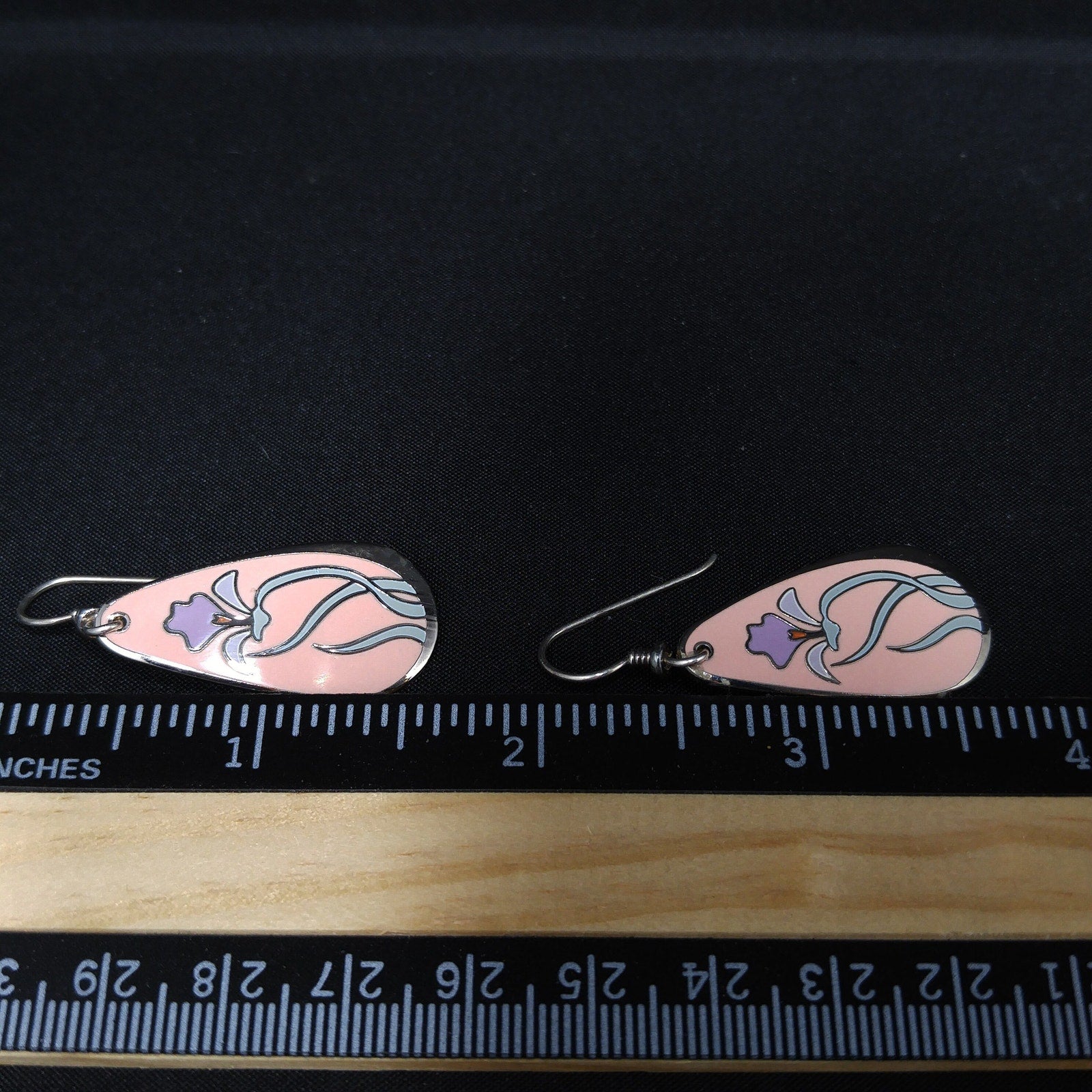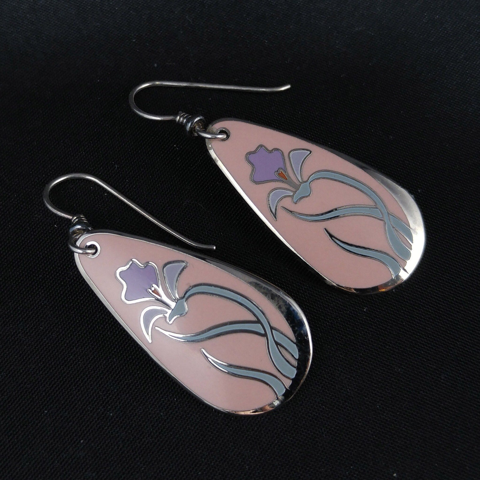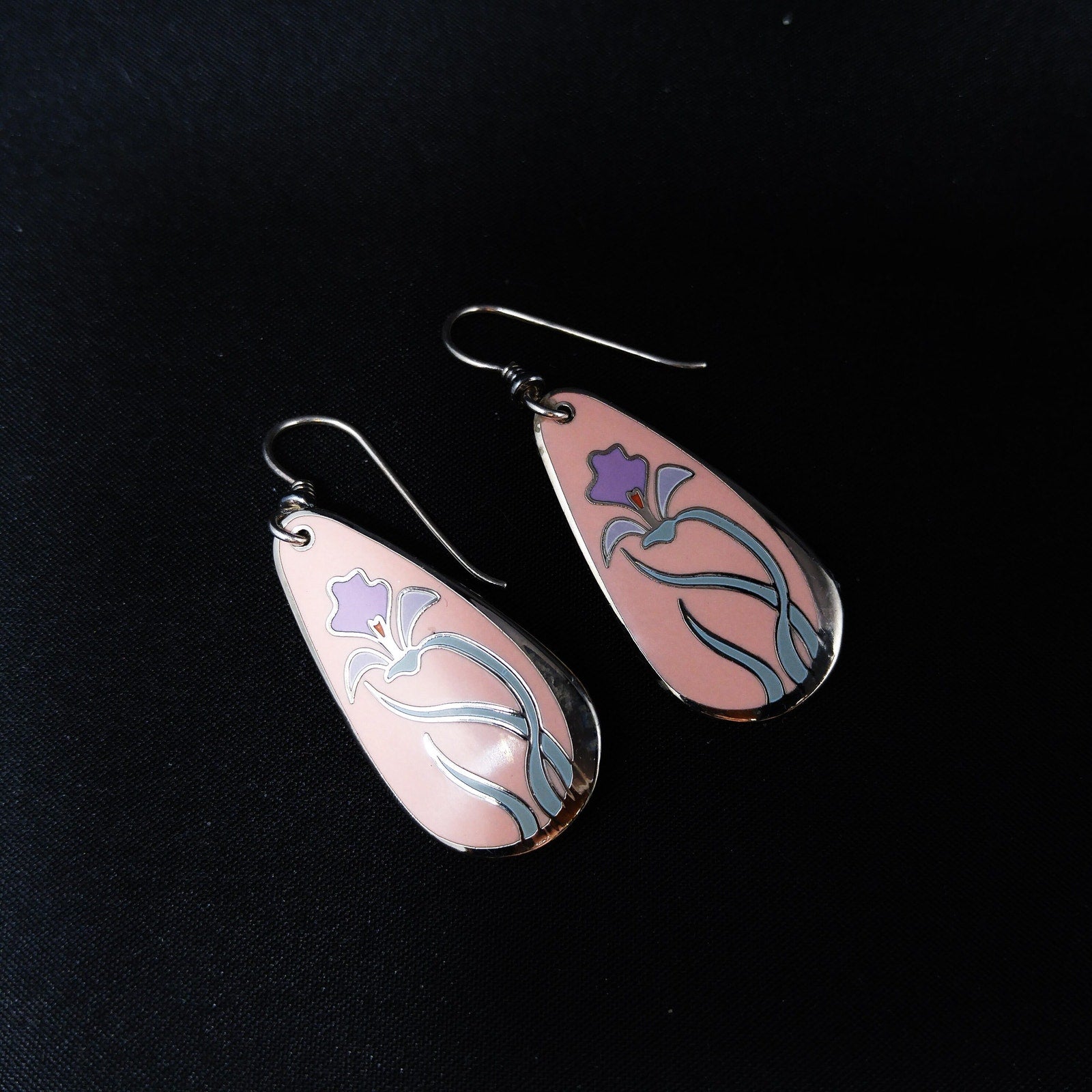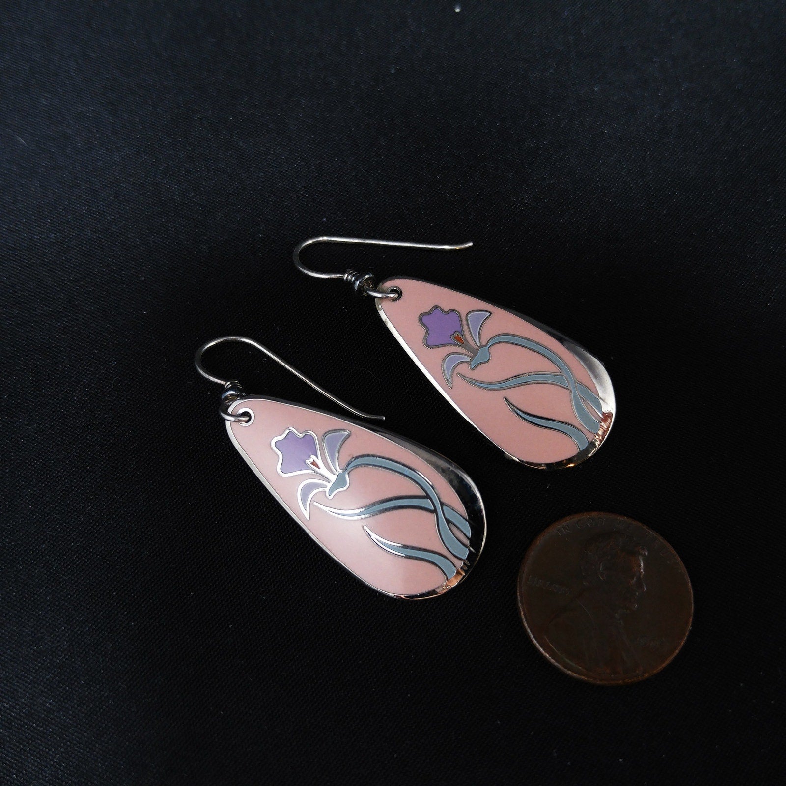 *Description: This is a beautiful pair of "Wild Iris" Laurel Burch earrings from the 1980s. The background is a pretty pink cloisonne enamel and a lavender lily with light moss green leaves. The back is stamped with LAUREL BURCH and "Wild Iris" on both earrings. These earrings would make a great gift or a wonderful pair to add to your Laurel Burch vintage collection.