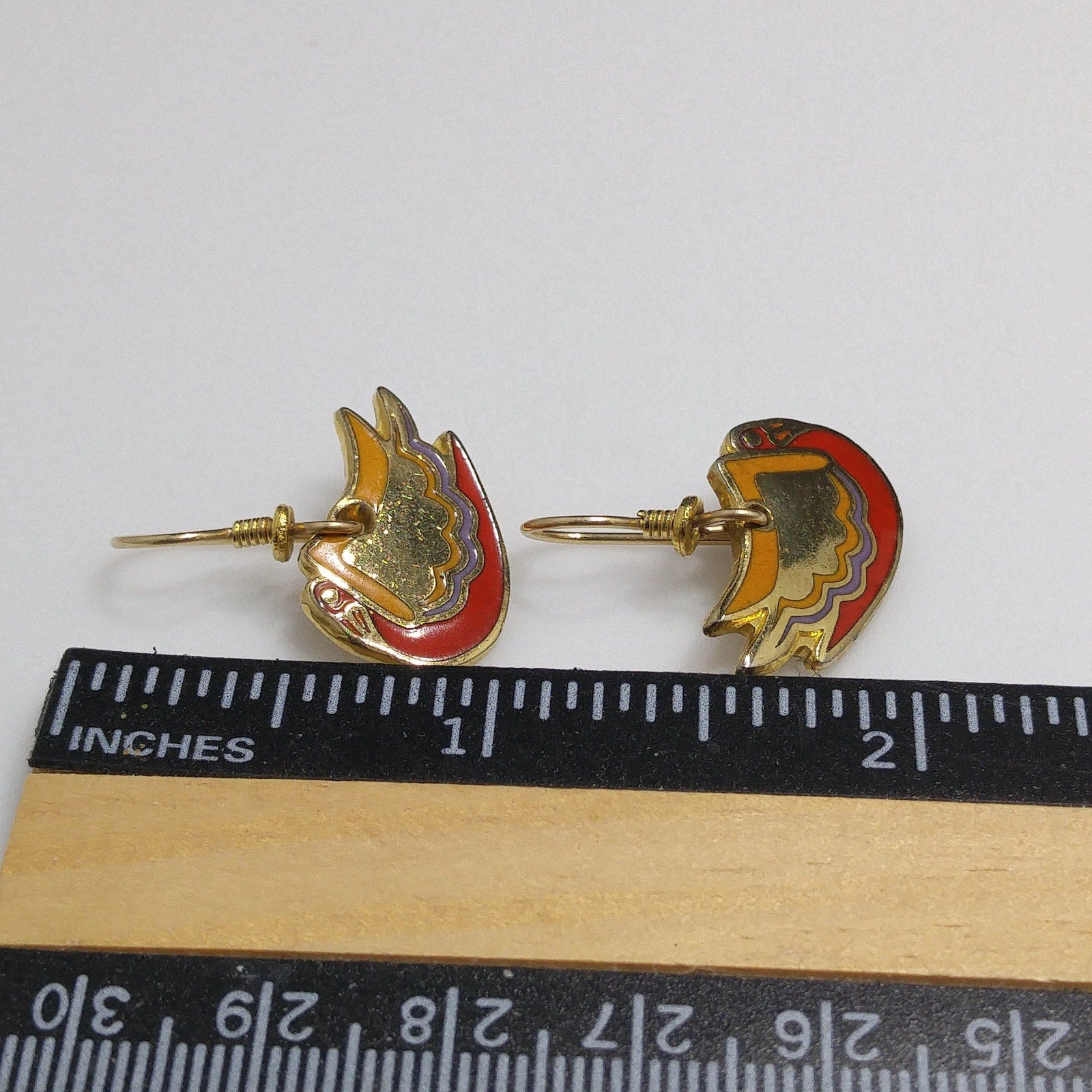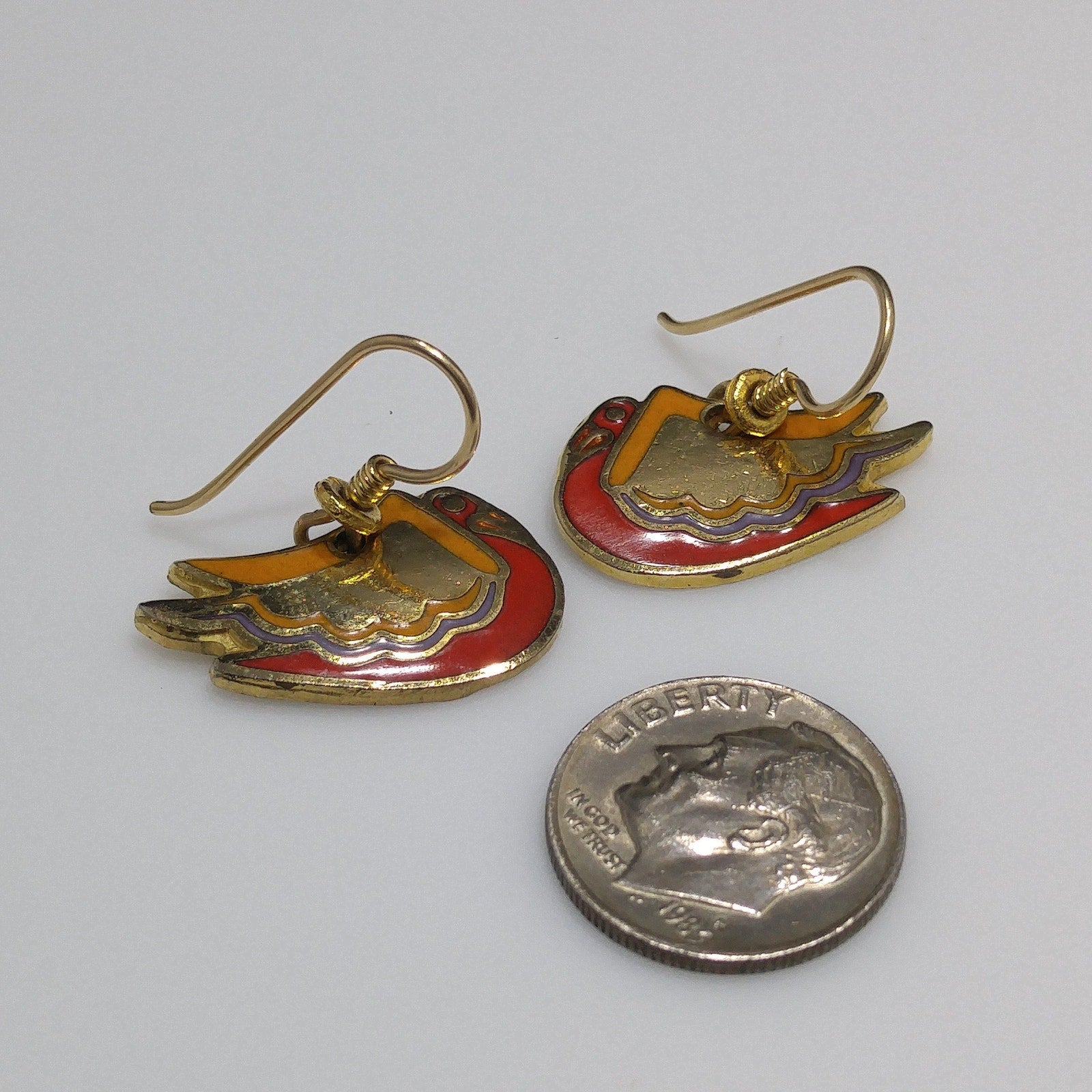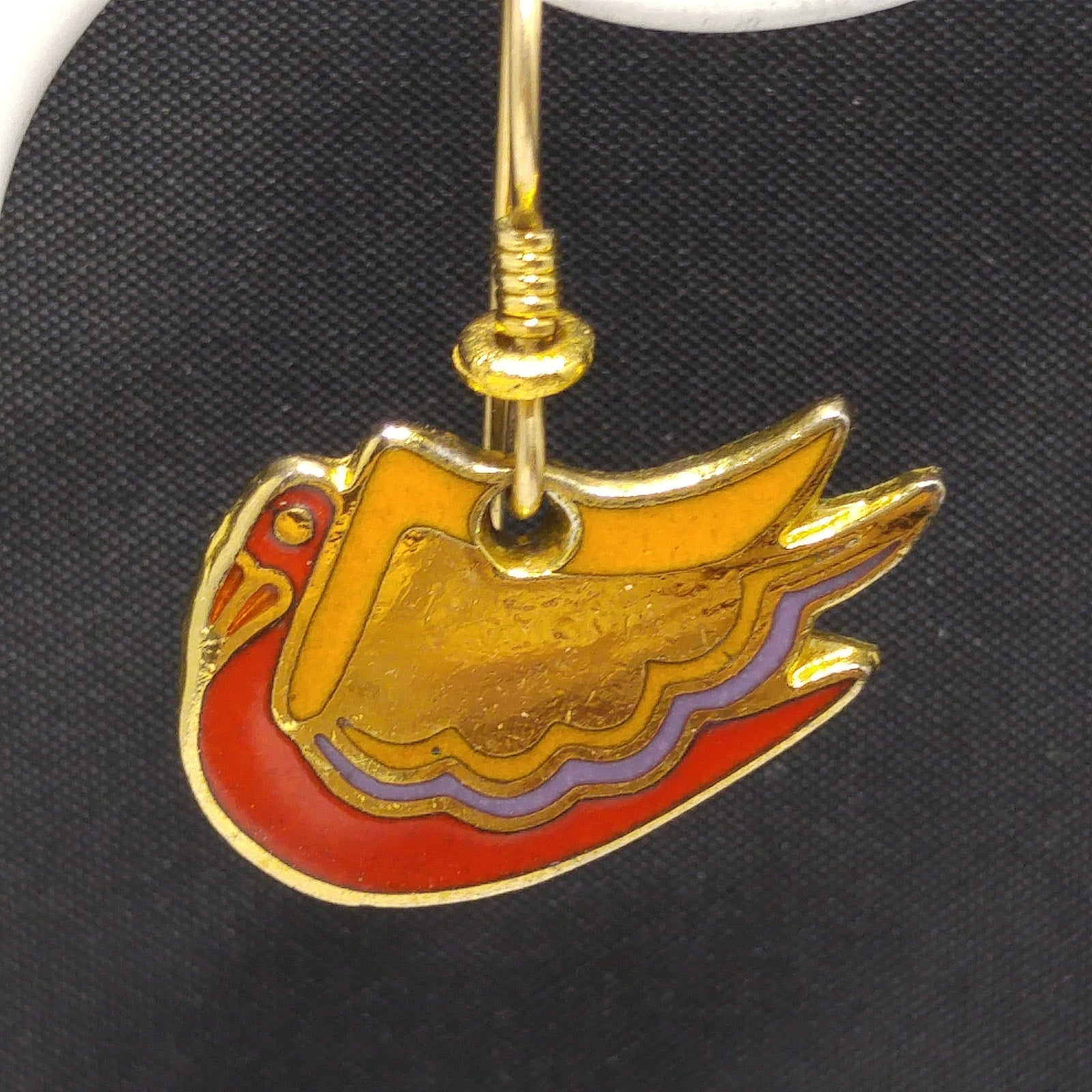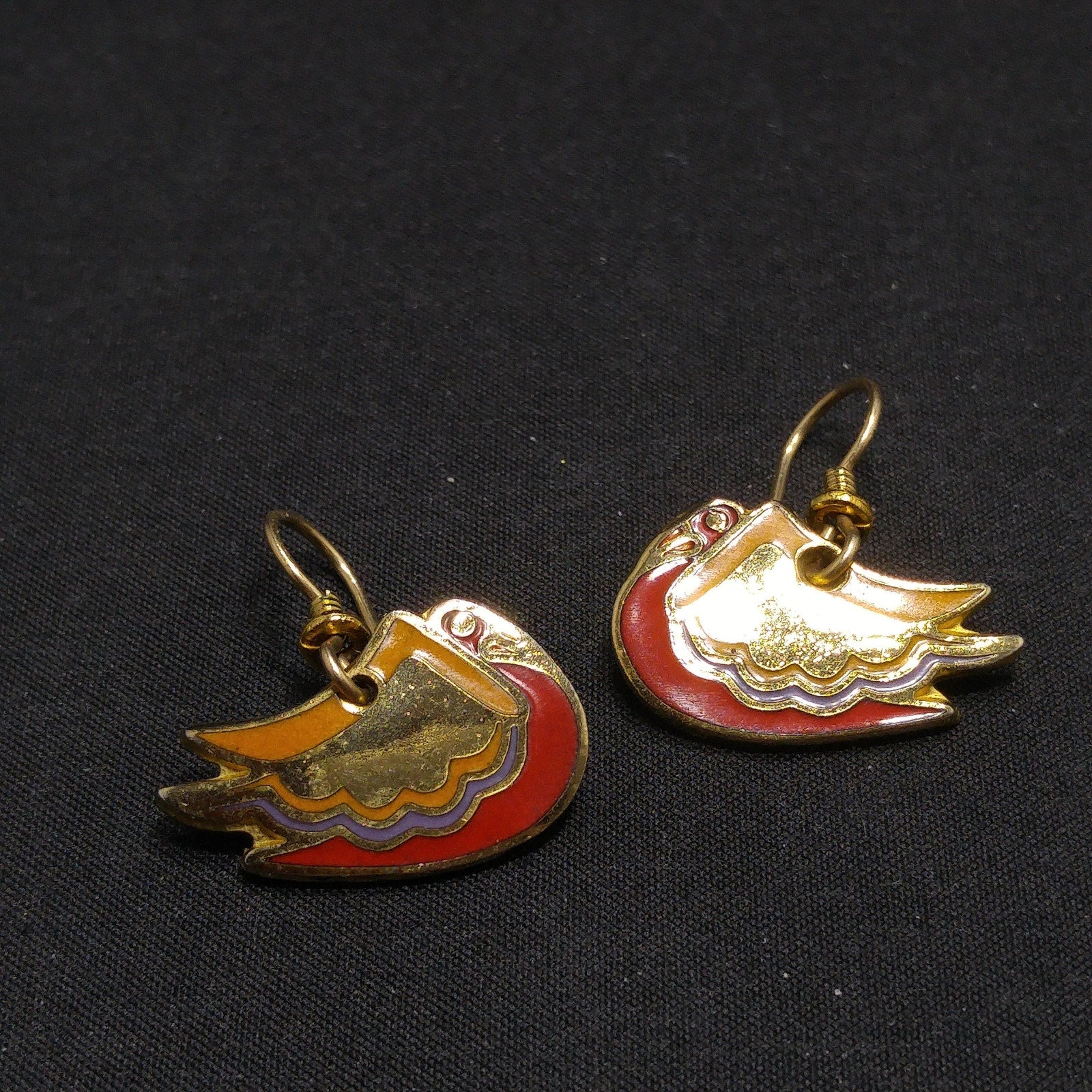 *Description: This is a beautiful pair of bird earrings entitled WILD SWAN by Laurel Burch from the 1980s. The gold plated bird has painted enamel in red lavender and yellow trimmed in gold using the cloisonne technique. They would make a great pair of Laurel Burch earring to add to your collection or be a great gift for a bird or animal lover.