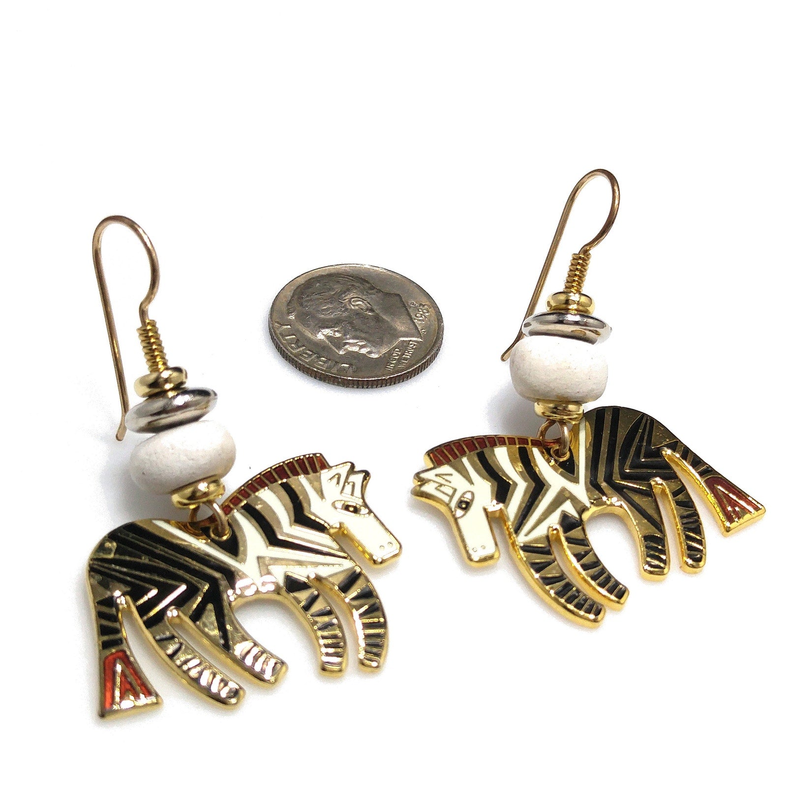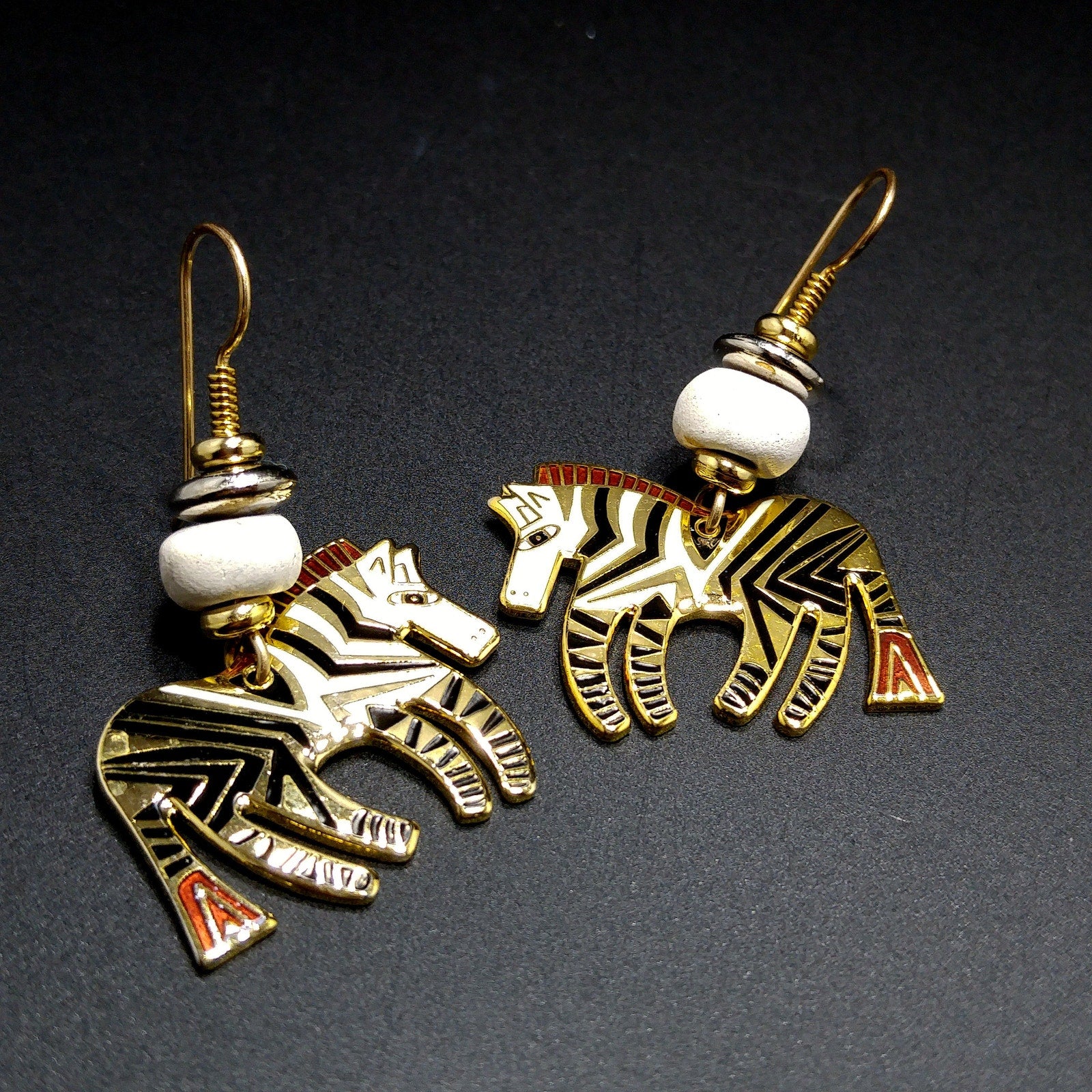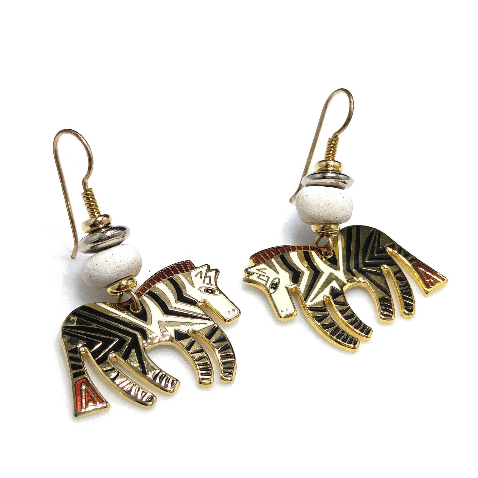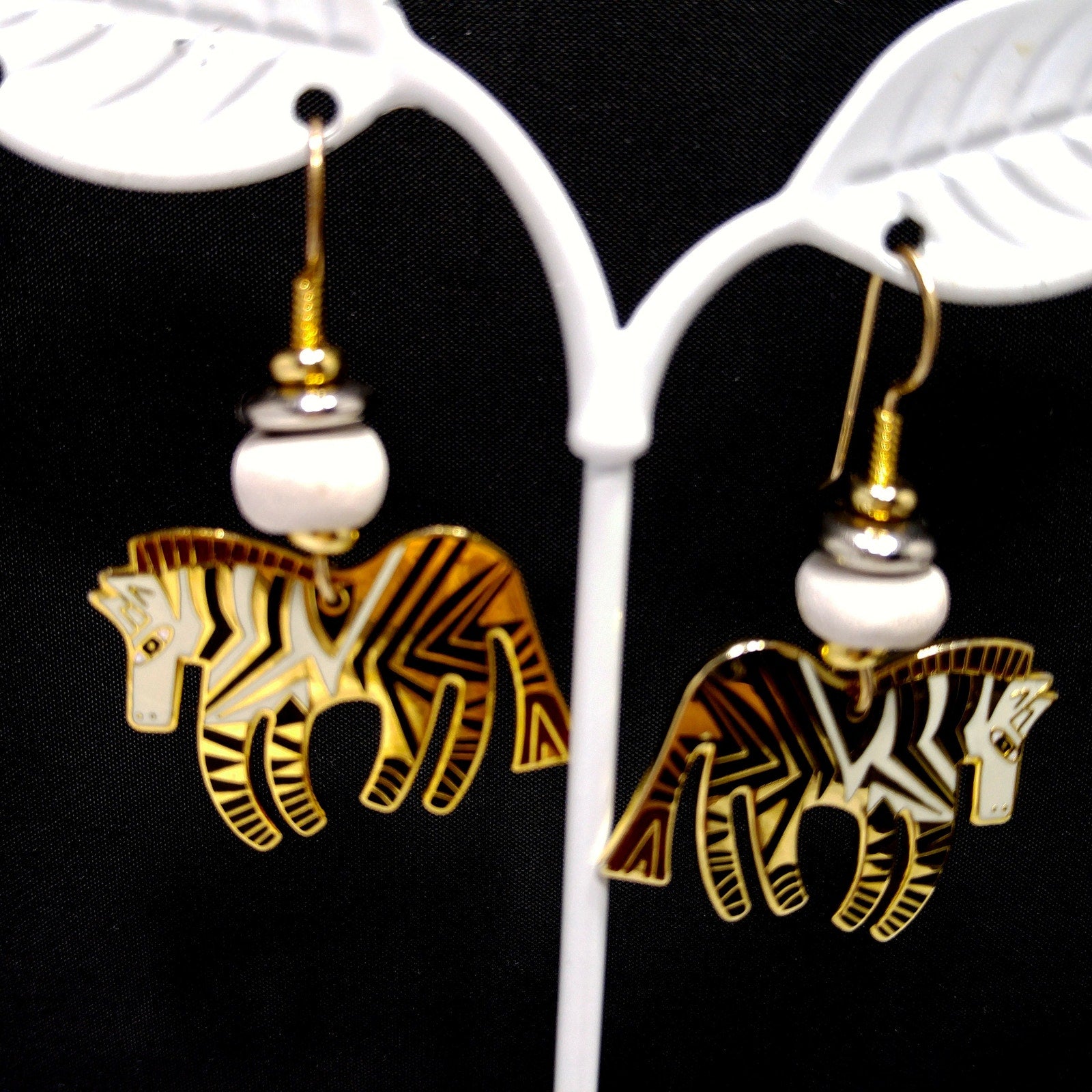 *Description: This is a beautiful pair of vintage earrings in the WILD ZEBRA design by Laurel Burch. They are gold plated using the cloisonne design with enamel in white, and black. The earrings have gold filled ear wires. There is a white wooden bead on each earring. They are in great condition.