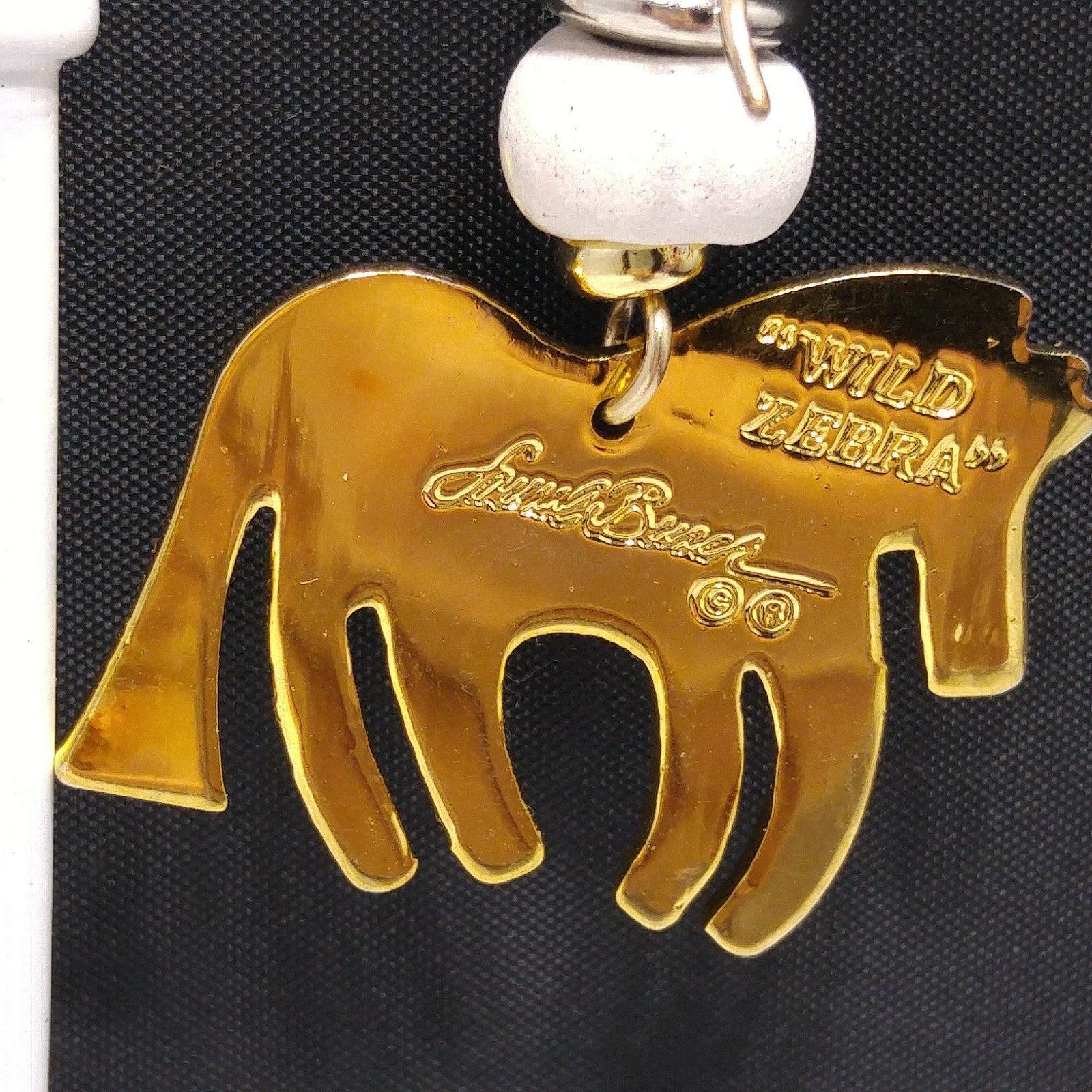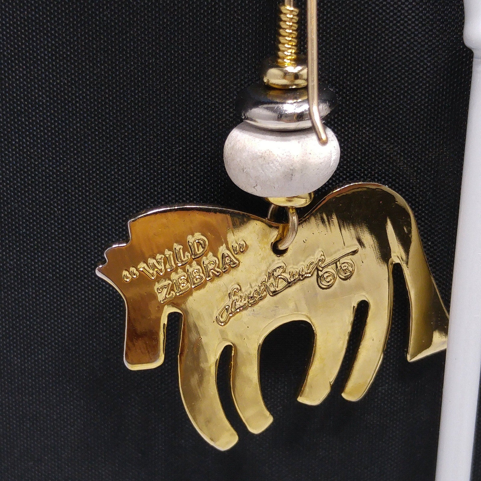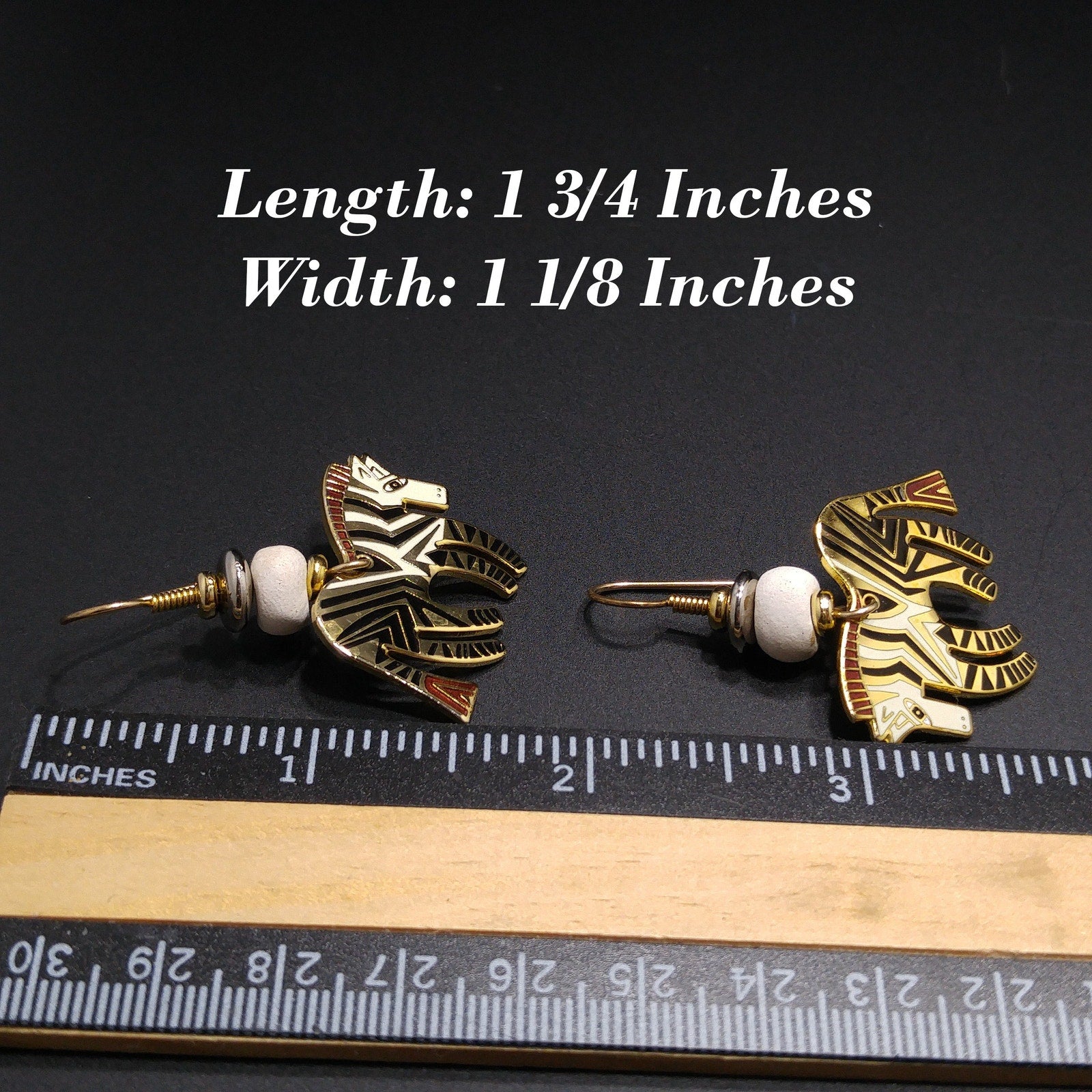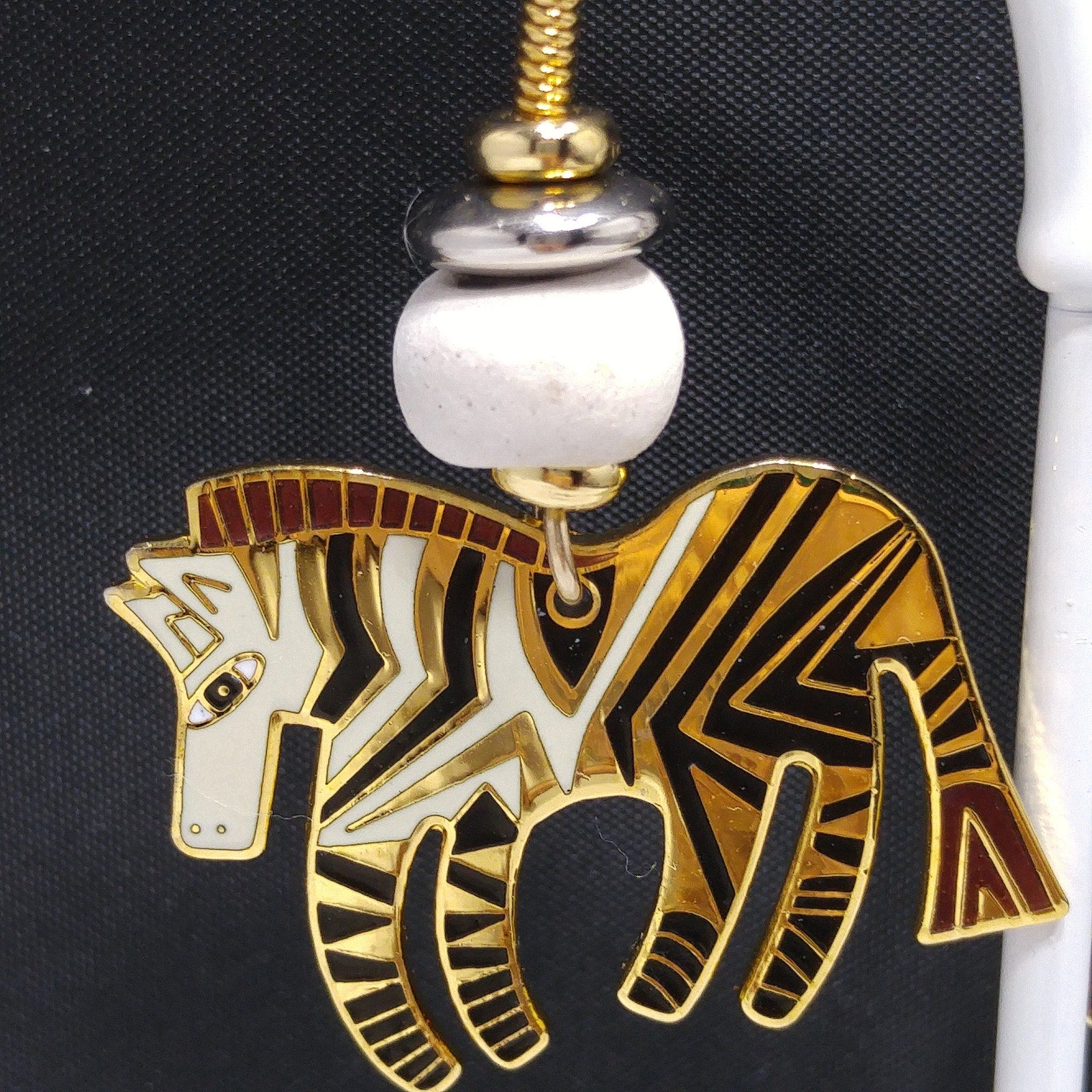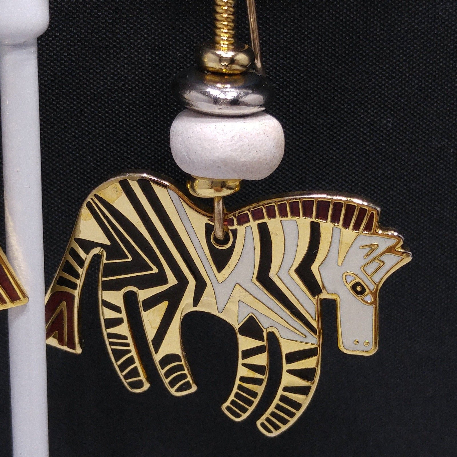 *Description: This is a beautiful pair of vintage earrings in the WILD ZEBRA design by Laurel Burch. They are gold plated using the cloisonne design with enamel in white, and black. The earrings have gold filled ear wires. There is a white wooden bead on each earring. They are in great condition.