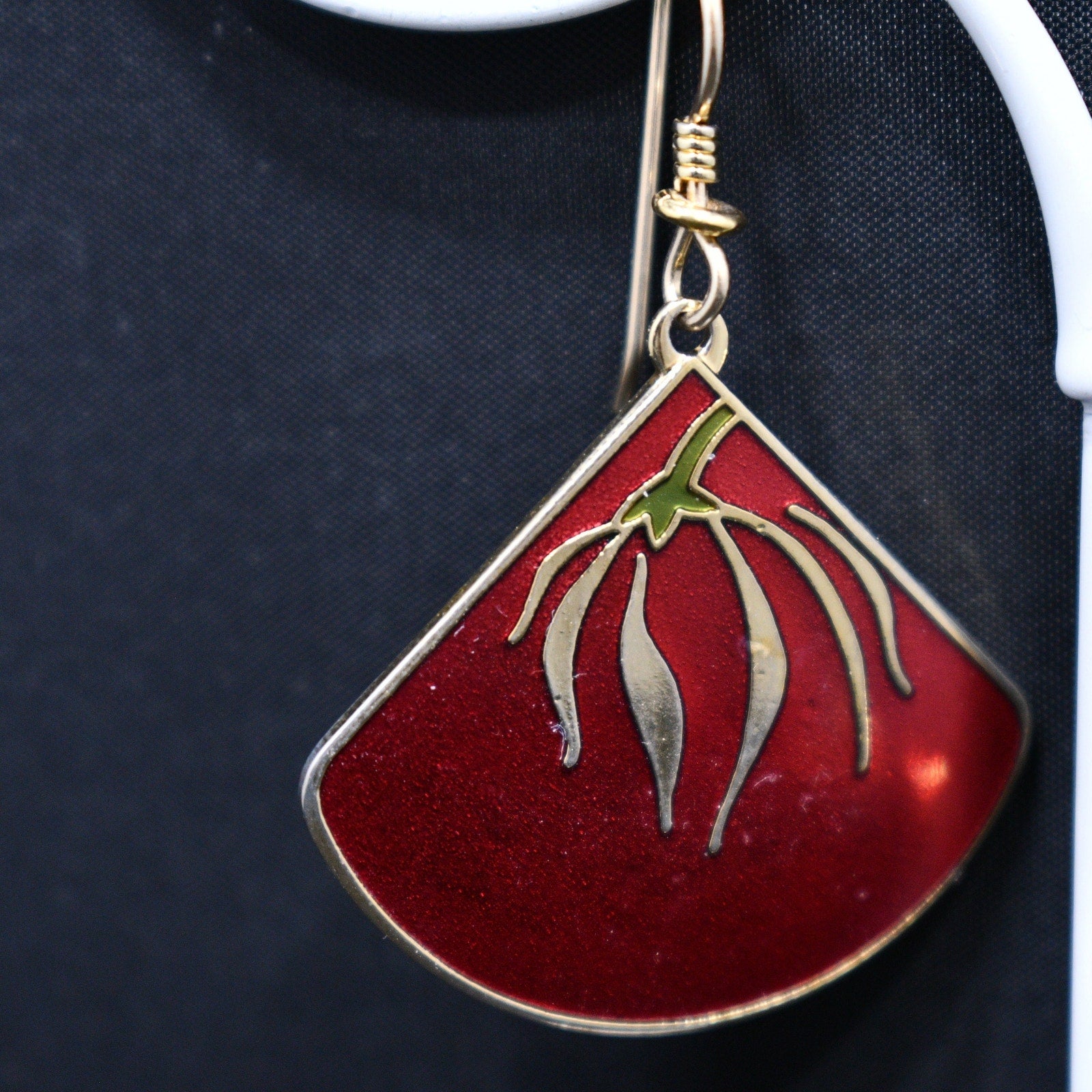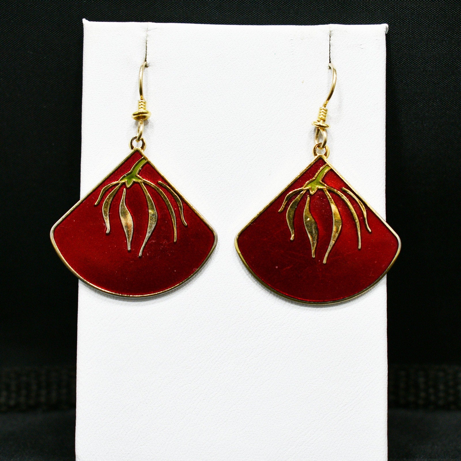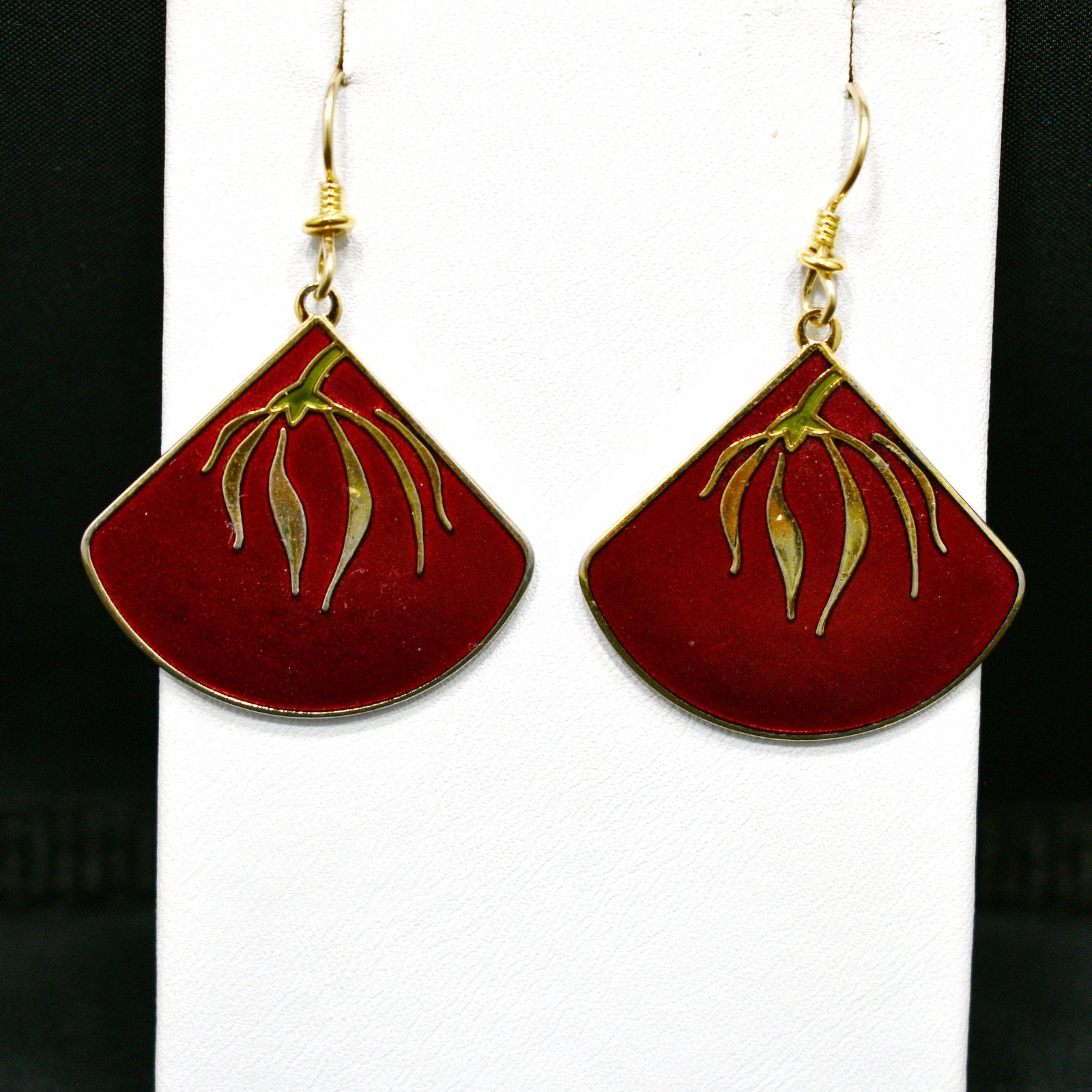*Description: This is a beautiful pair of floral cloisonne and red enamel Laurel Burch earrings from the 1980s. The delicate floral design is gold with a touch of green enamel near the top on the flower stem. The background is red enamel trimmed in gold plating. The earrings are stamped LAUREL BURCH and "Willow Fan". The ear wires are gold filled. This would be a great addition to your vintage jewelry collection or make a great vintage gift!