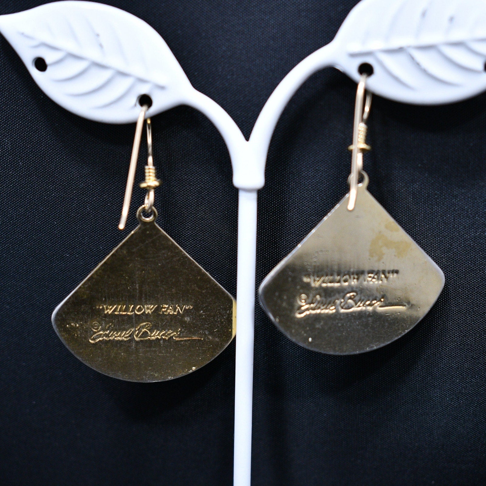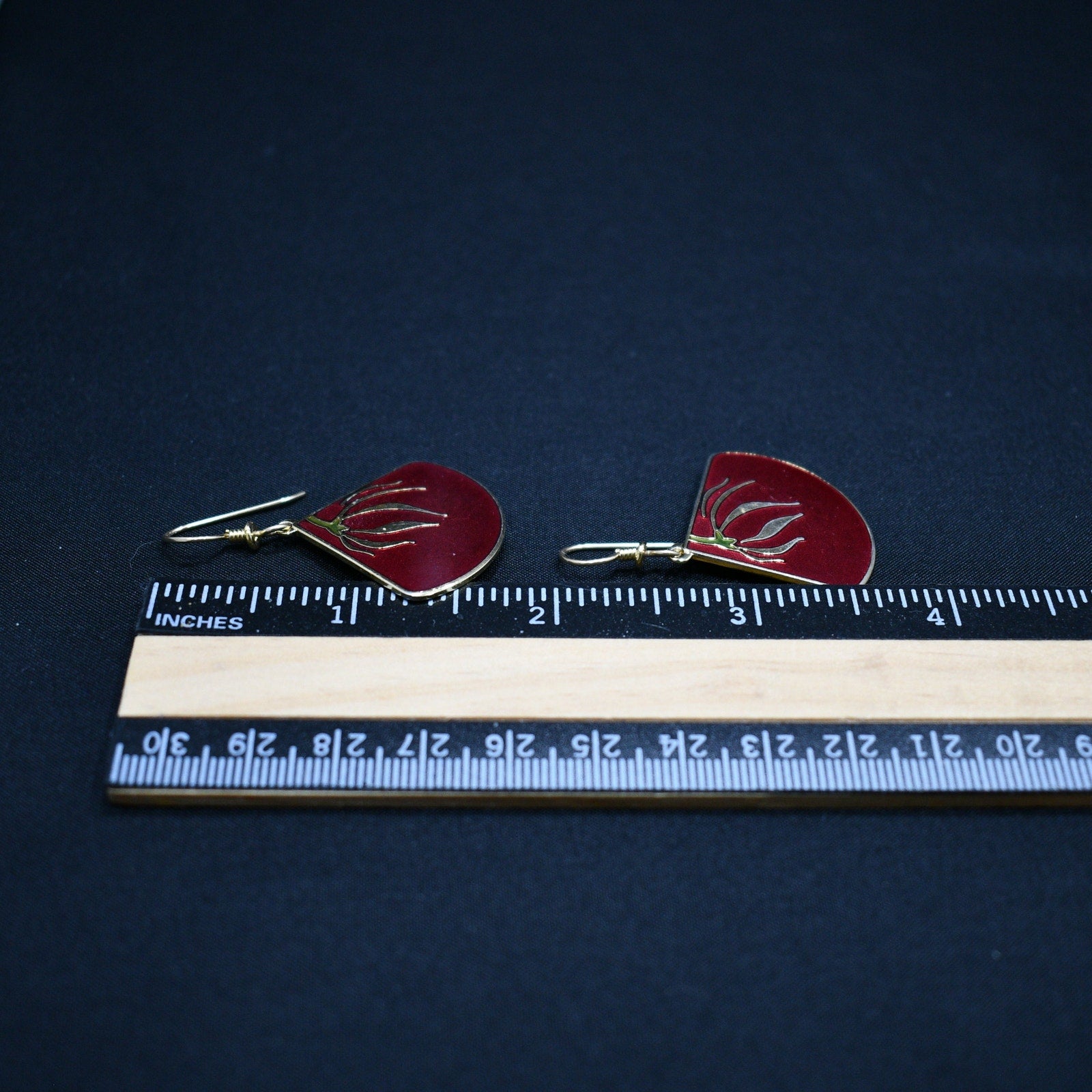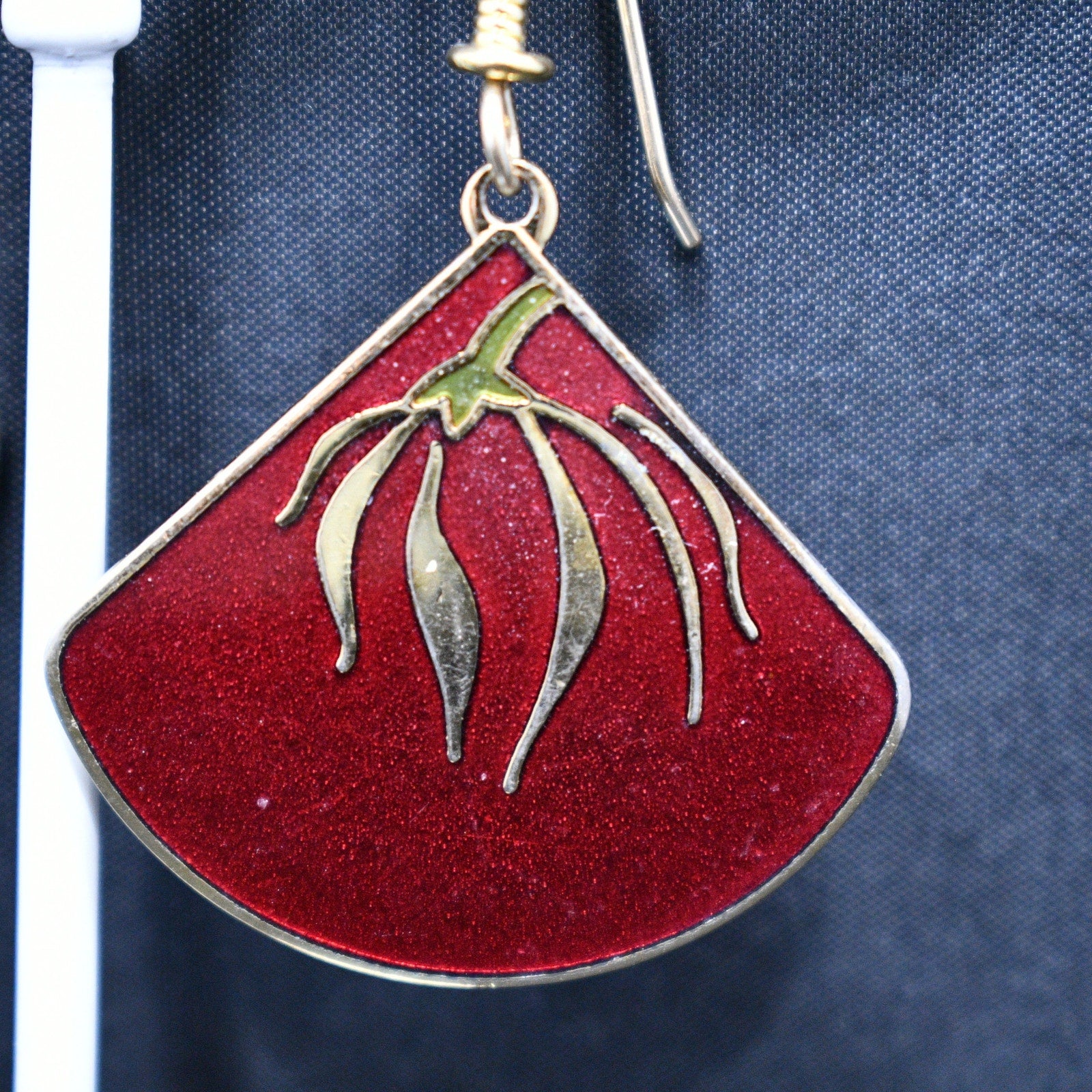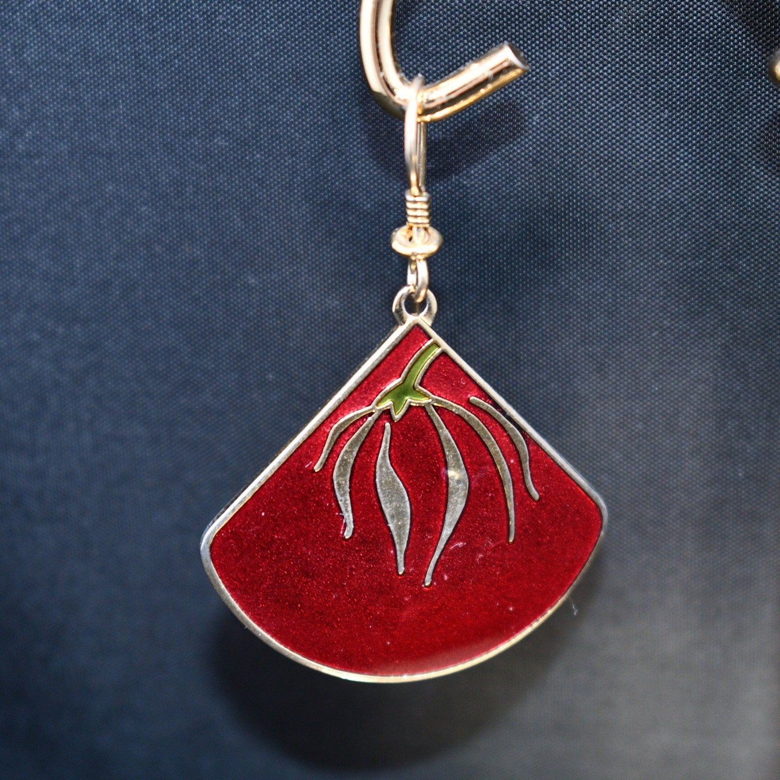 *Description: This is a beautiful pair of floral cloisonne and red enamel Laurel Burch earrings from the 1980s. The delicate floral design is gold with a touch of green enamel near the top on the flower stem. The background is red enamel trimmed in gold plating. The earrings are stamped LAUREL BURCH and "Willow Fan". The ear wires are gold filled. This would be a great addition to your vintage jewelry collection or make a great vintage gift!
