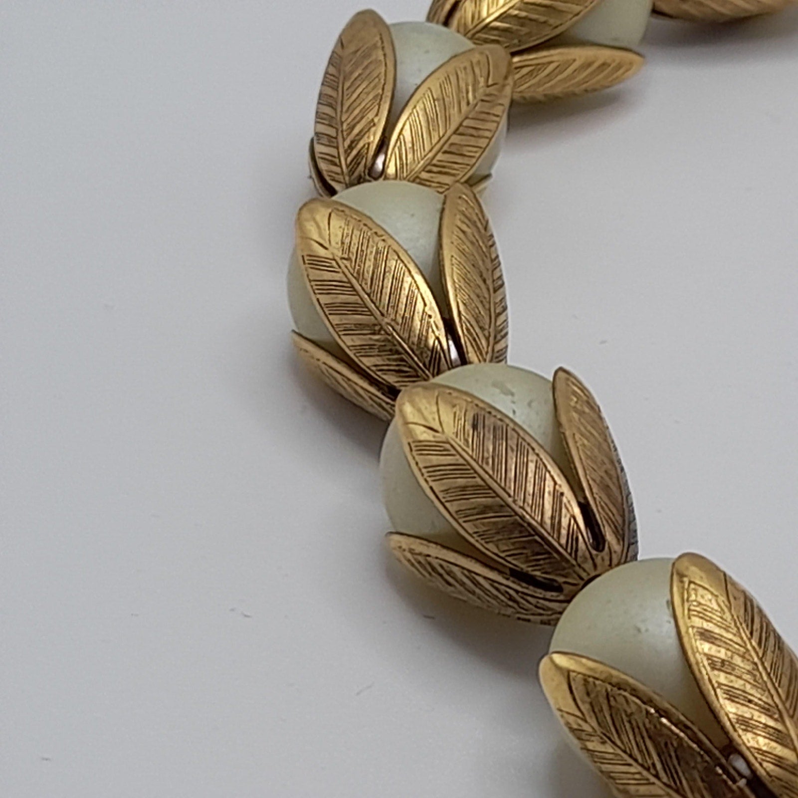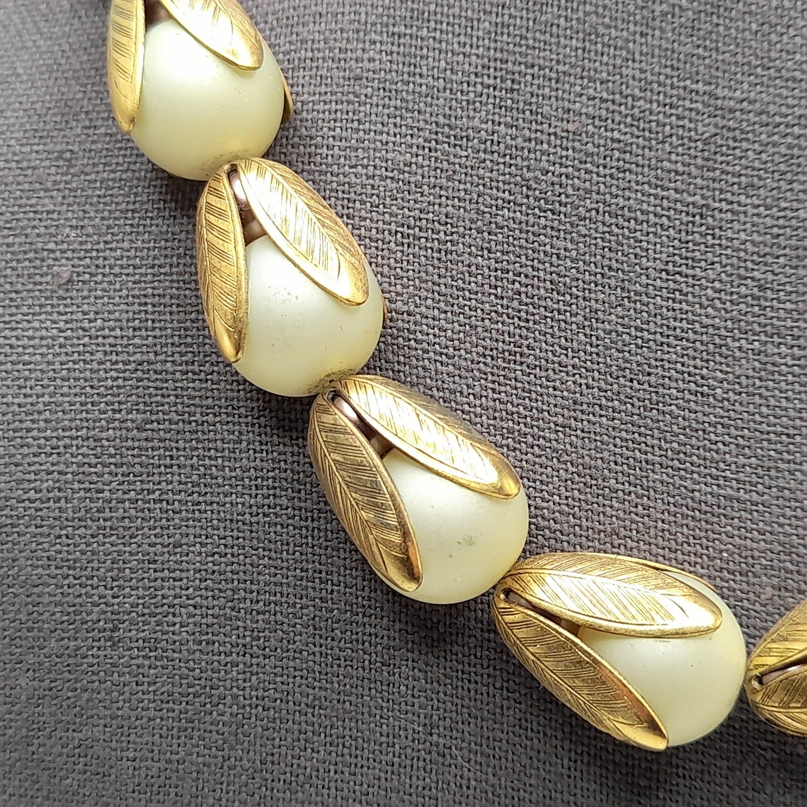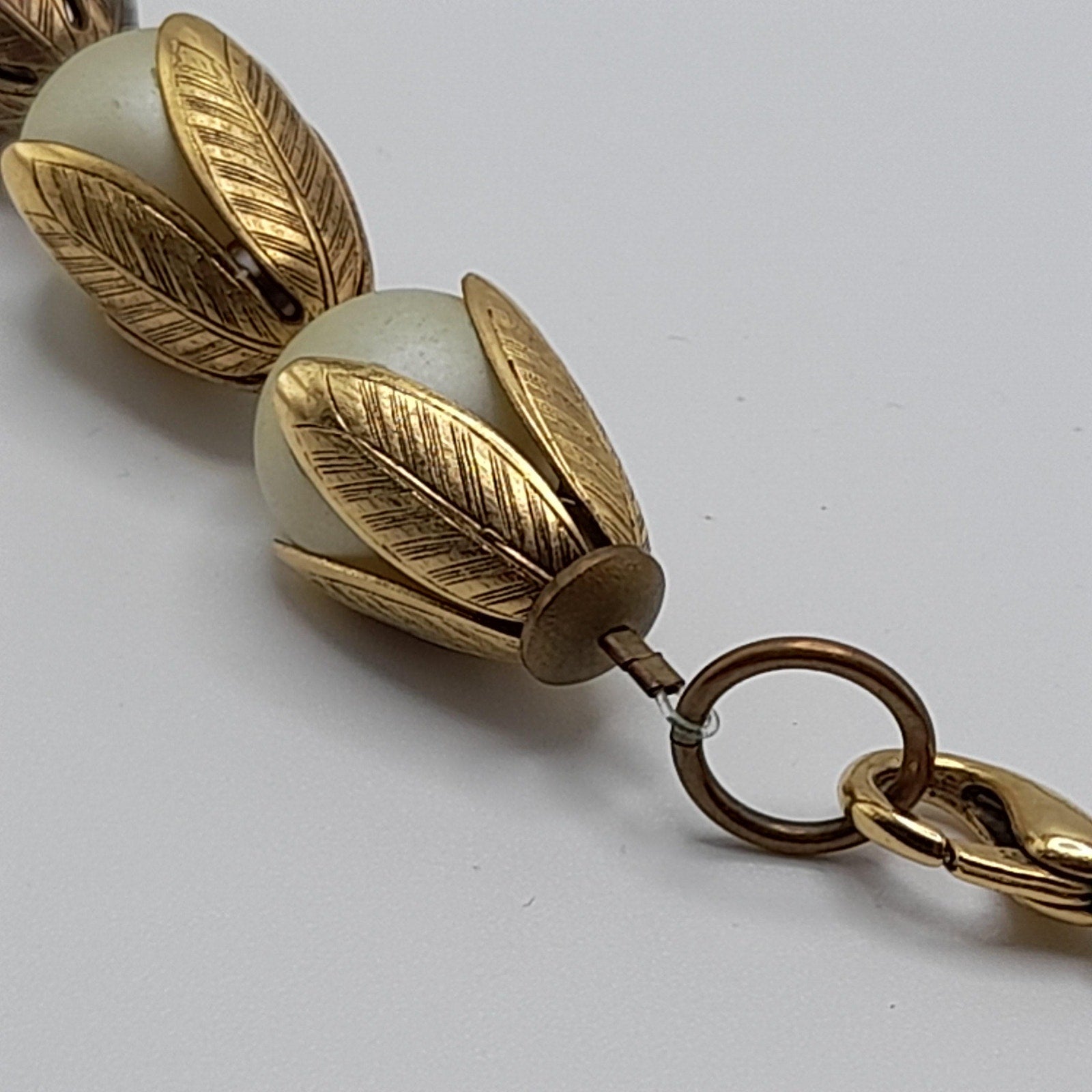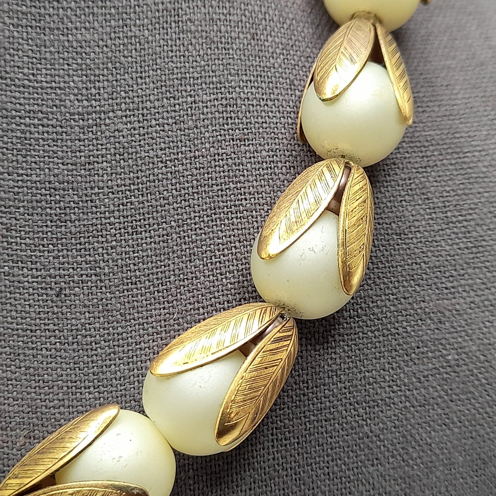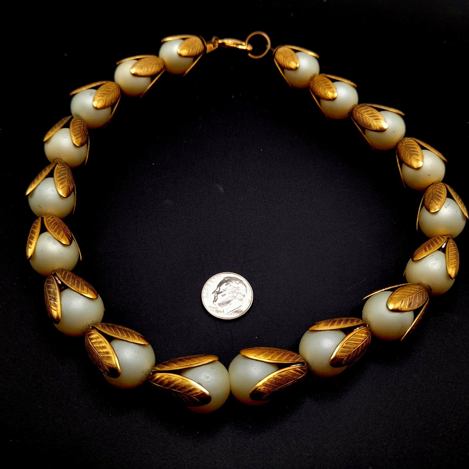 Lenora Dame Faux Pearl Necklace, Gold Tone Leaf Caps, Vintage Jewelry