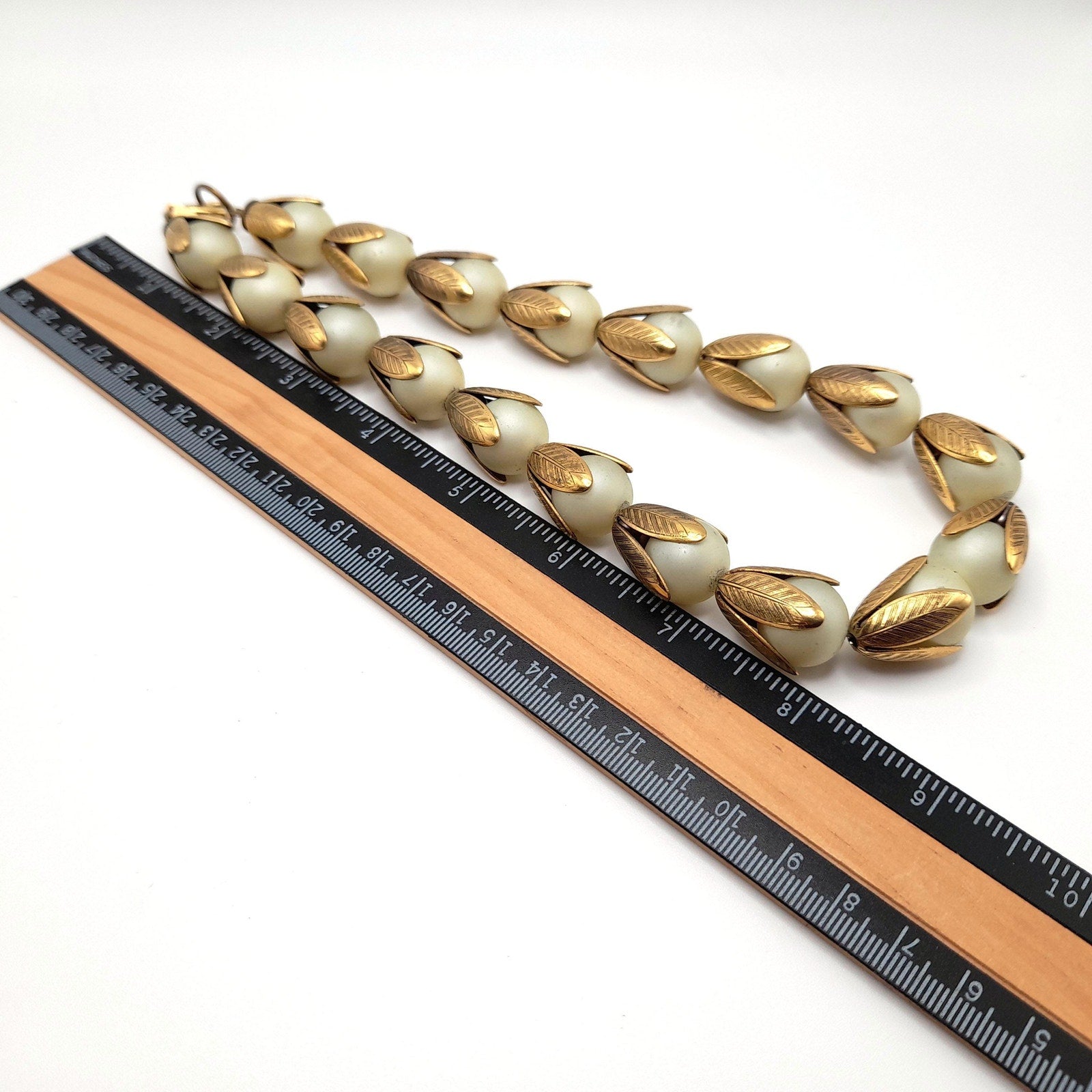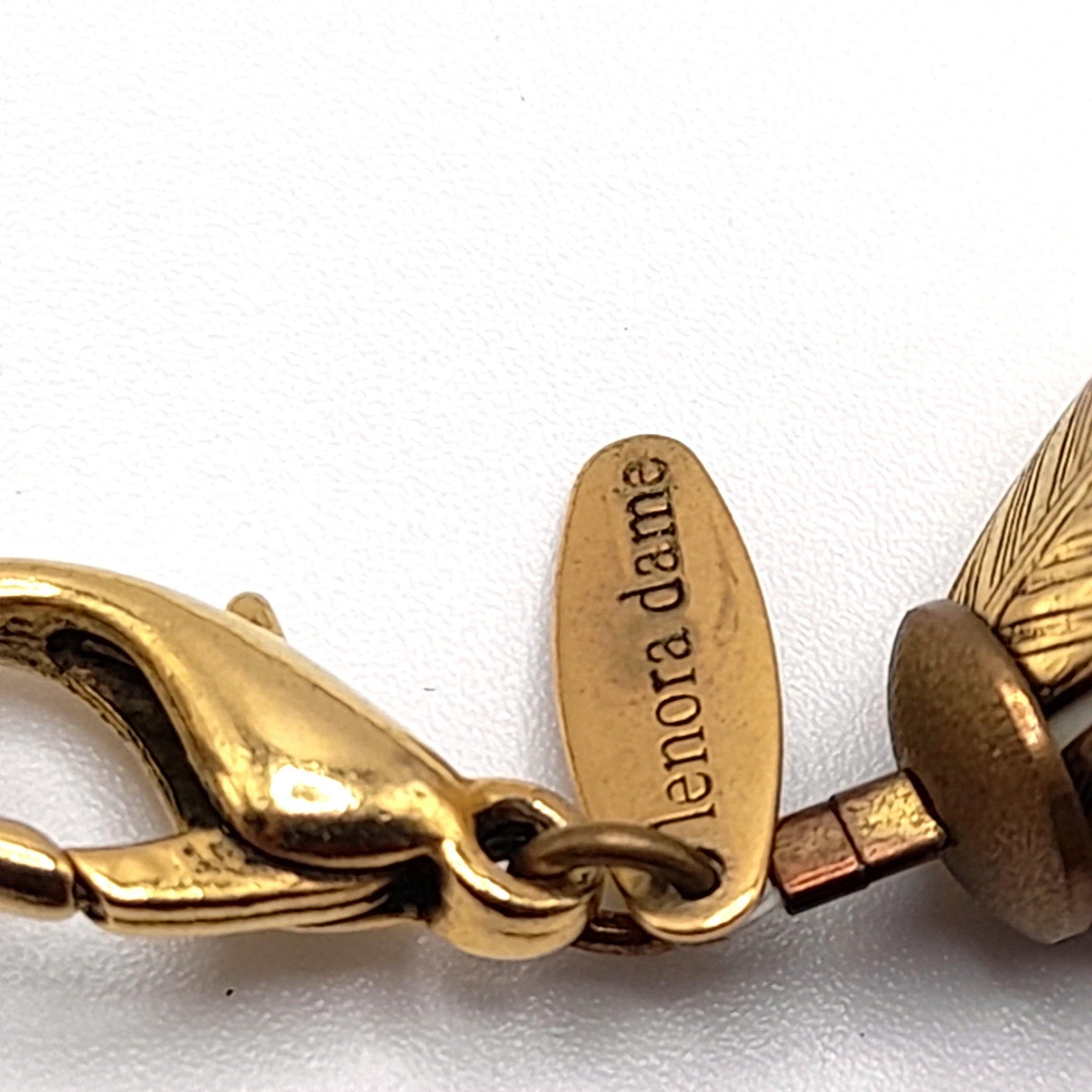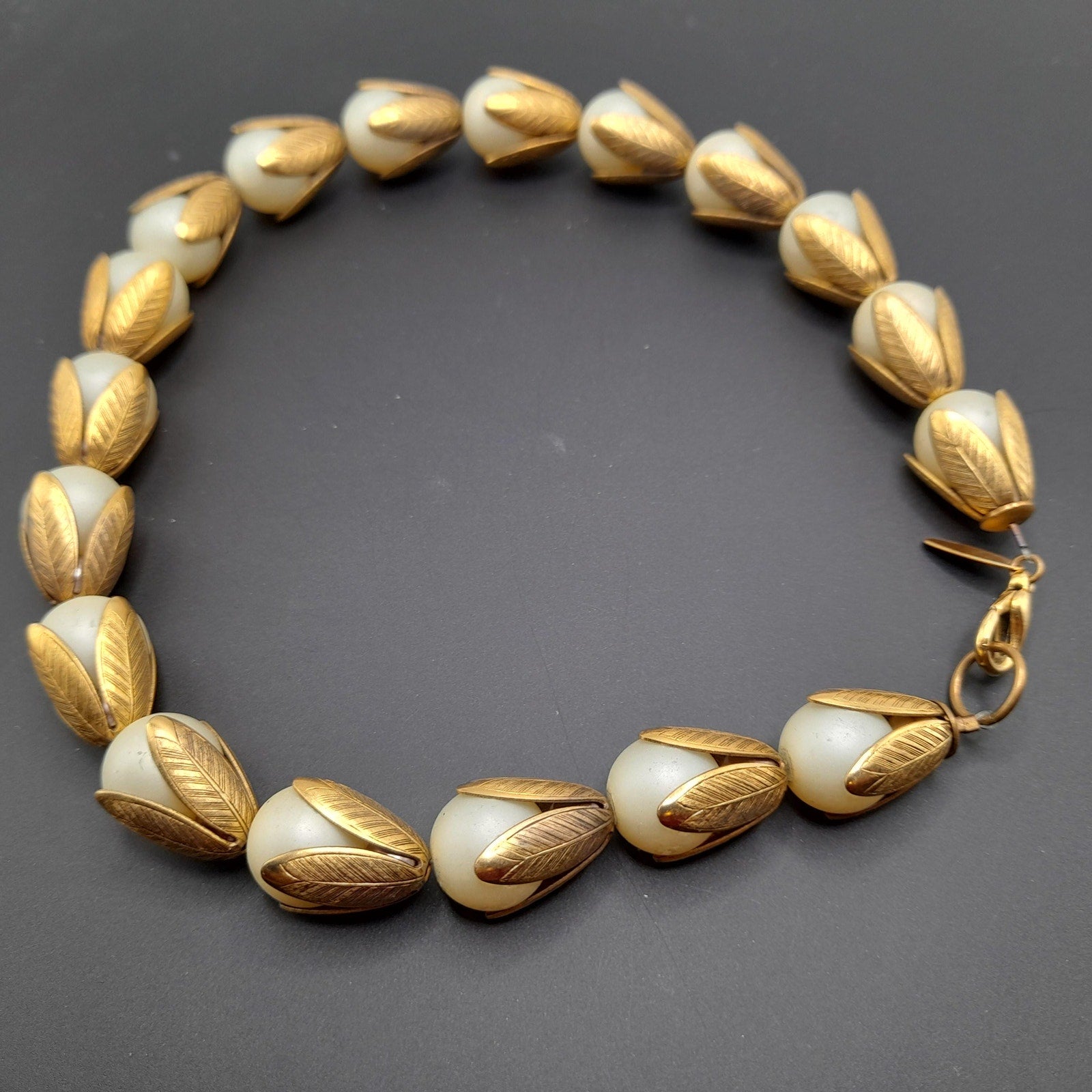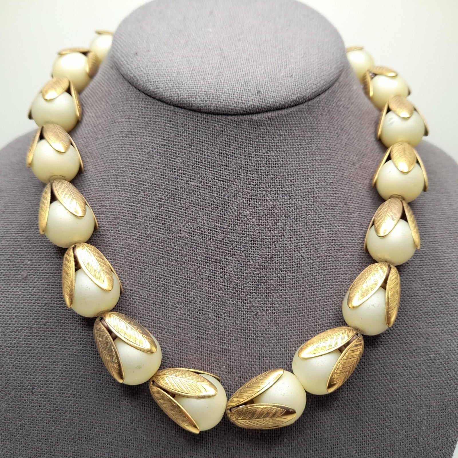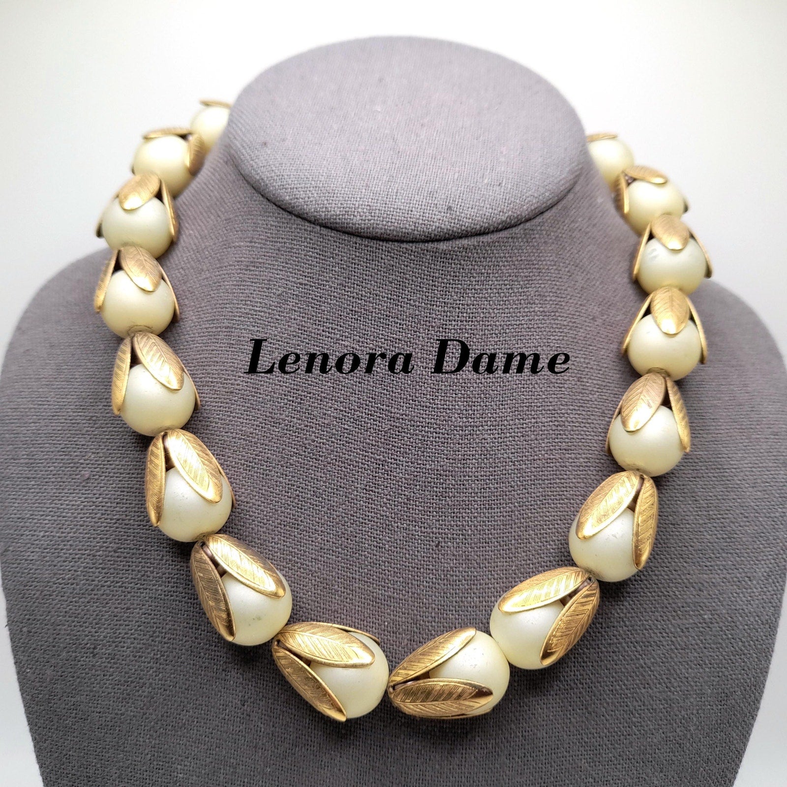 *Description: This is a great Lenora Dame faux pearl glass bead and gold tone leaf cap necklace from the late 1990s to early 2000s. The pearls are a grayish white. The necklace is substantial at 5 ounces and is 18 inches in length. This would be a great addition to your vintage jewelry collection or make a great vintage gift!