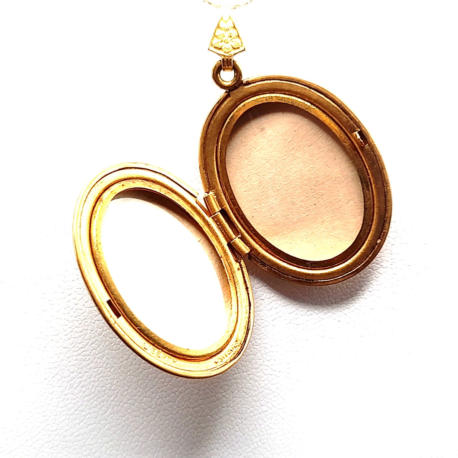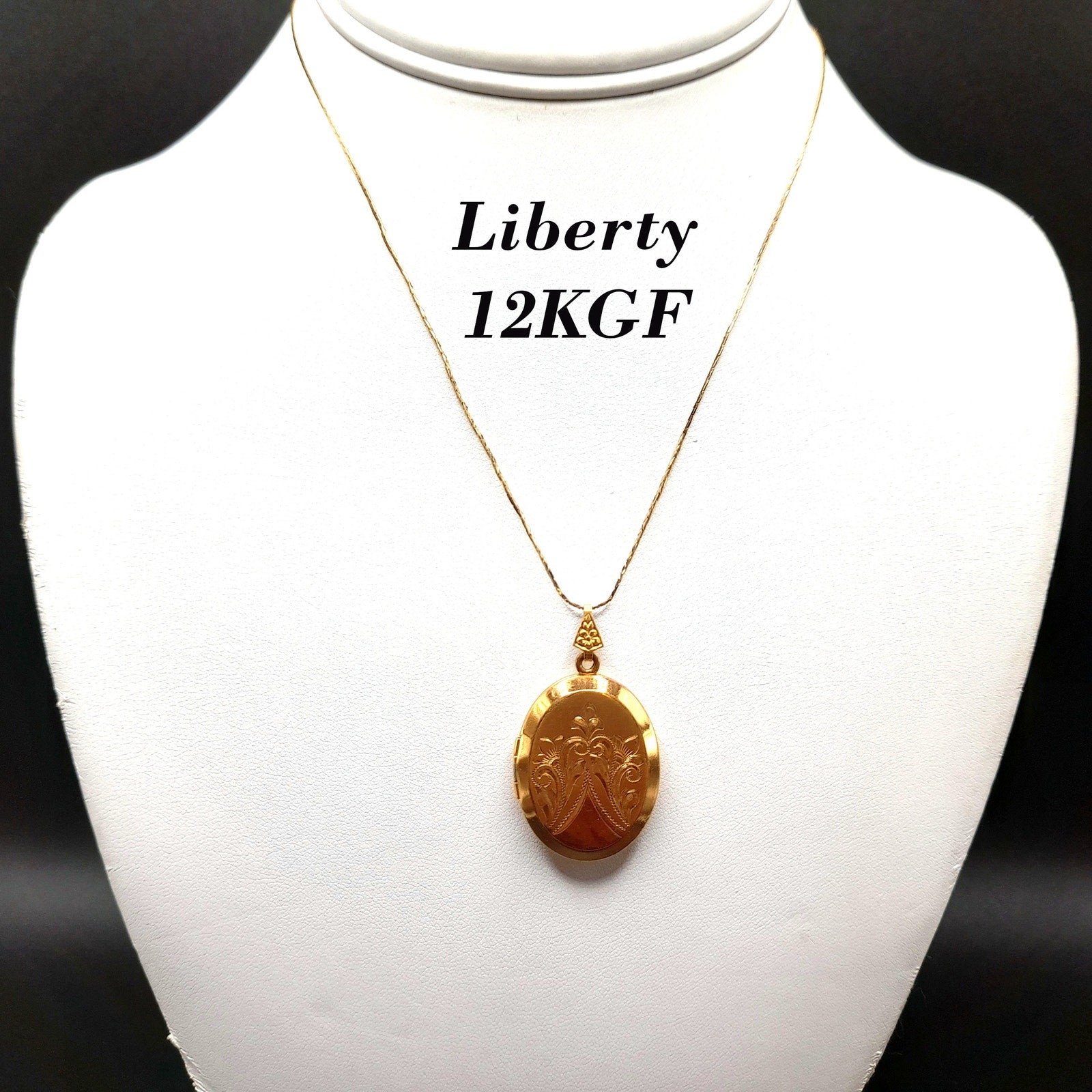 Capture a memory and wear it close to your heart with this beautiful mid-century Liberty locket necklace, crafted in 12K gold-filled metal and paired with a Crown Trifari gold-plated chain.