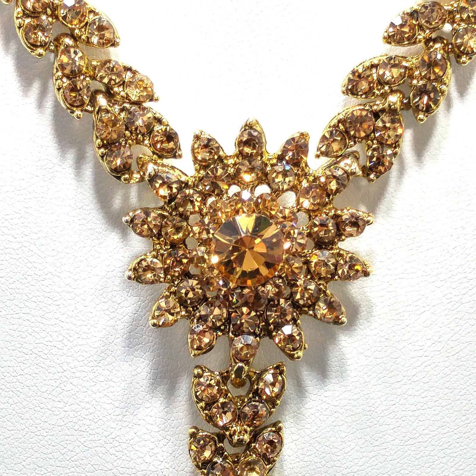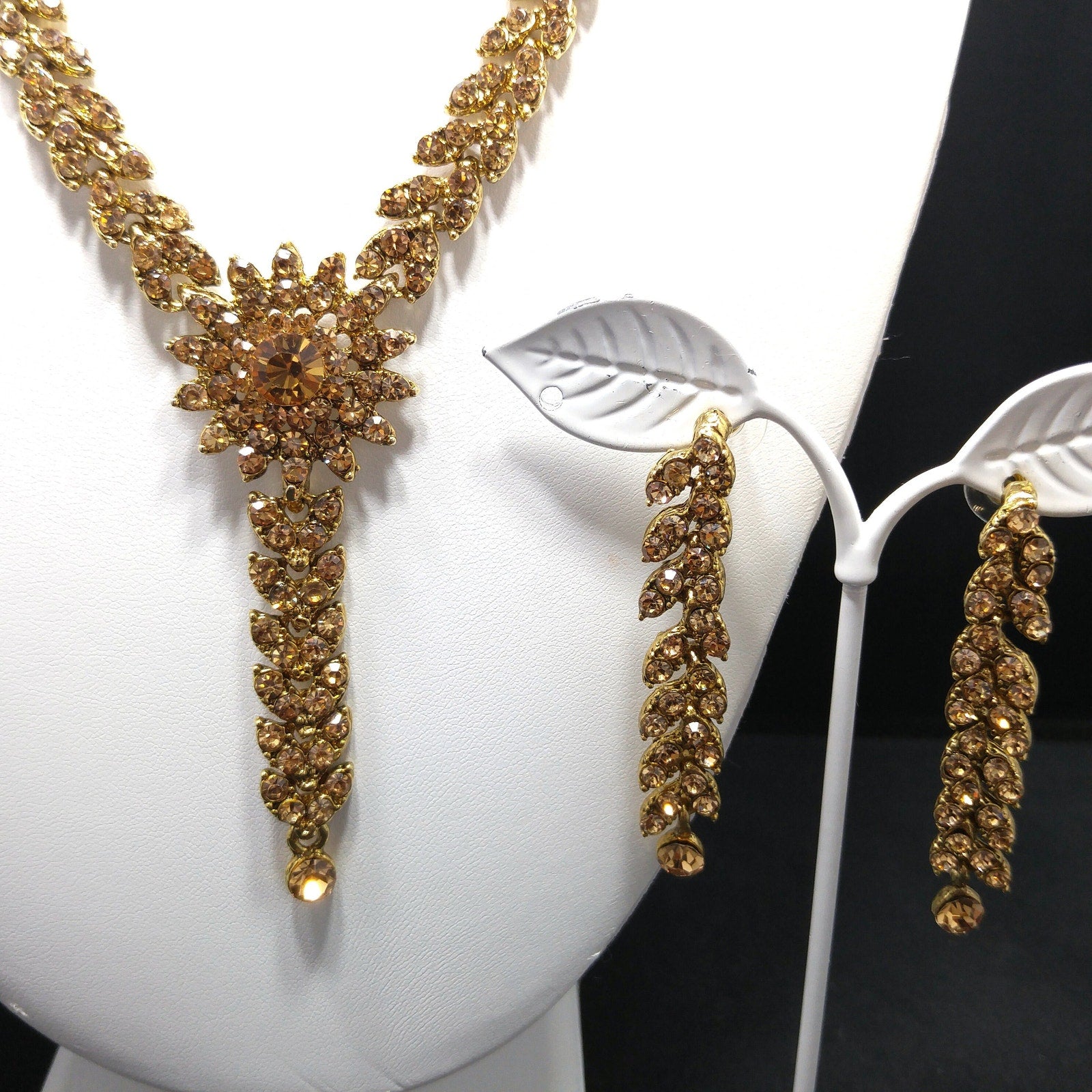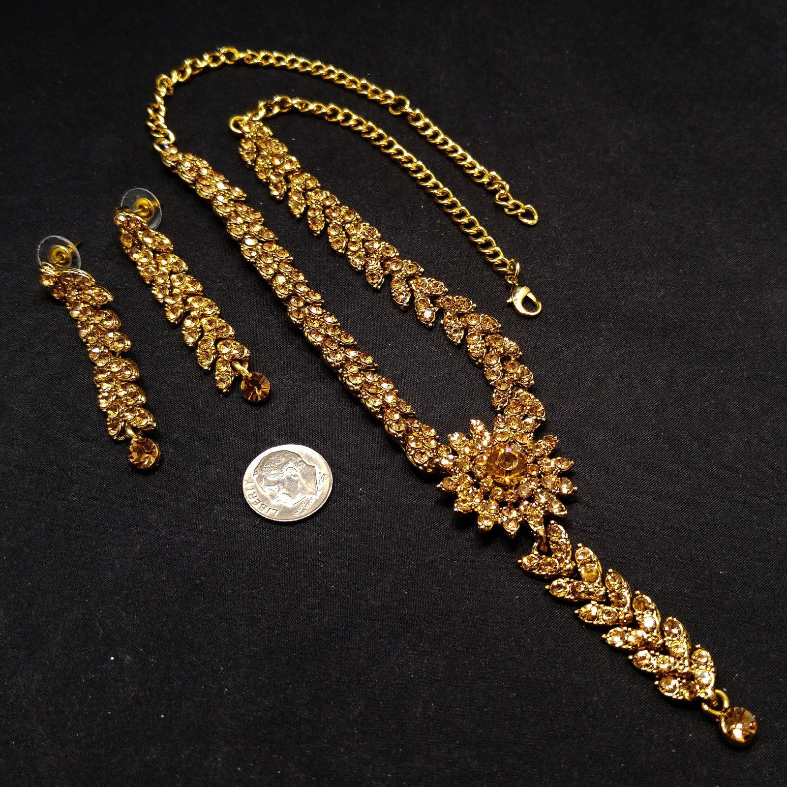 Light Topaz Rhinestone Necklace Post Earrings Set, Gold Plated, 1990s Vintage Jewelry