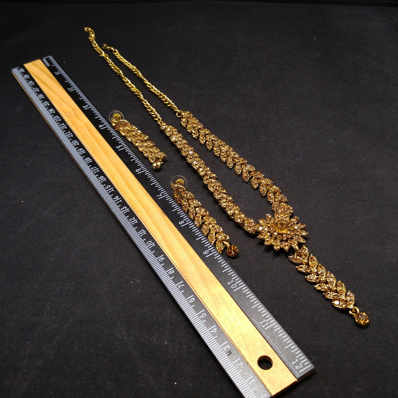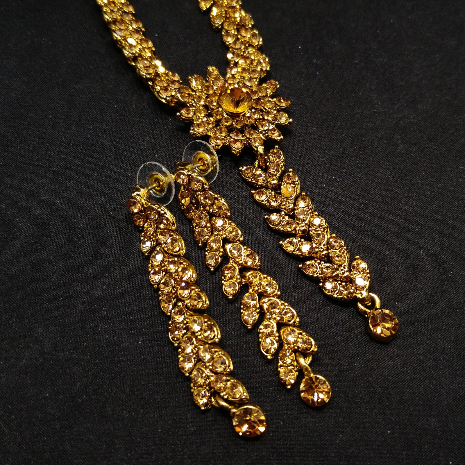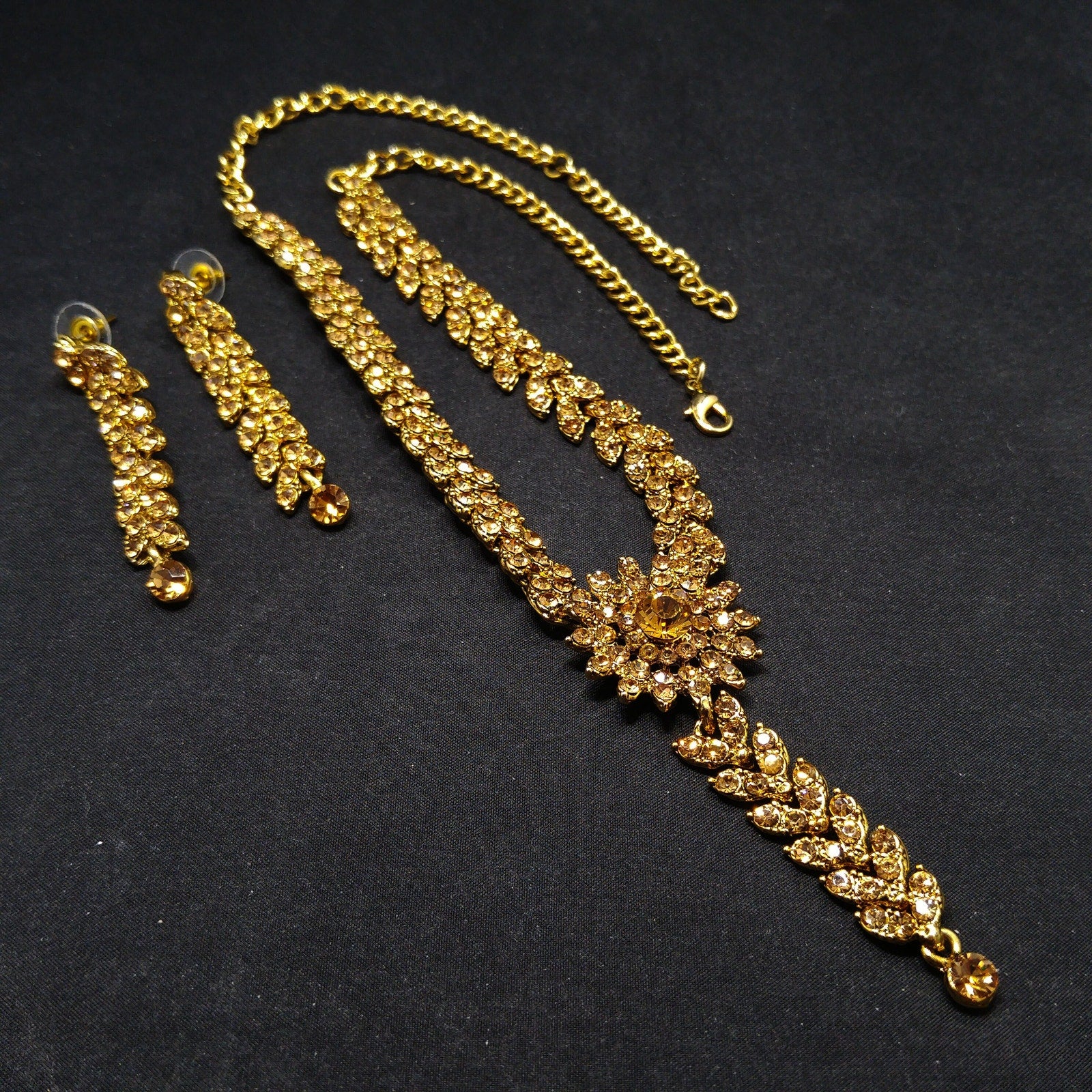 Light Topaz Rhinestone Necklace Post Earrings Set, Gold Plated, 1990s Vintage Jewelry