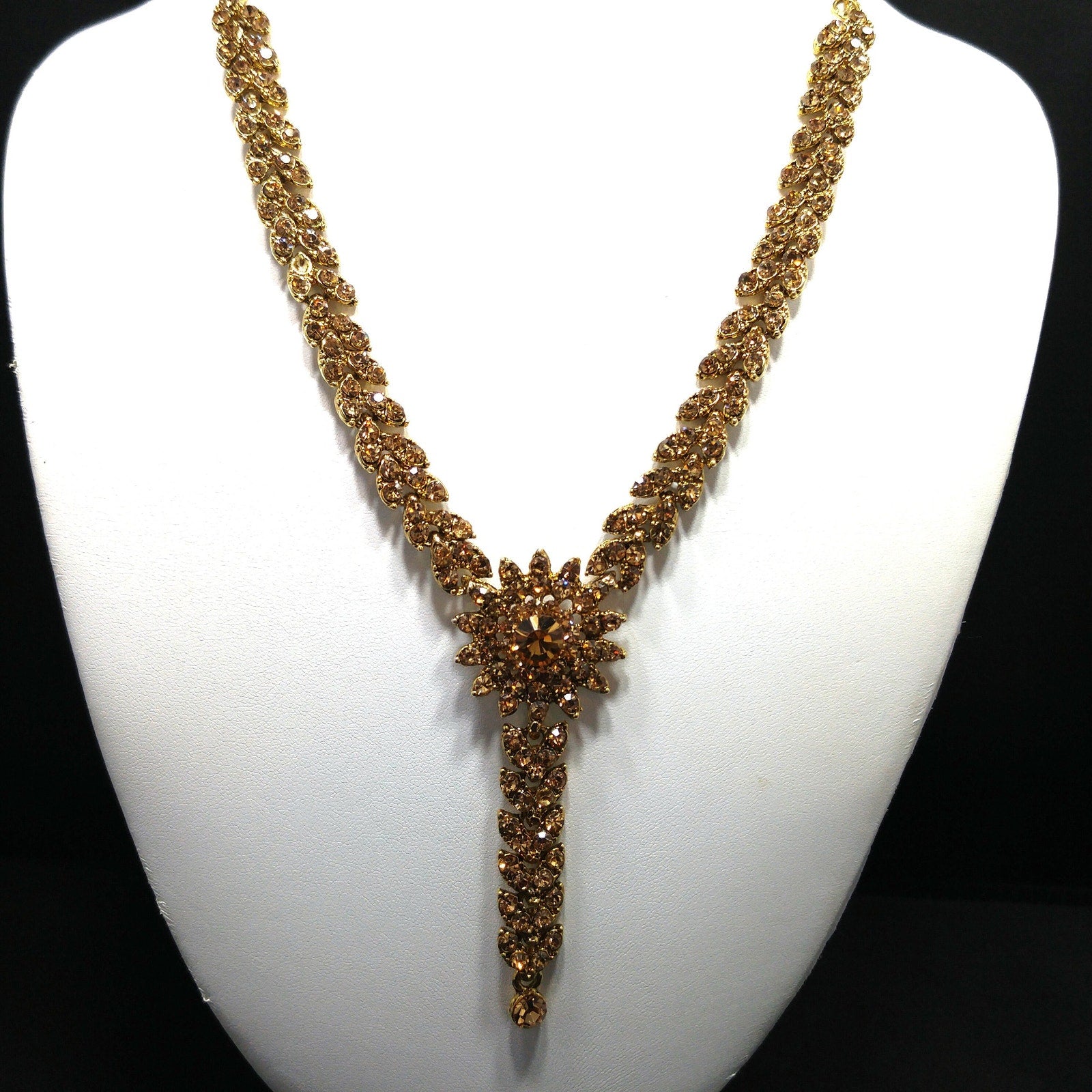 *Description: This is a beautiful light topaz rhinestone pendant necklace with matching dangle post earrings from the 1990s. The pendant dangle matches the dangle of the earrings. The earrings are post earrings and the clasp on the necklace is a lobster clasp. The necklace looks beautiful and full of sparkle. This would be a great addition to your vintage jewelry collection or make a great vintage gift!
