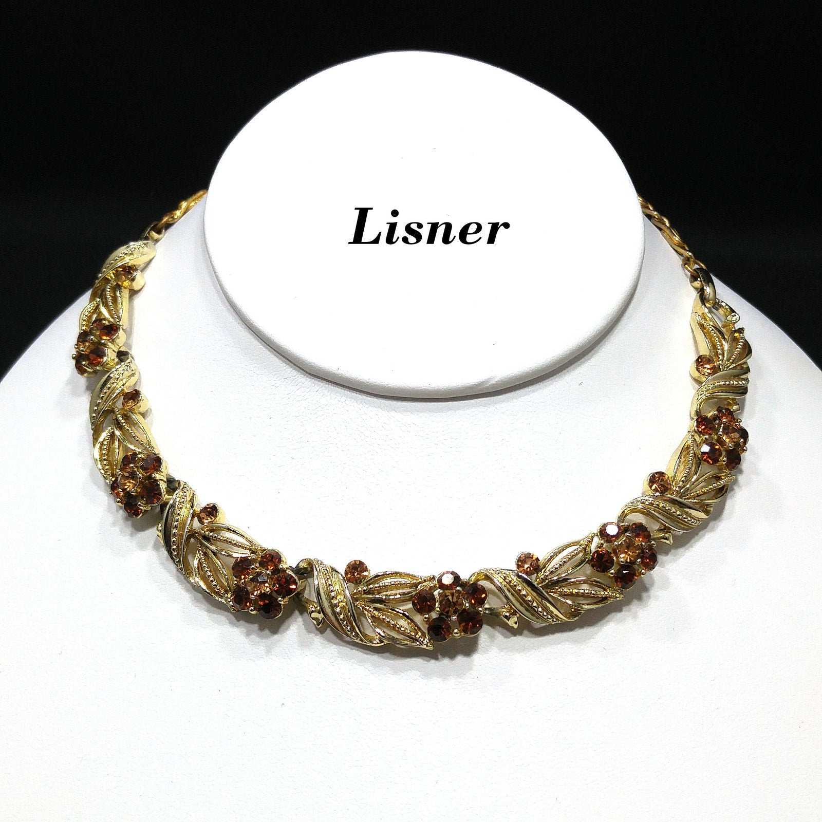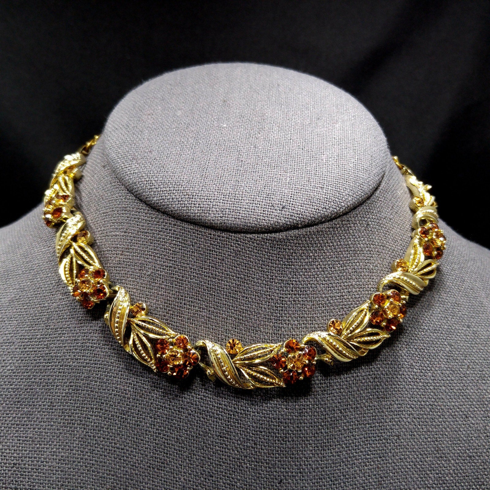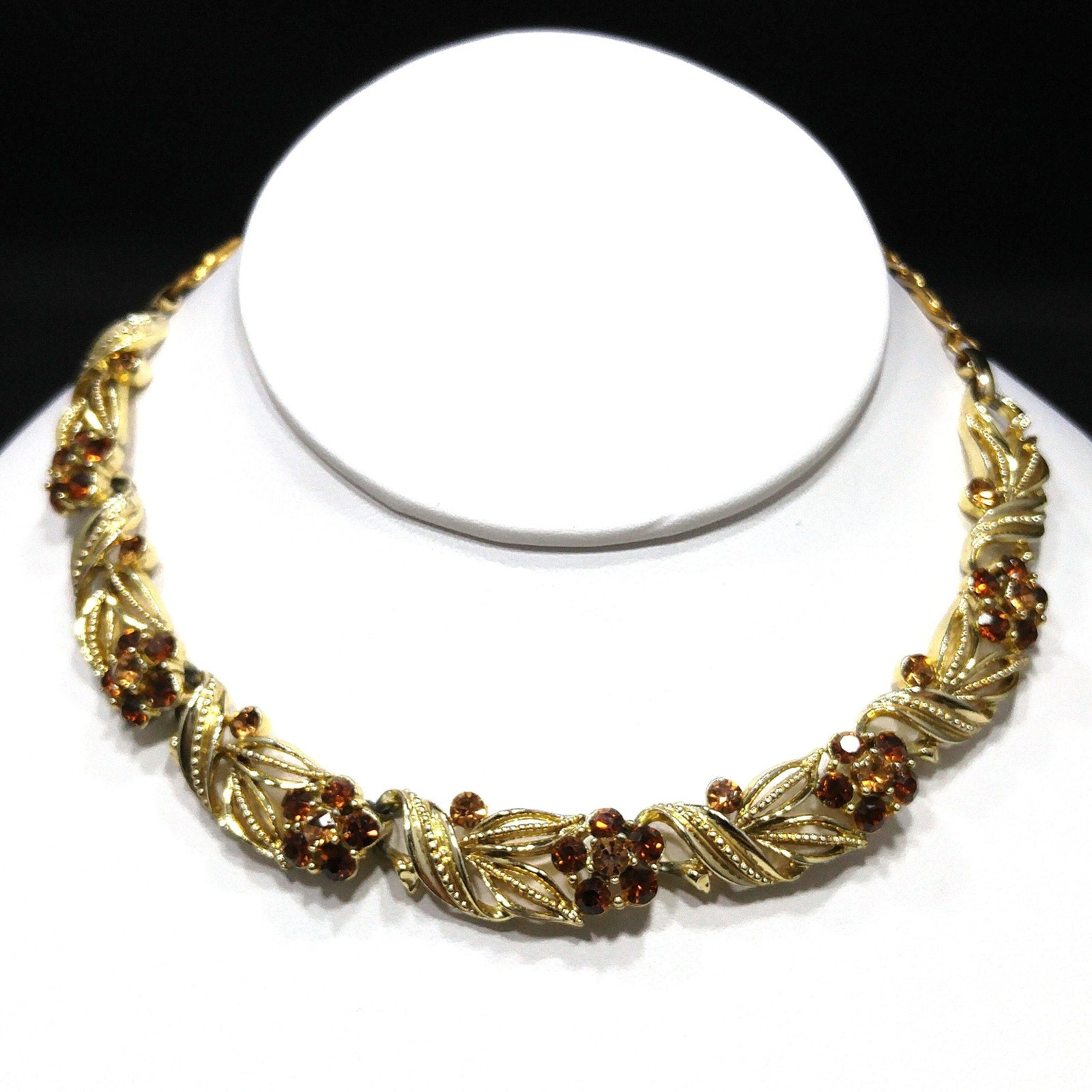 *Description: This is a beautiful Lisner choker necklace with a flower on each link with a light topaz rhinestone center and a little darker topaz rhinestone petals from the 1950s. This mid-century necklace is a great rhinestone choker for any occasion and would be a great gift or a wonderful addition to your vintage jewelry collection.