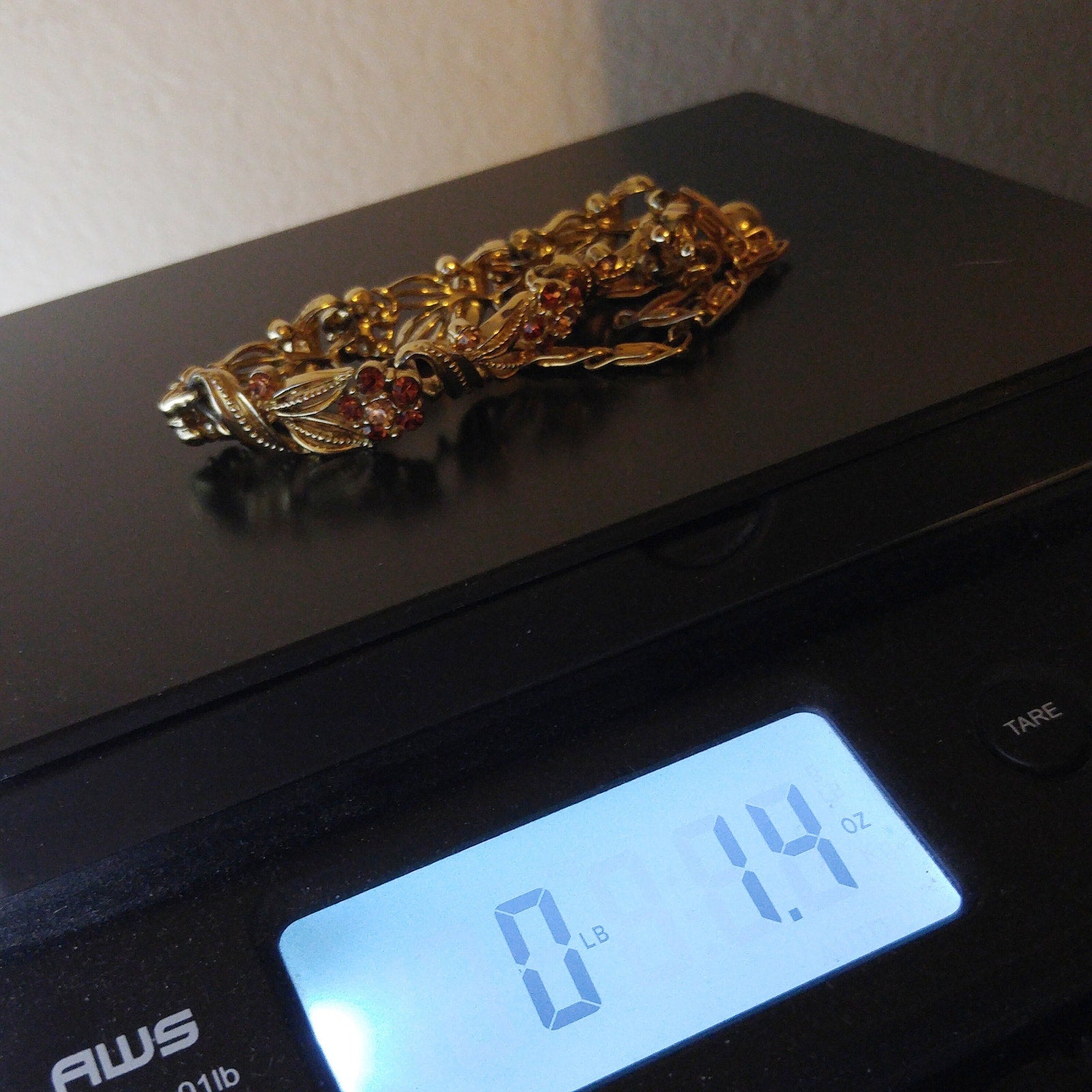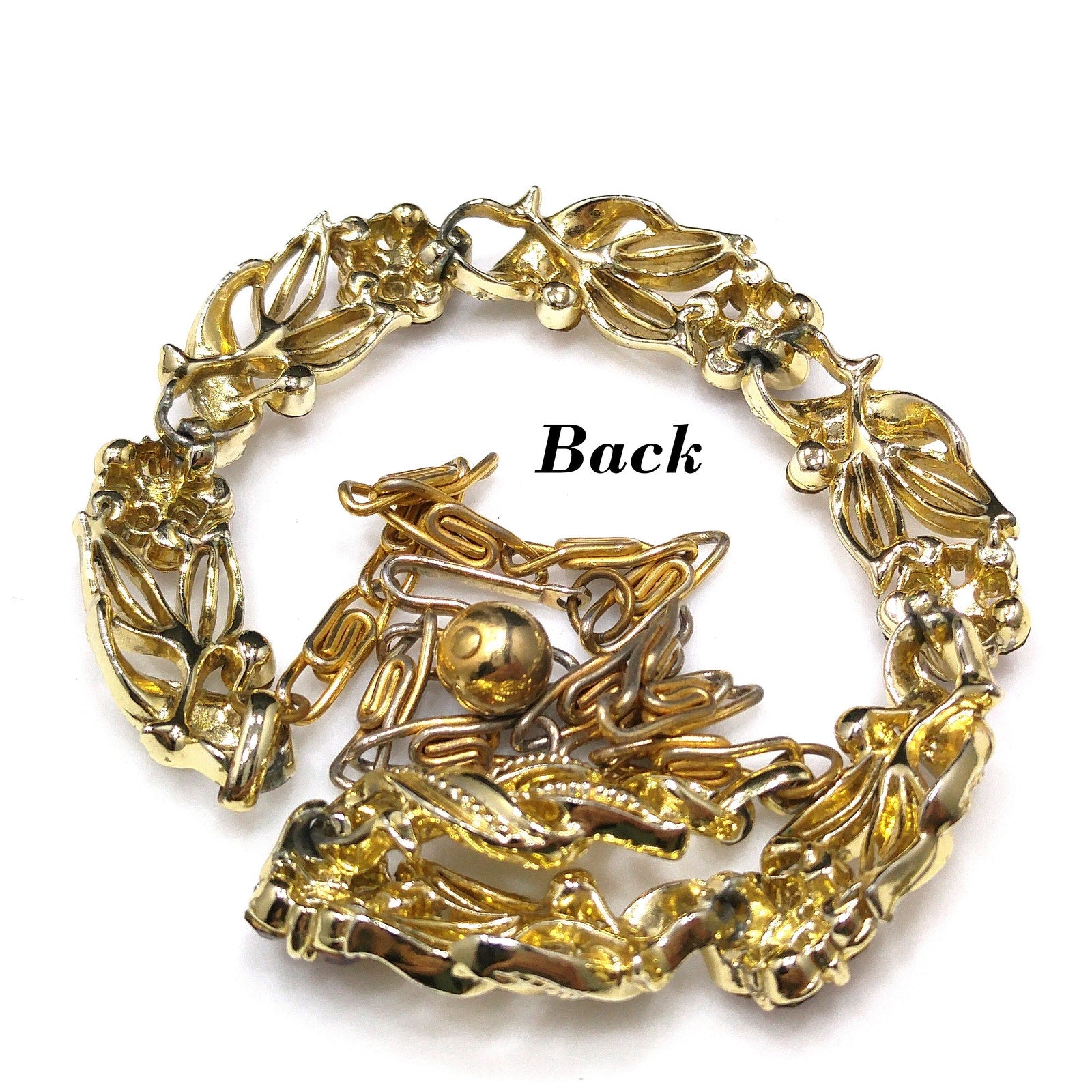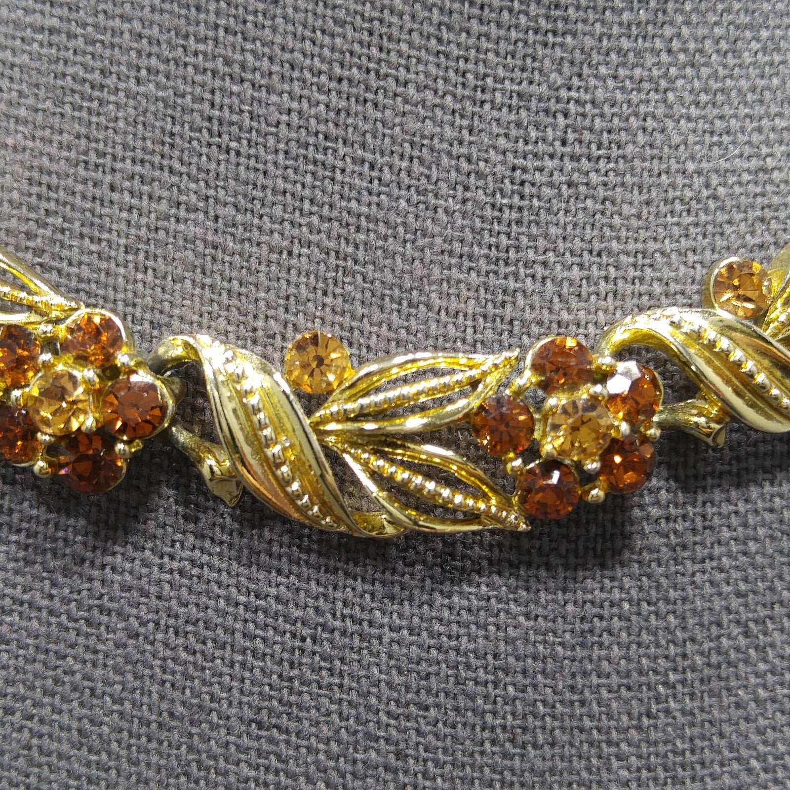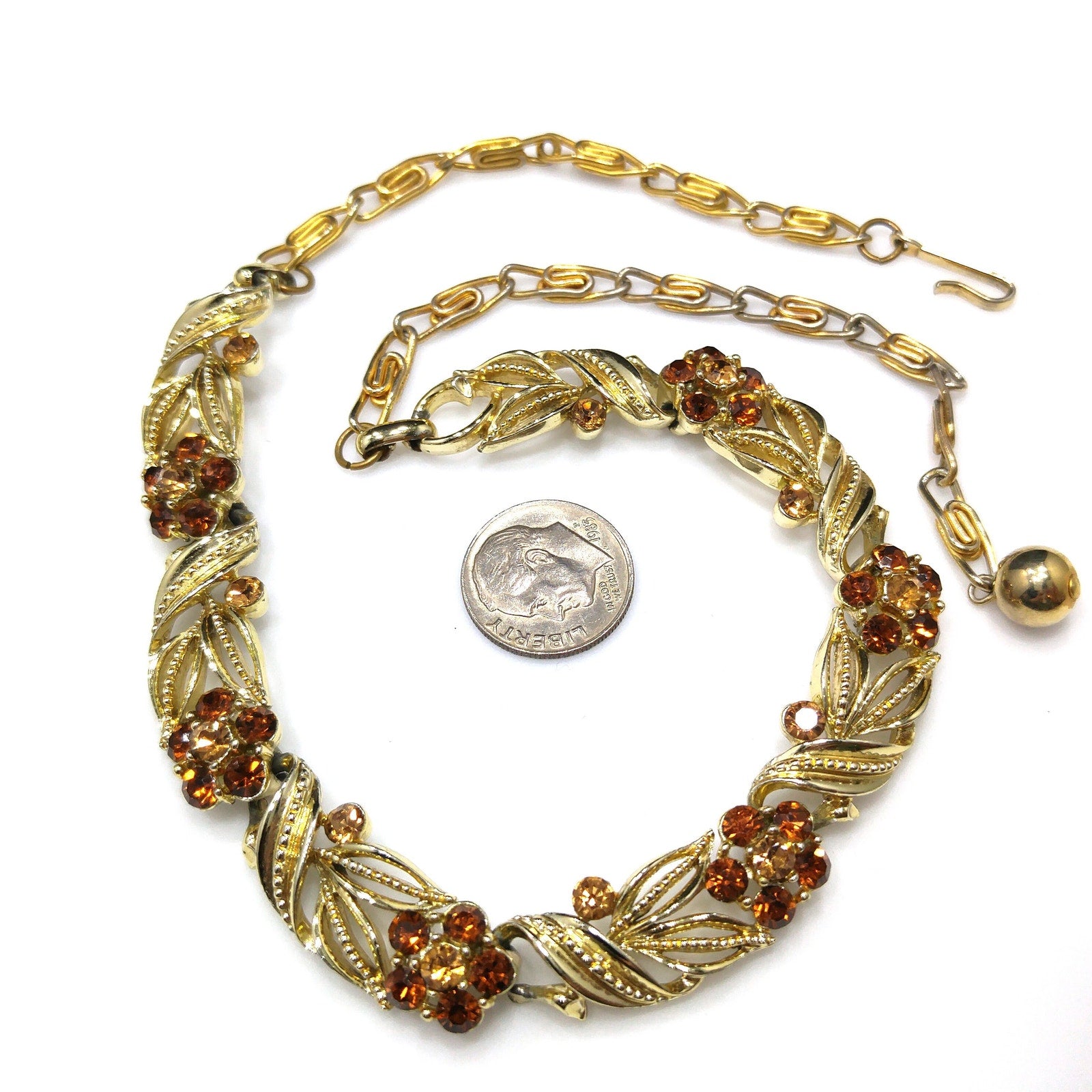 *Description: This is a beautiful Lisner choker necklace with a flower on each link with a light topaz rhinestone center and a little darker topaz rhinestone petals from the 1950s. This mid-century necklace is a great rhinestone choker for any occasion and would be a great gift or a wonderful addition to your vintage jewelry collection.