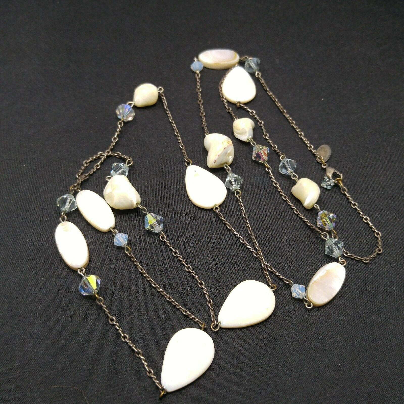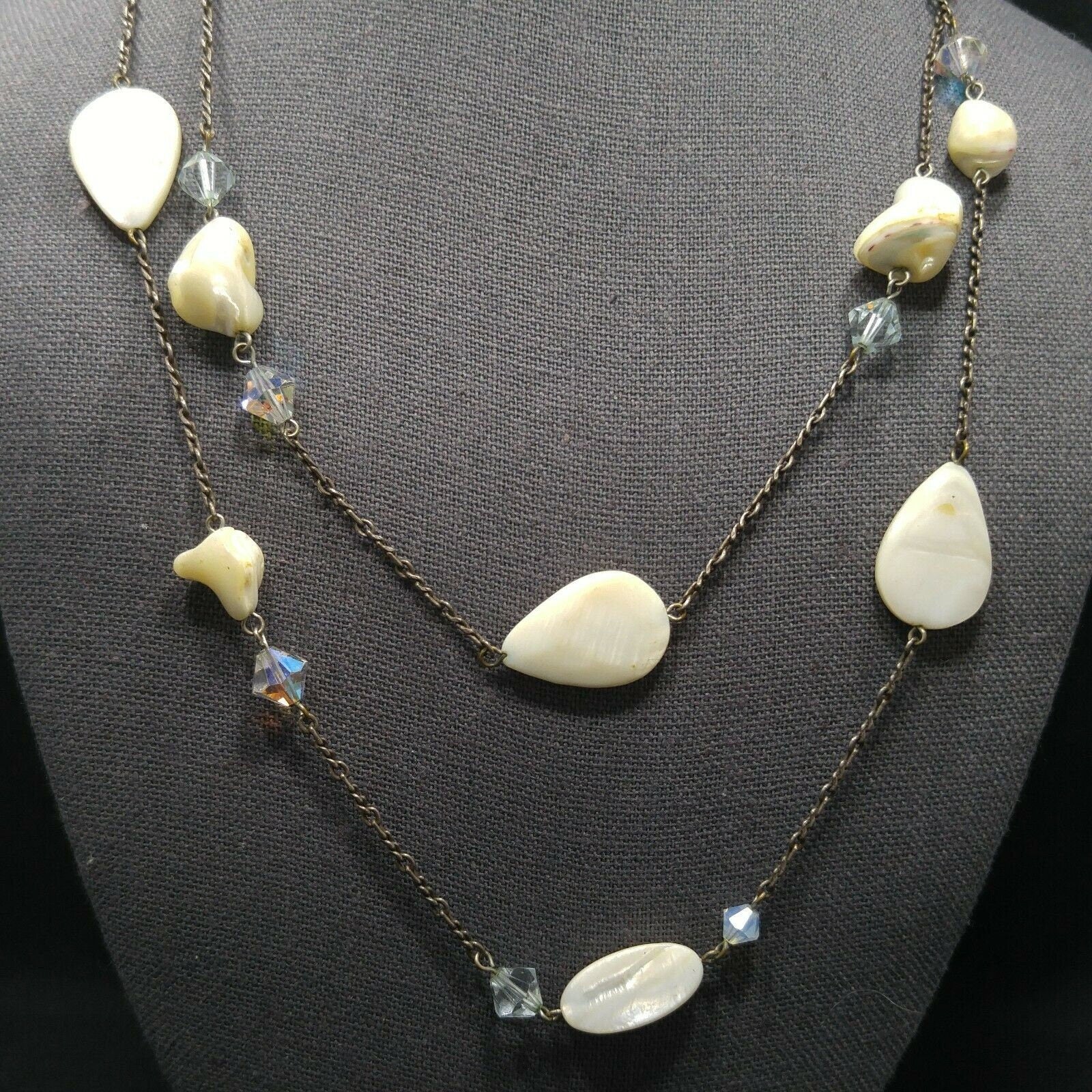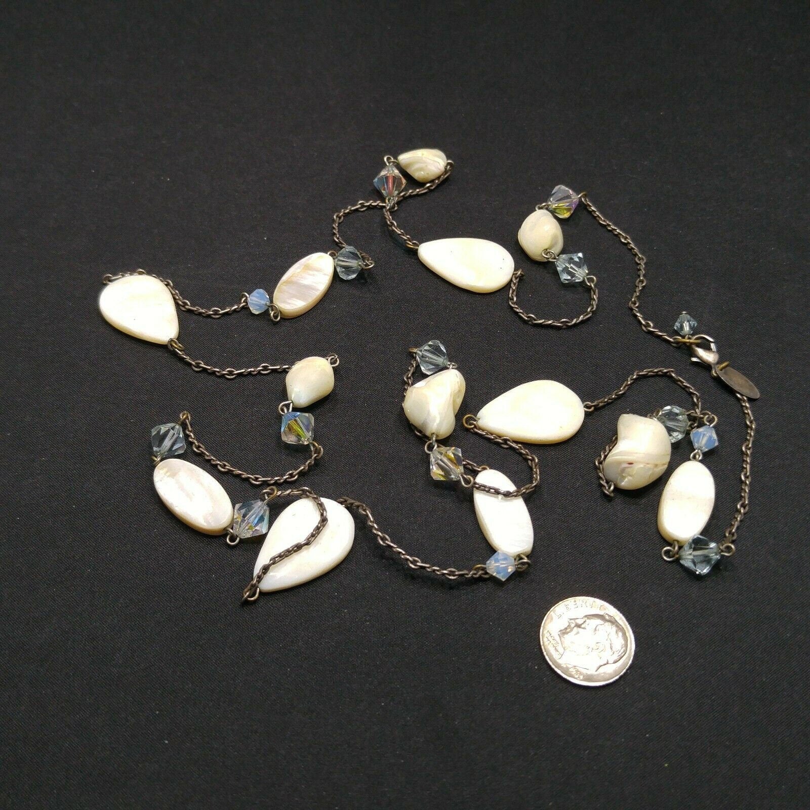 Liz Palacios S.F. White Shell & Crystal Long Necklace, 42 Inch Layering Necklace, Vintage Jewelry