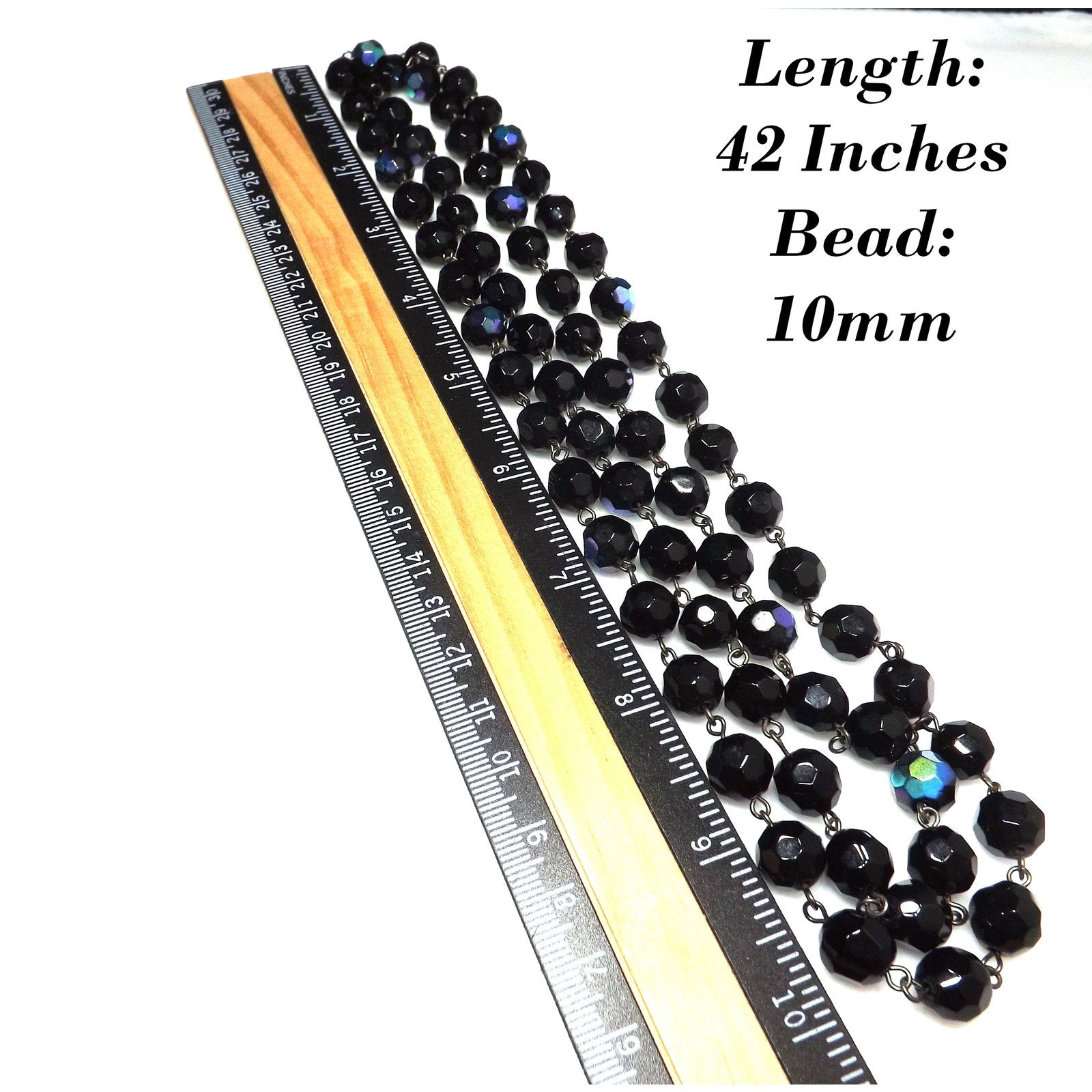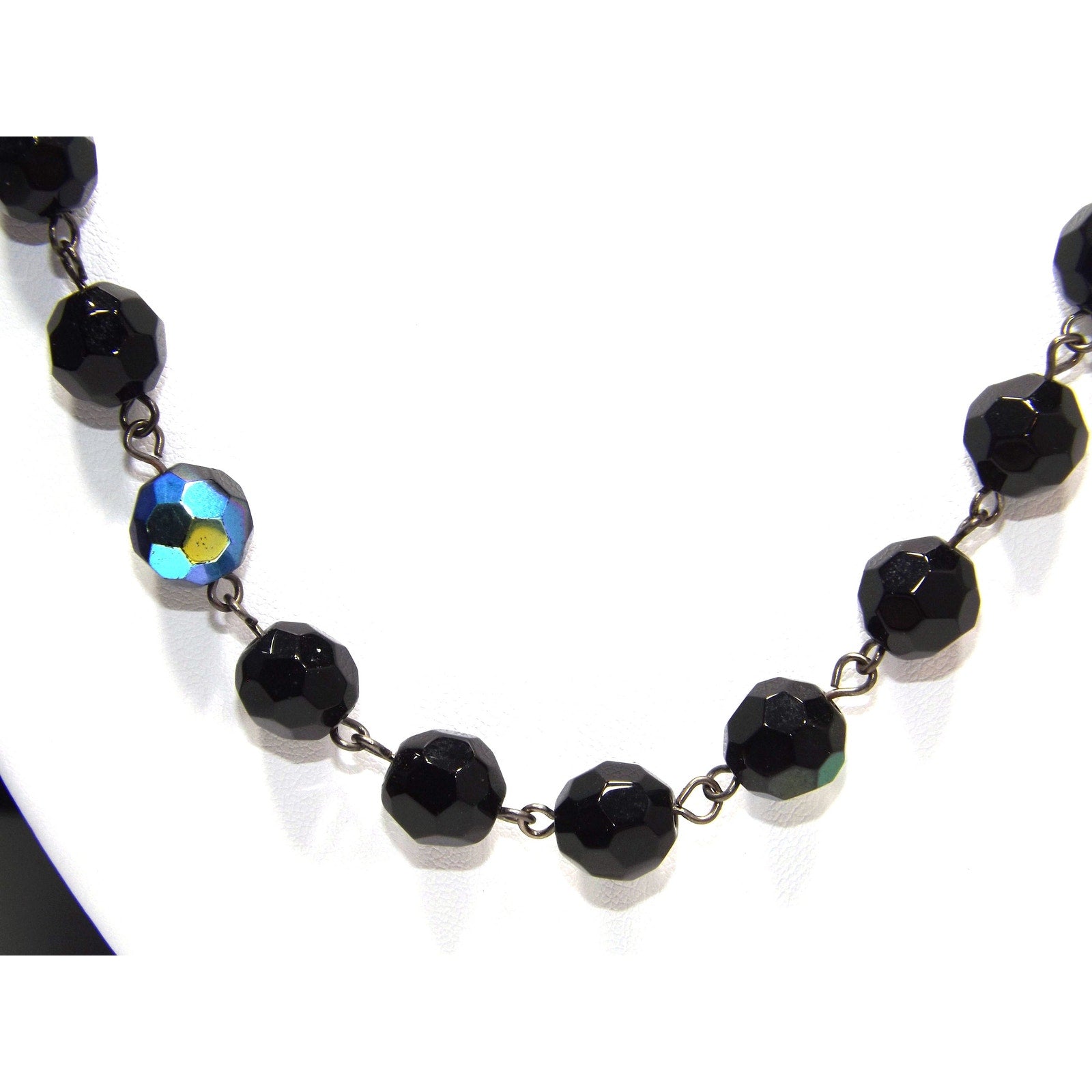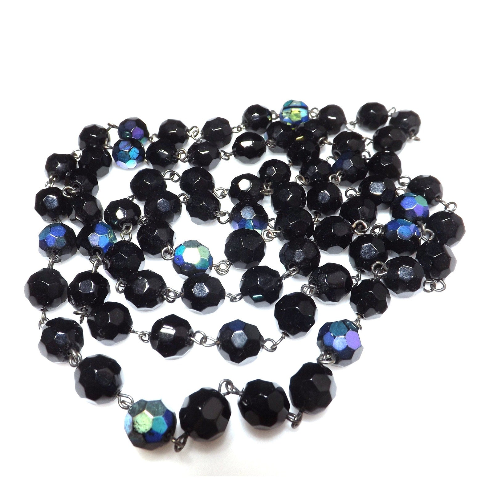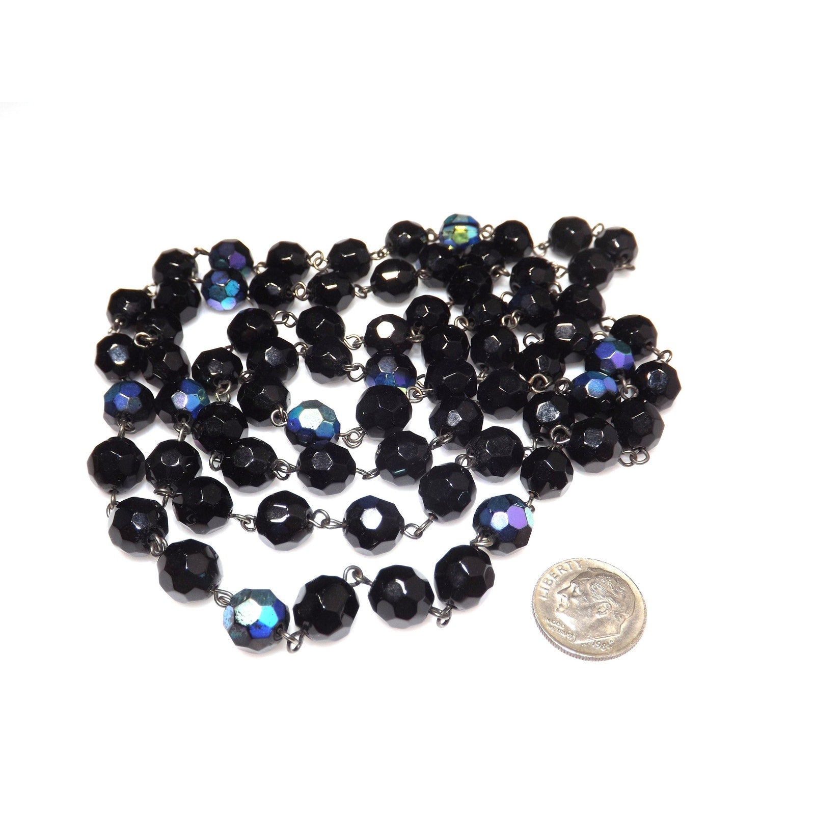 *Description: This is a beautiful Austrian crystal black faceted beaded necklace with a few aurora borealis black crystal accent beads from the 1960s to 1970s. The necklace was designed with wire wrapped beads in the same way as many rosary beads are connected for long lasting wear. The necklace is 42 inches in length and there is no clasp so you may wear the necklace as one long length or wrap it around a couple of times for a layered look. The beads are 10mm and beautiful. This would be a great addition to your vintage jewelry collection or make a great vintage gift!