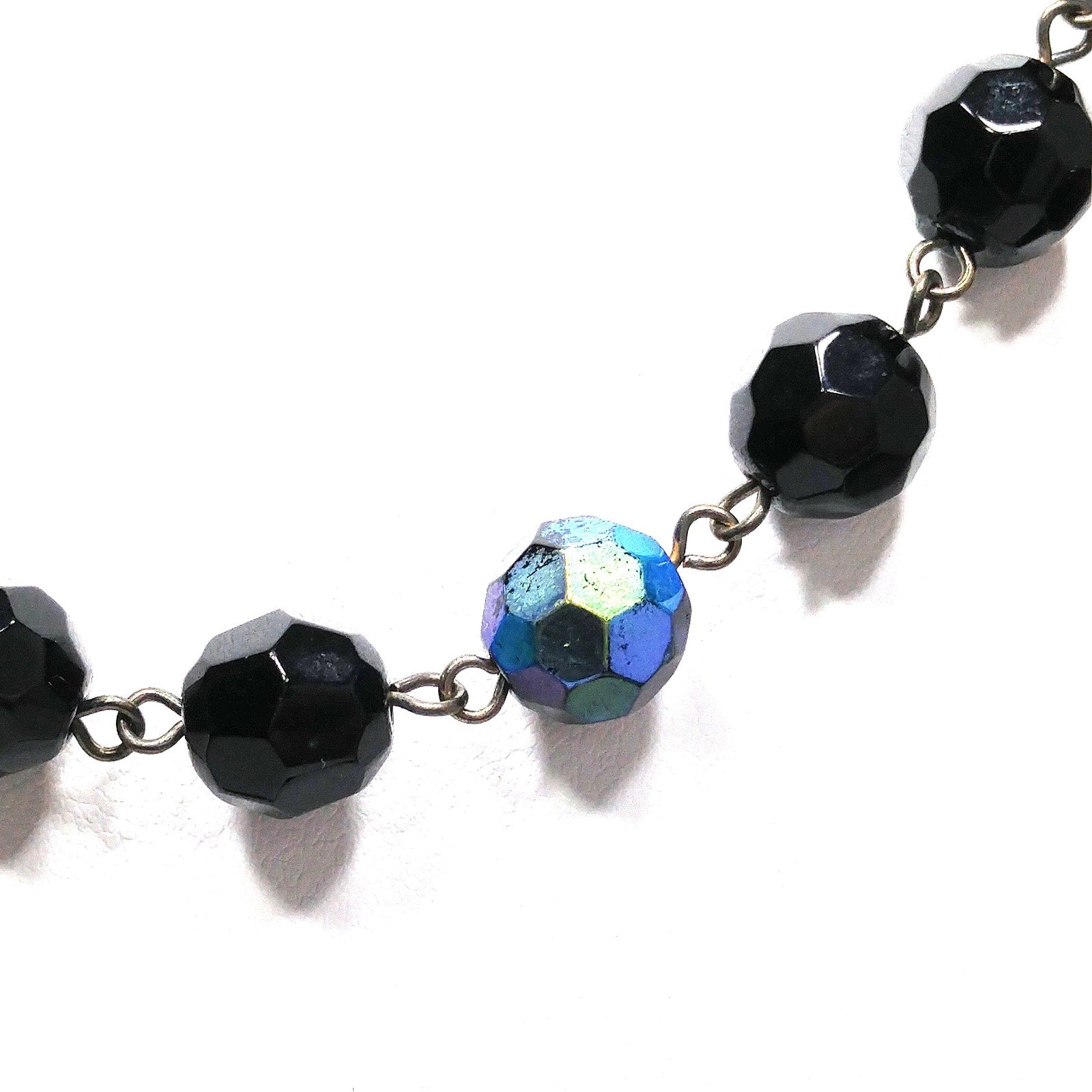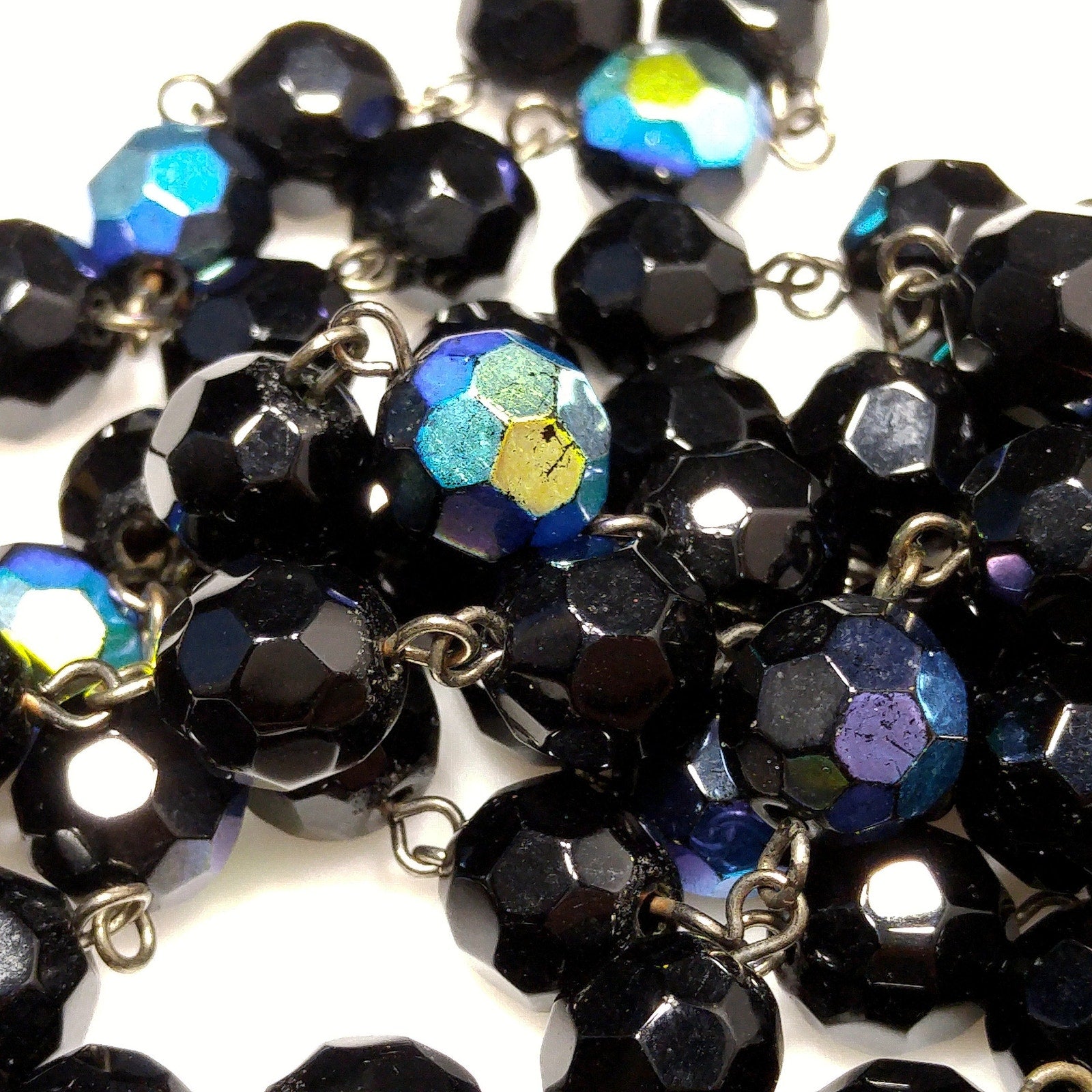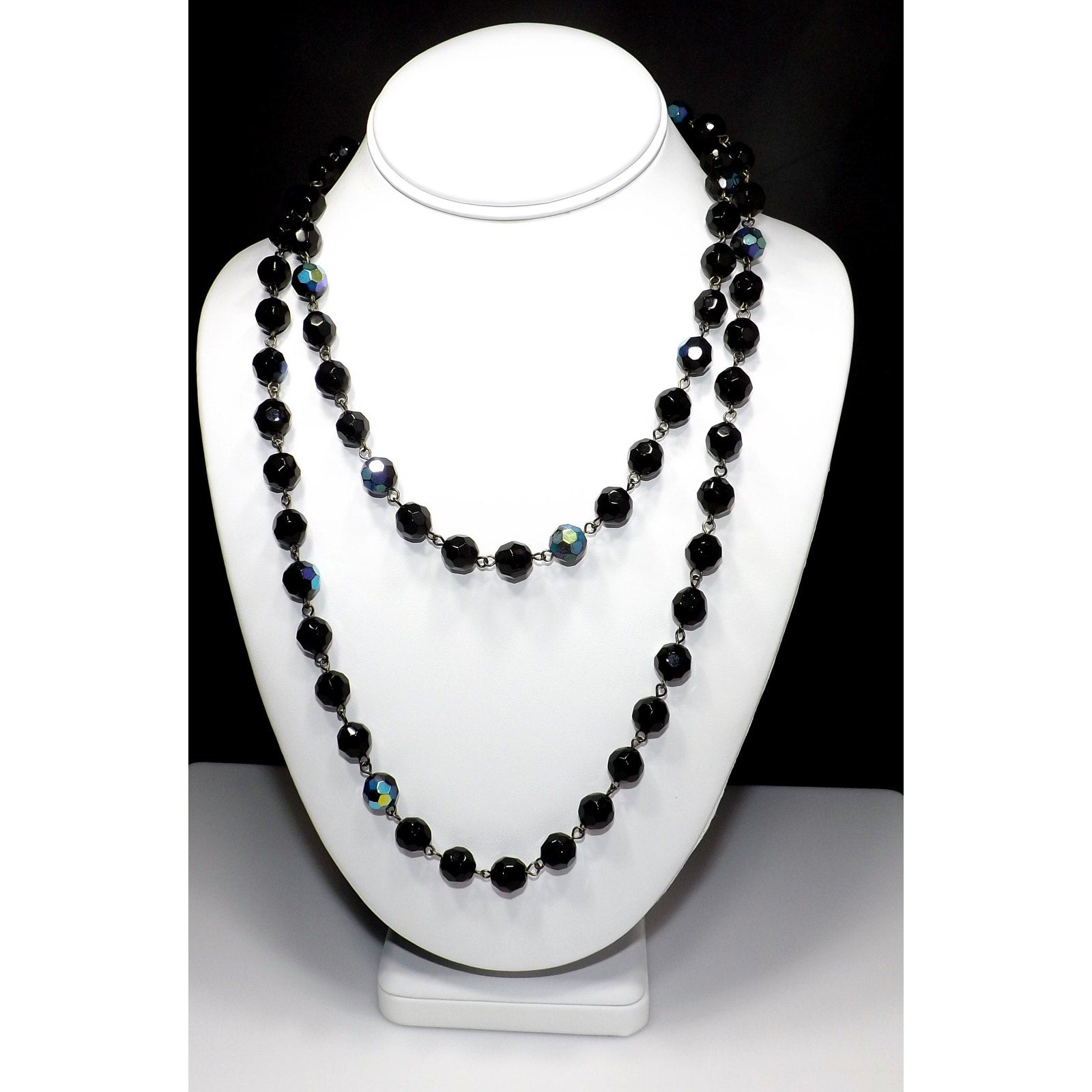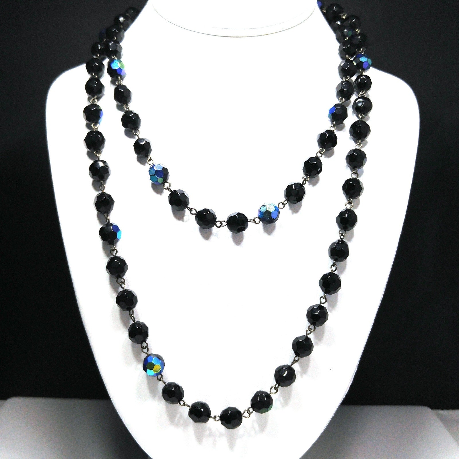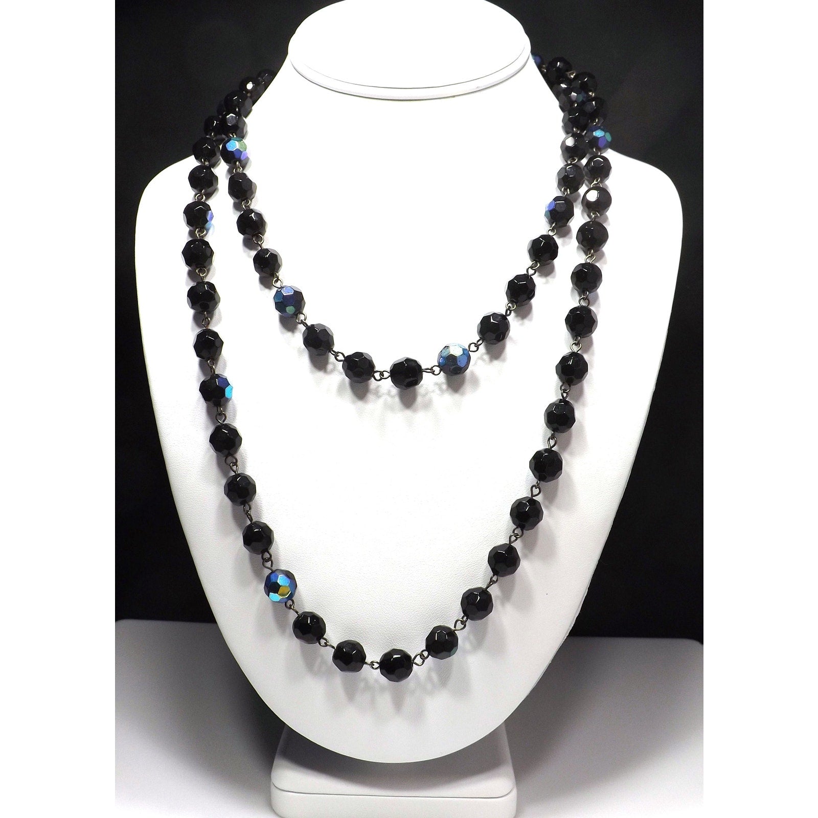 Long Black Crystal Beaded Necklace, Aurora Borealis, No Clasp, 1970s Vintage Jewelry