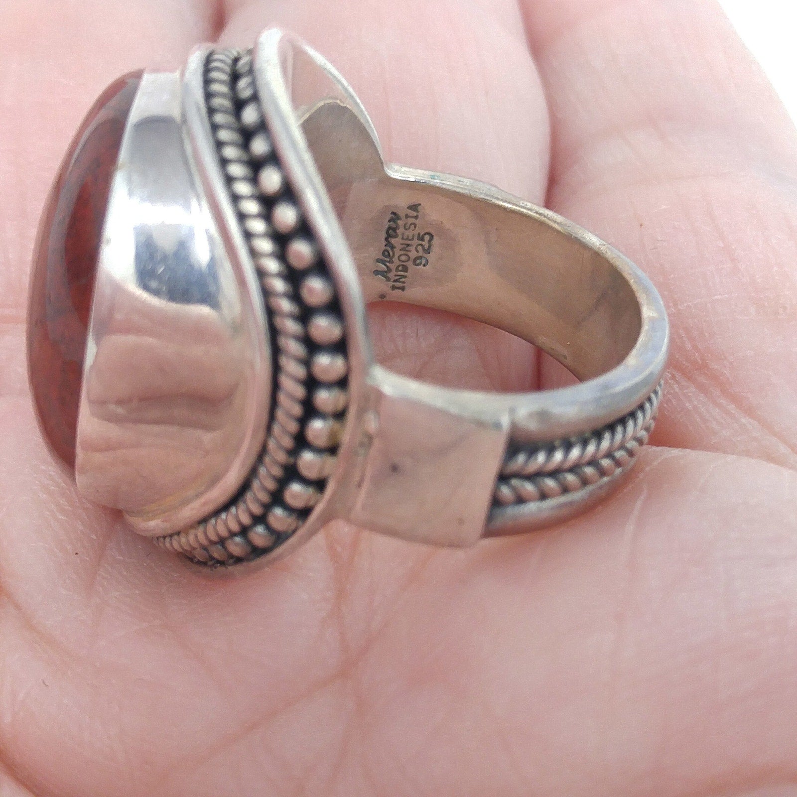 This is a gorgeous Meran Indonesia sterling silver ring featuring a large polished red gemstone. Tested on the Presidium Gem Tester, the stone falls in the quartz/spinel range. The ring showcases a bold statement design, with detailed silver beadwork around the bezel and a wide, comfortable band.