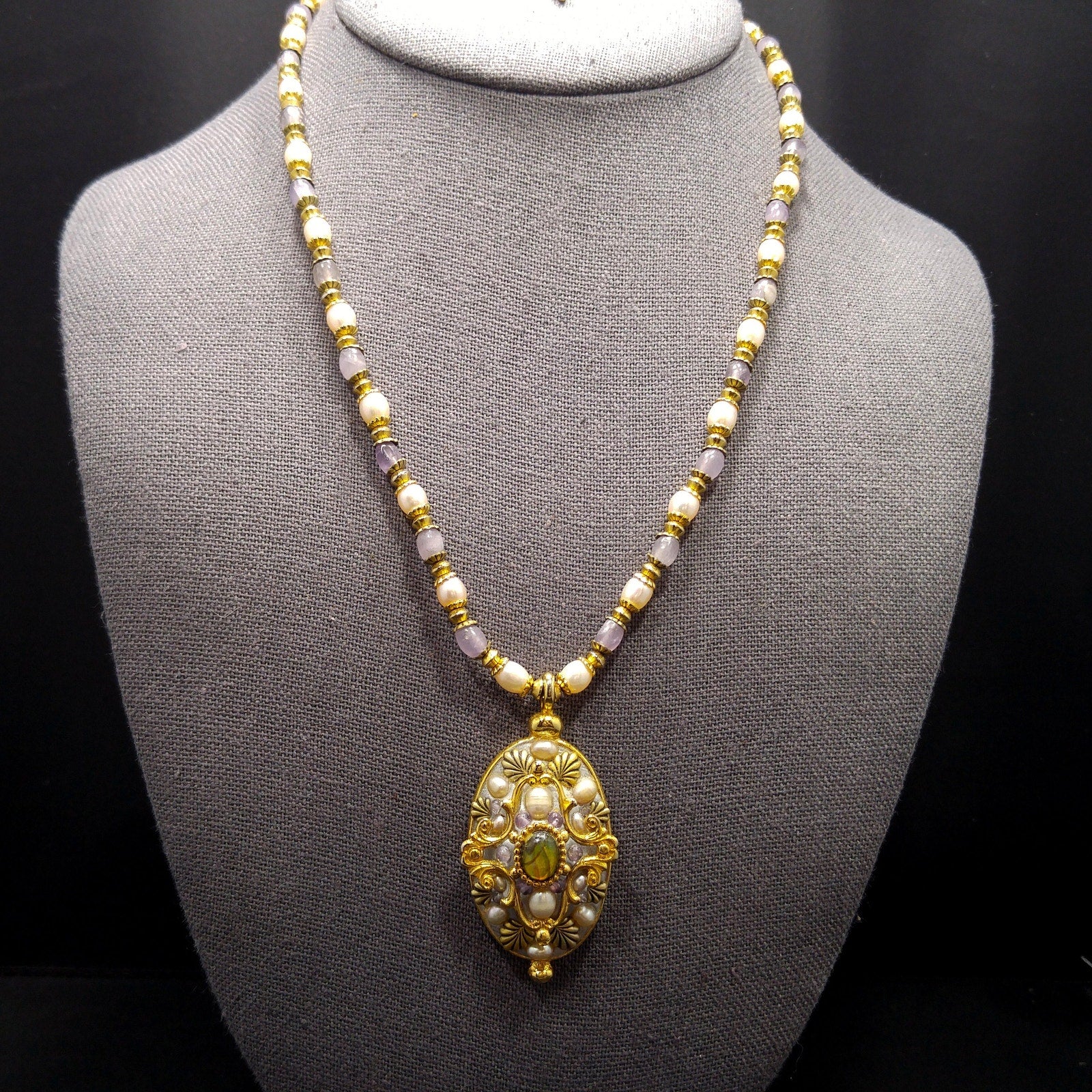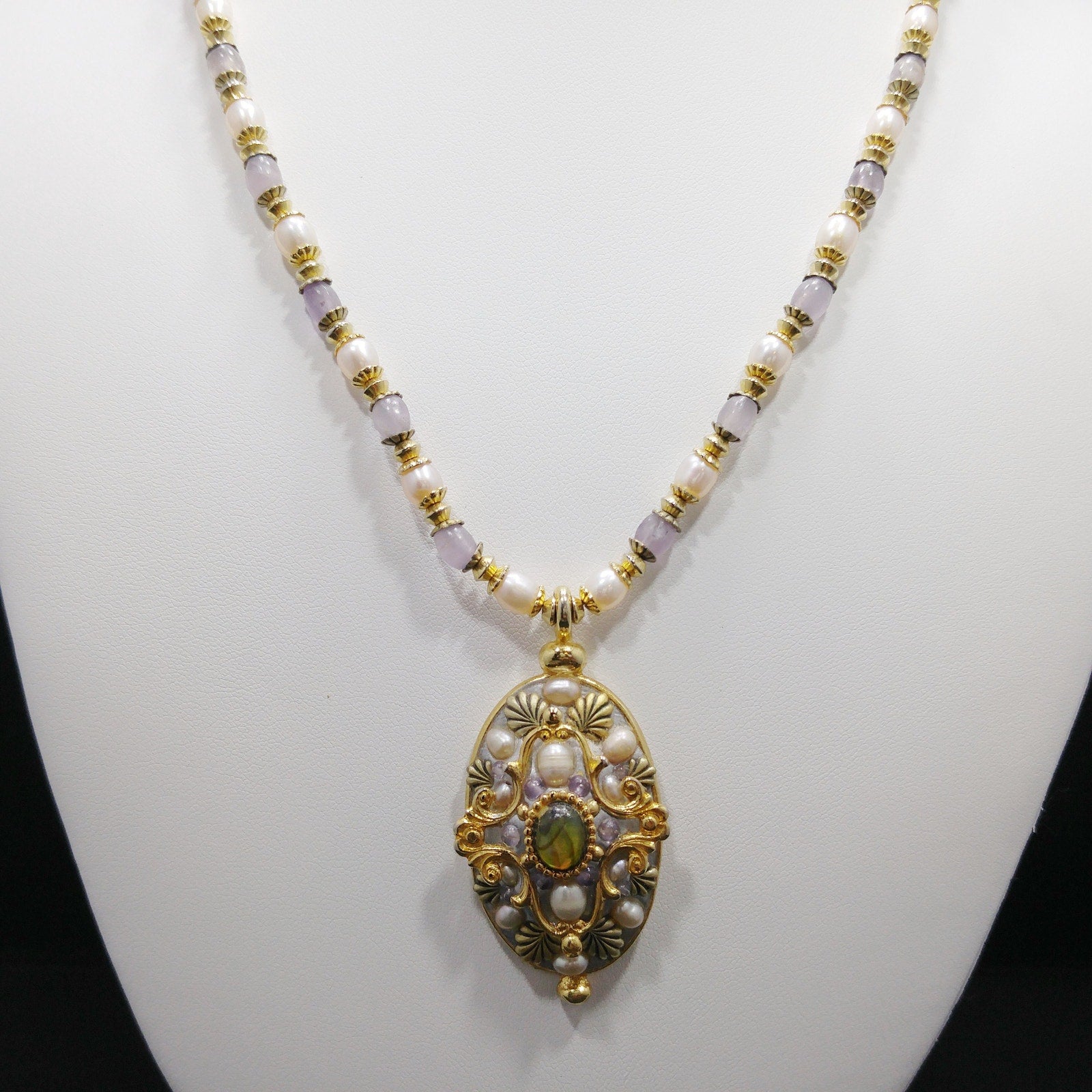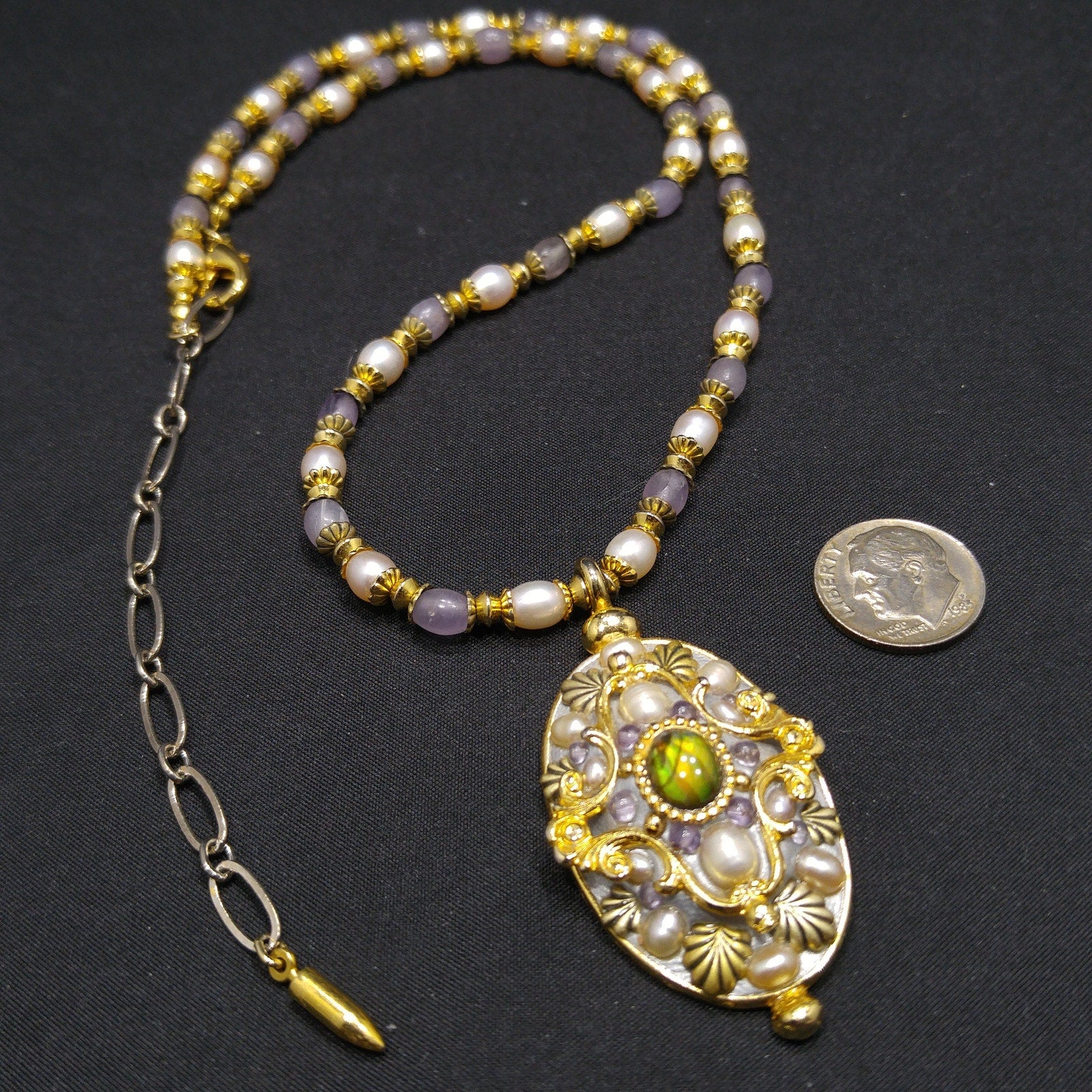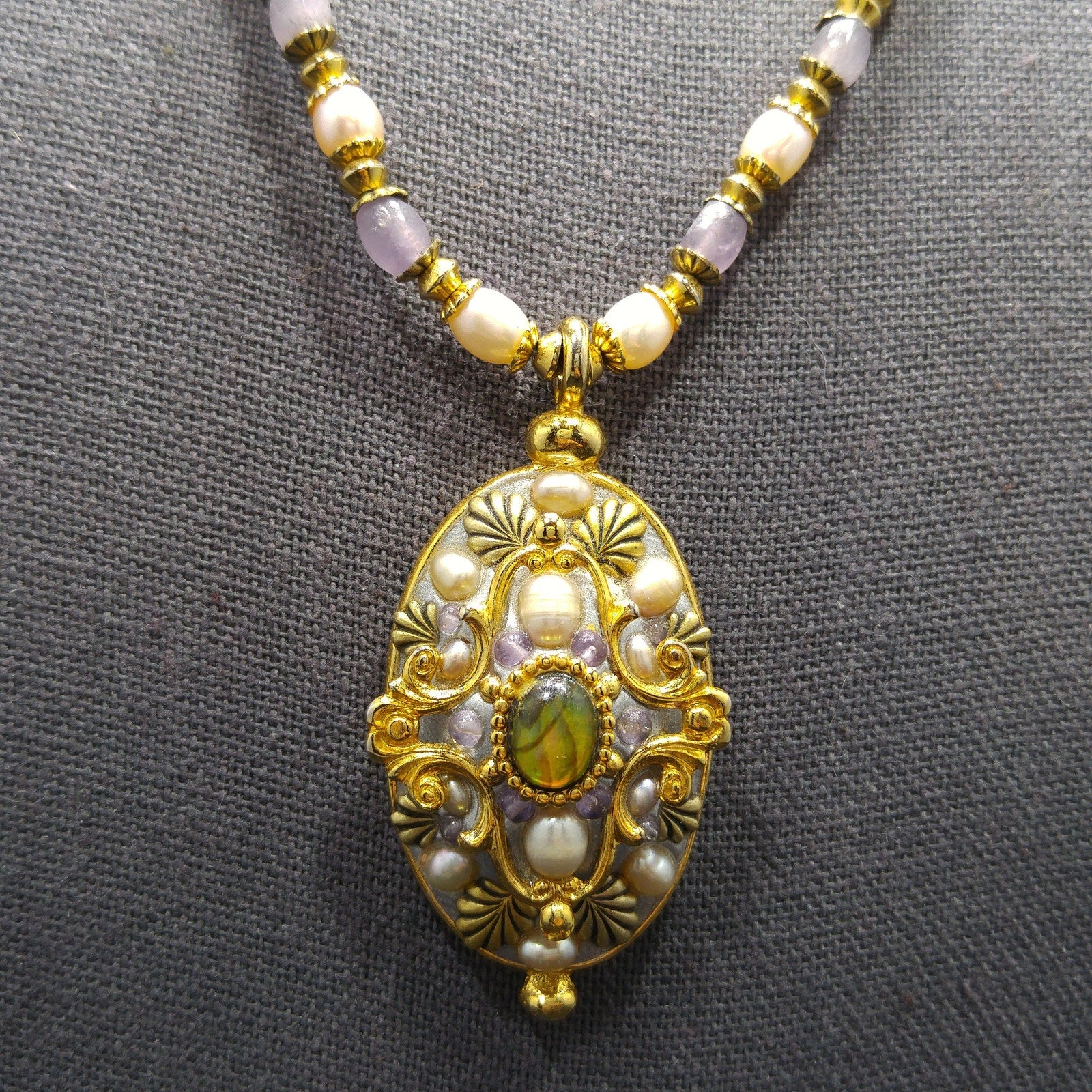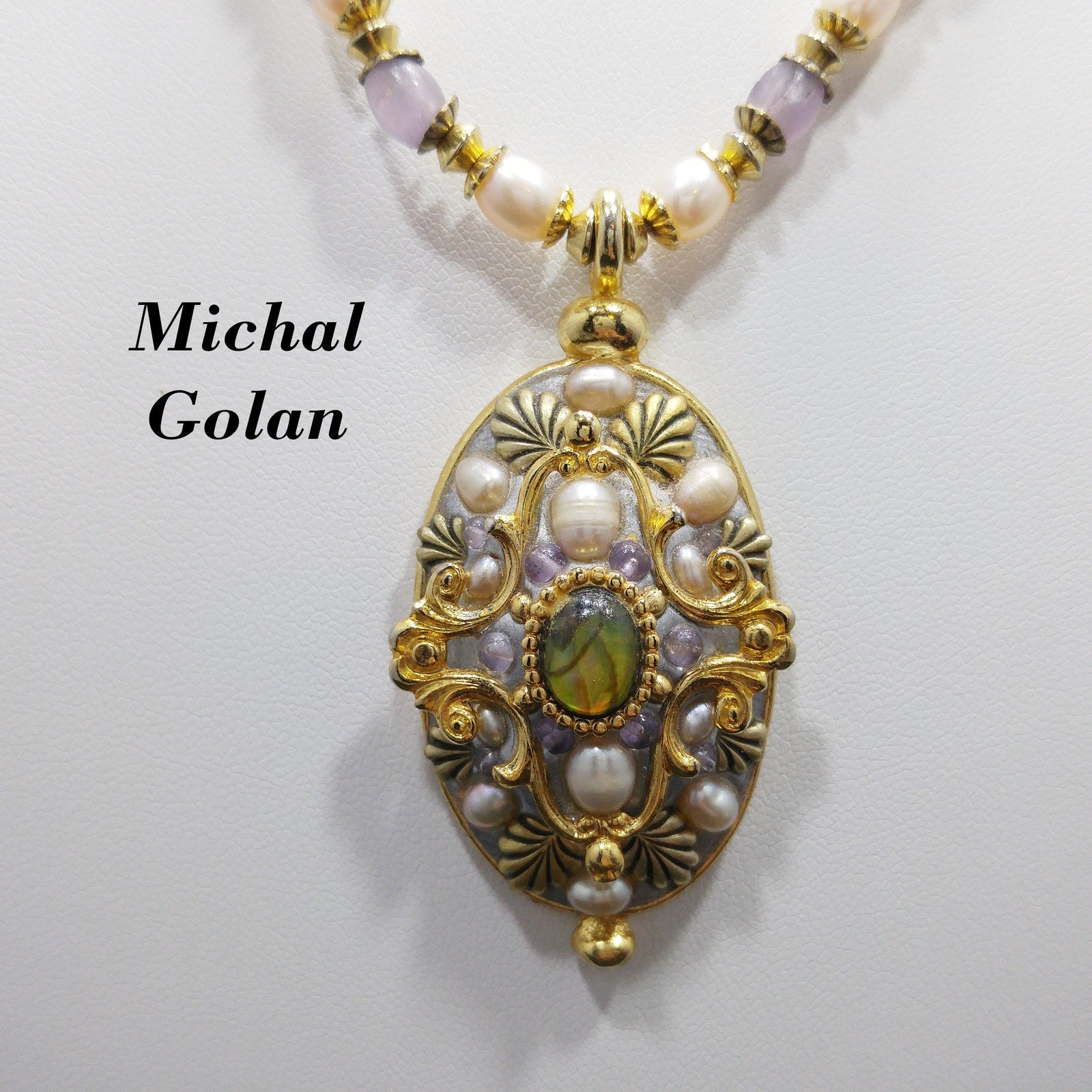 *Description: This is a beautiful vintage Michal Golan artisan pendant necklace with amethyst and faux pearls on a gold plated pendant necklace. This is a "one of a kind" Michal Golan pendant necklace. Her studio is in NYC. Michal Golan is a jewelry artist who makes each item by hand. The faux pearls may be real but tested as glass. The center cabochons appears to be an abalone cab. The gold plating accents the artistry of the pendant. All of her pieces are unique and beautiful. This would be a great addition to your vintage jewelry collection or make a great vintage gift!