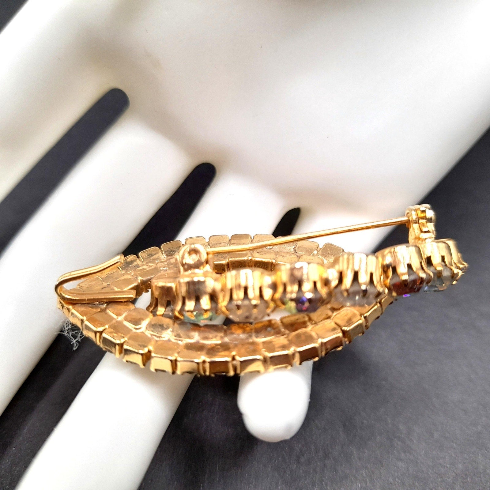 Mid-Century Aurora Borealis Pendant Brooch, Gold Plated, Prong Set Stones, 1960s Vintage Jewelry