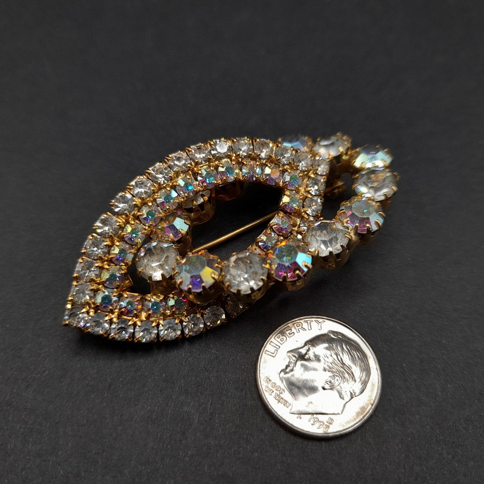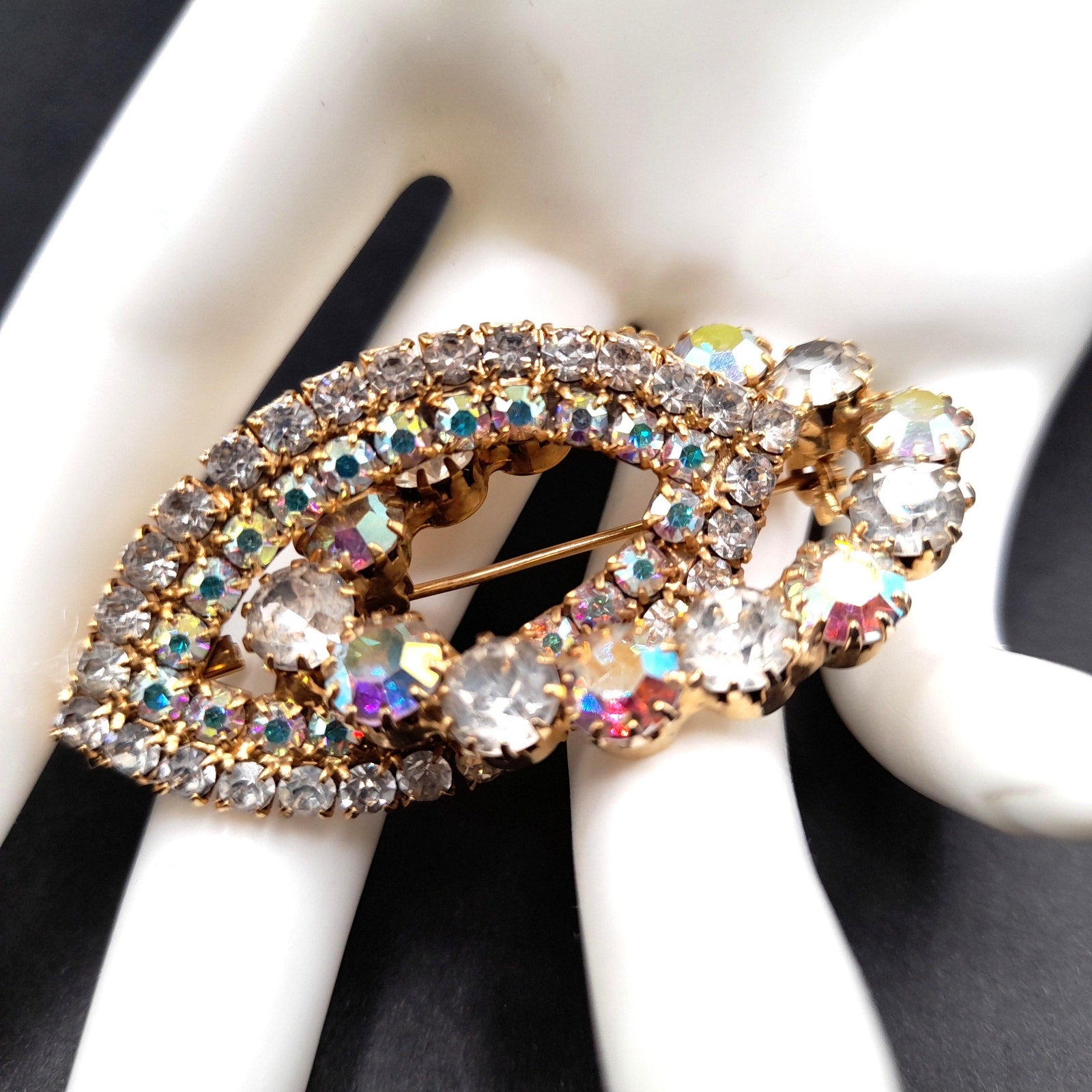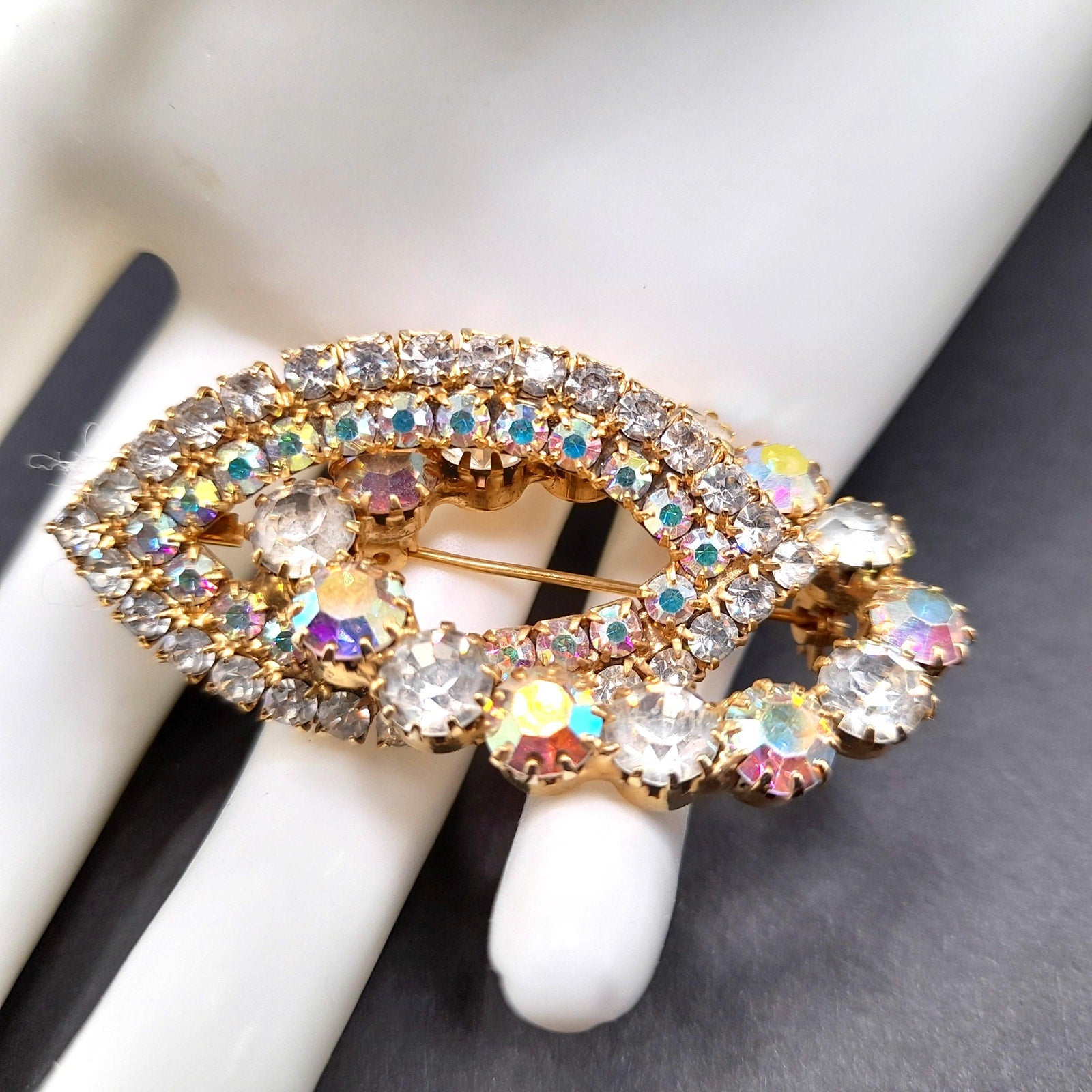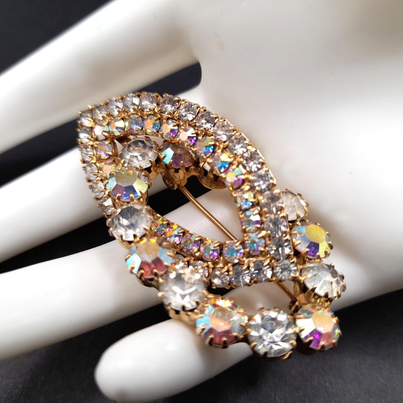 *Description: This is a beautiful mid-century aurora borealis and clear rhinestone pendant and brooch with a hook clasp for the pendant and a rolling c clasp for the brooch on a gold plated backing from the late 1950s to 1960s. There are rows of aurora borealis rhinestones mixed with clear rhinestones, all prong set and over lapping sections in a three dimensional design. All of the rhinestones are in place and it is a gorgeous piece of vintage jewelry which would look lovely at any formal event or when you want to add a bit of glitz and glamour. This would be a great addition to your vintage jewelry collection or make a great vintage gift!