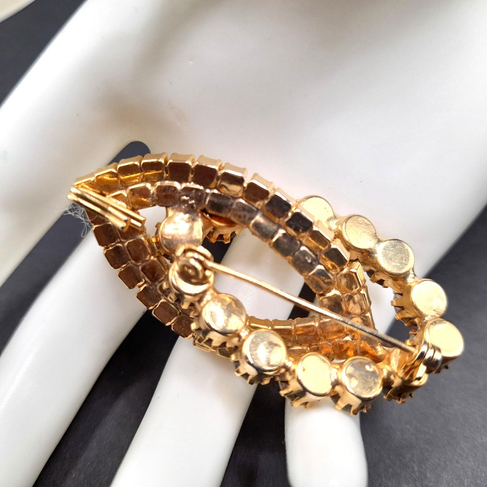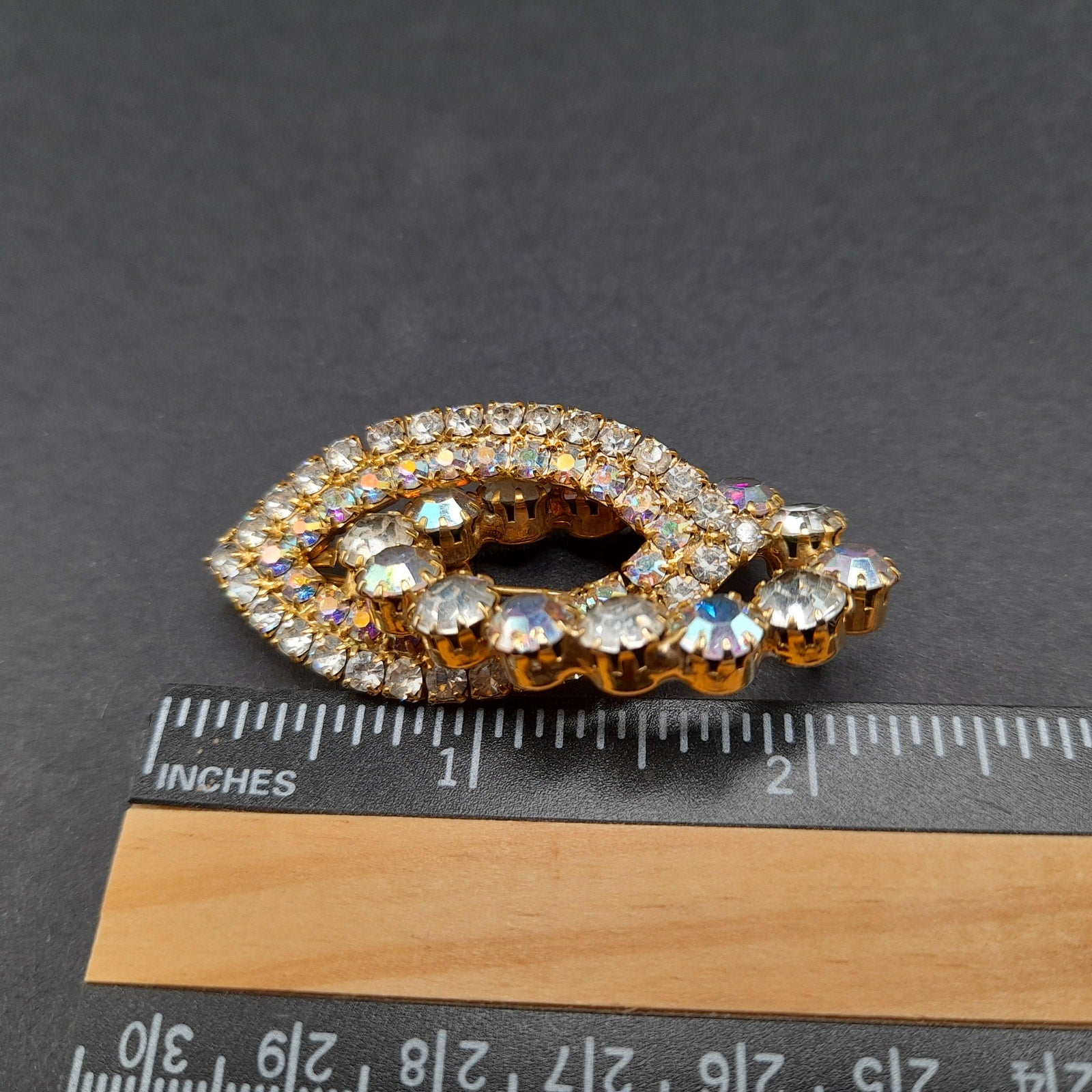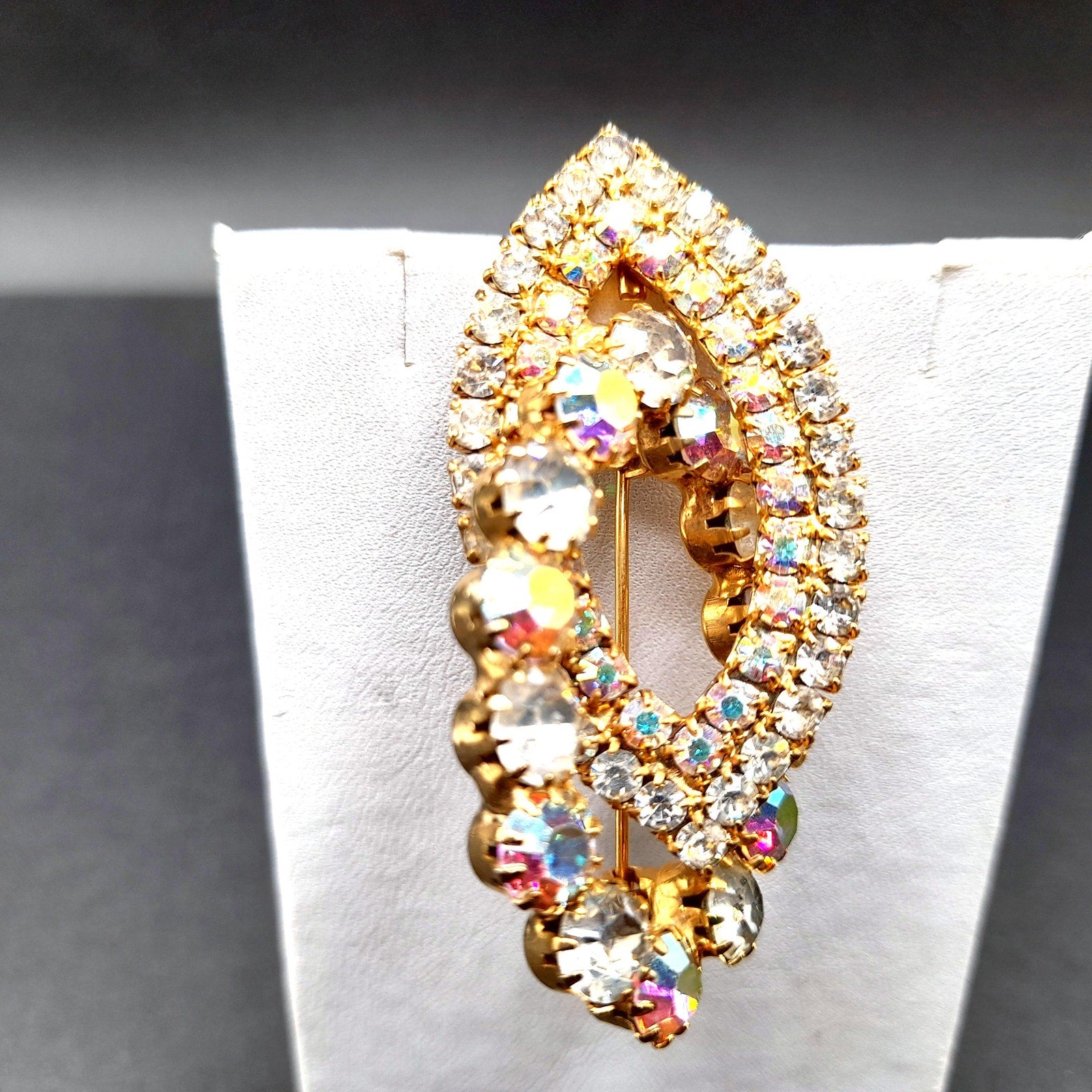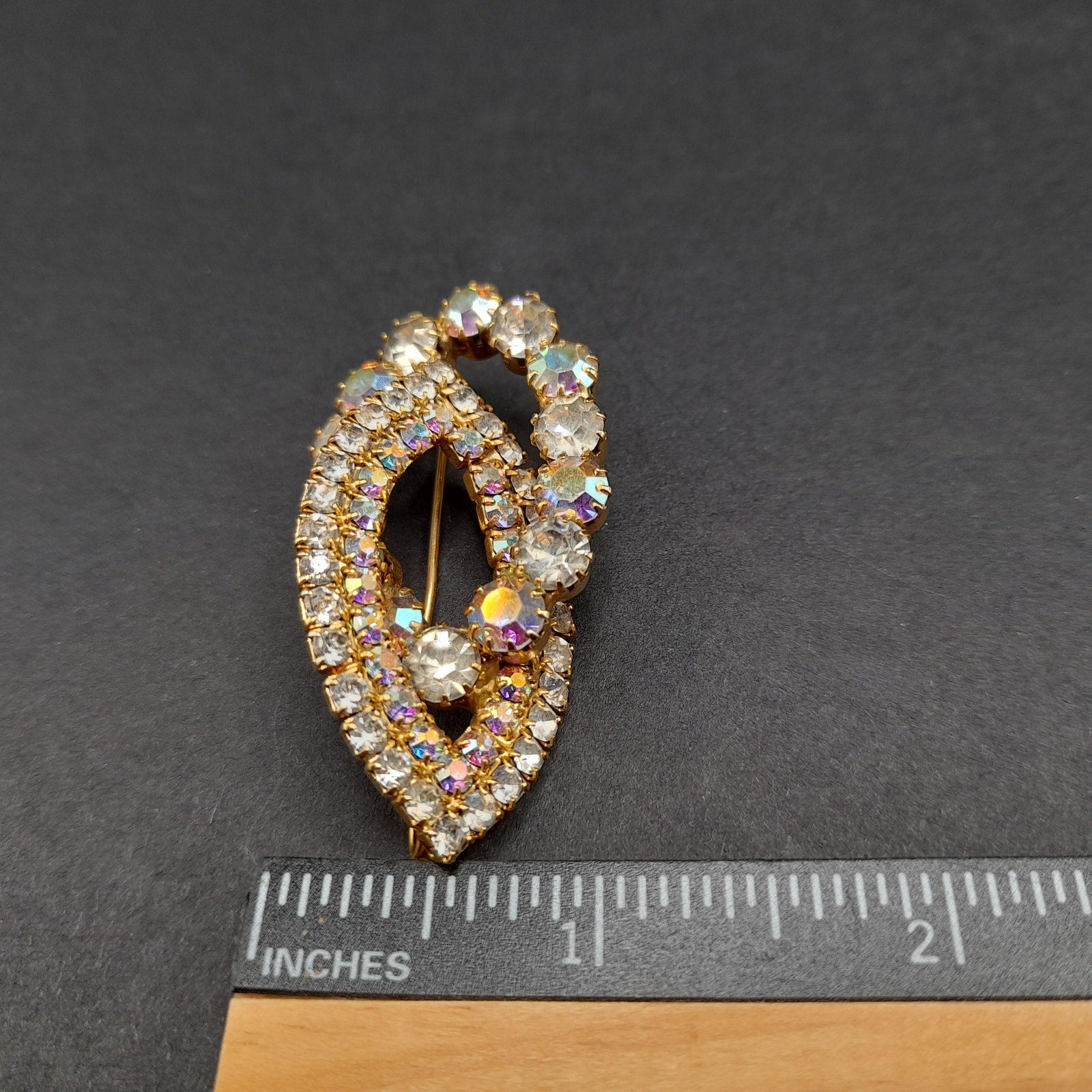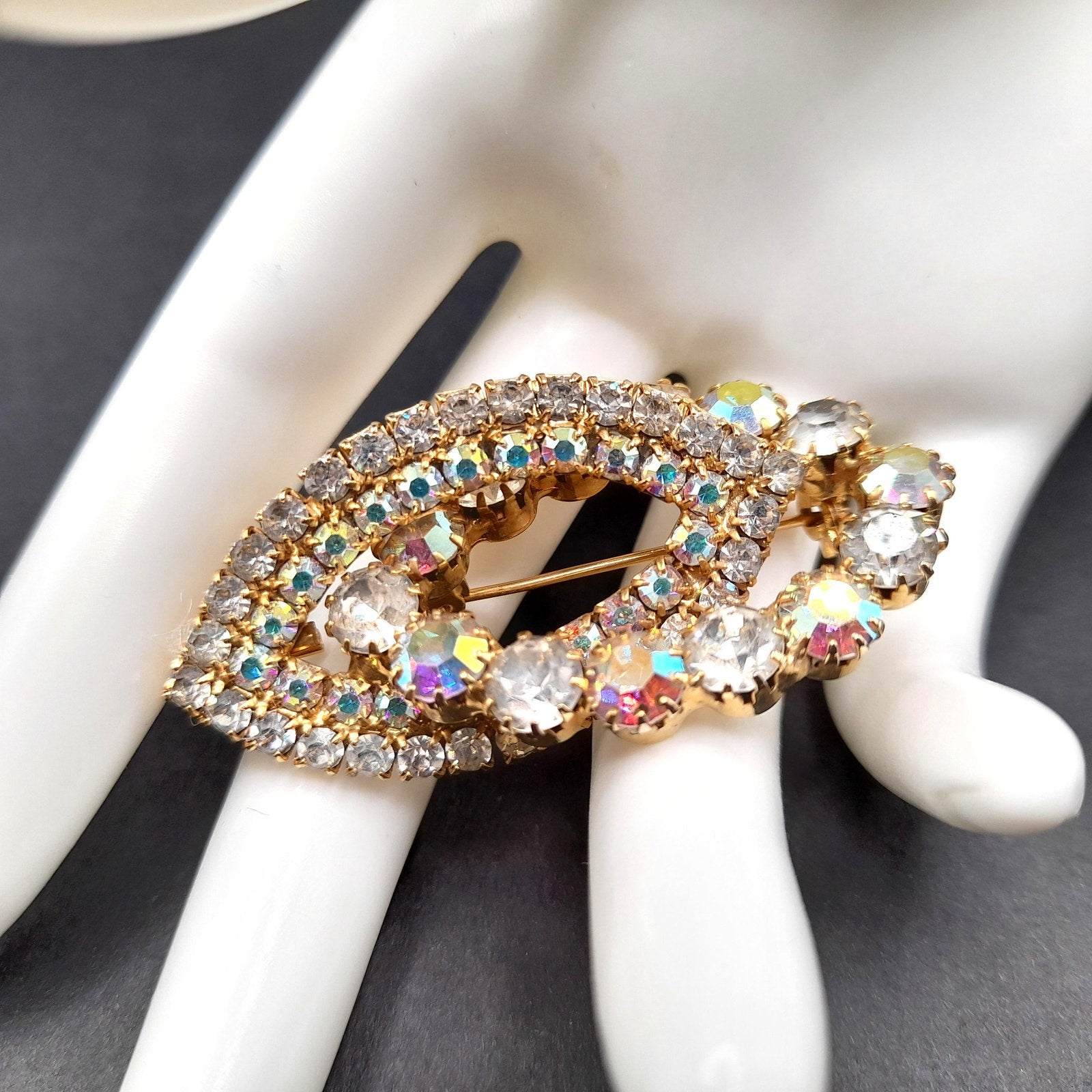 *Description: This is a beautiful mid-century aurora borealis and clear rhinestone pendant and brooch with a hook clasp for the pendant and a rolling c clasp for the brooch on a gold plated backing from the late 1950s to 1960s. There are rows of aurora borealis rhinestones mixed with clear rhinestones, all prong set and over lapping sections in a three dimensional design. All of the rhinestones are in place and it is a gorgeous piece of vintage jewelry which would look lovely at any formal event or when you want to add a bit of glitz and glamour. This would be a great addition to your vintage jewelry collection or make a great vintage gift!