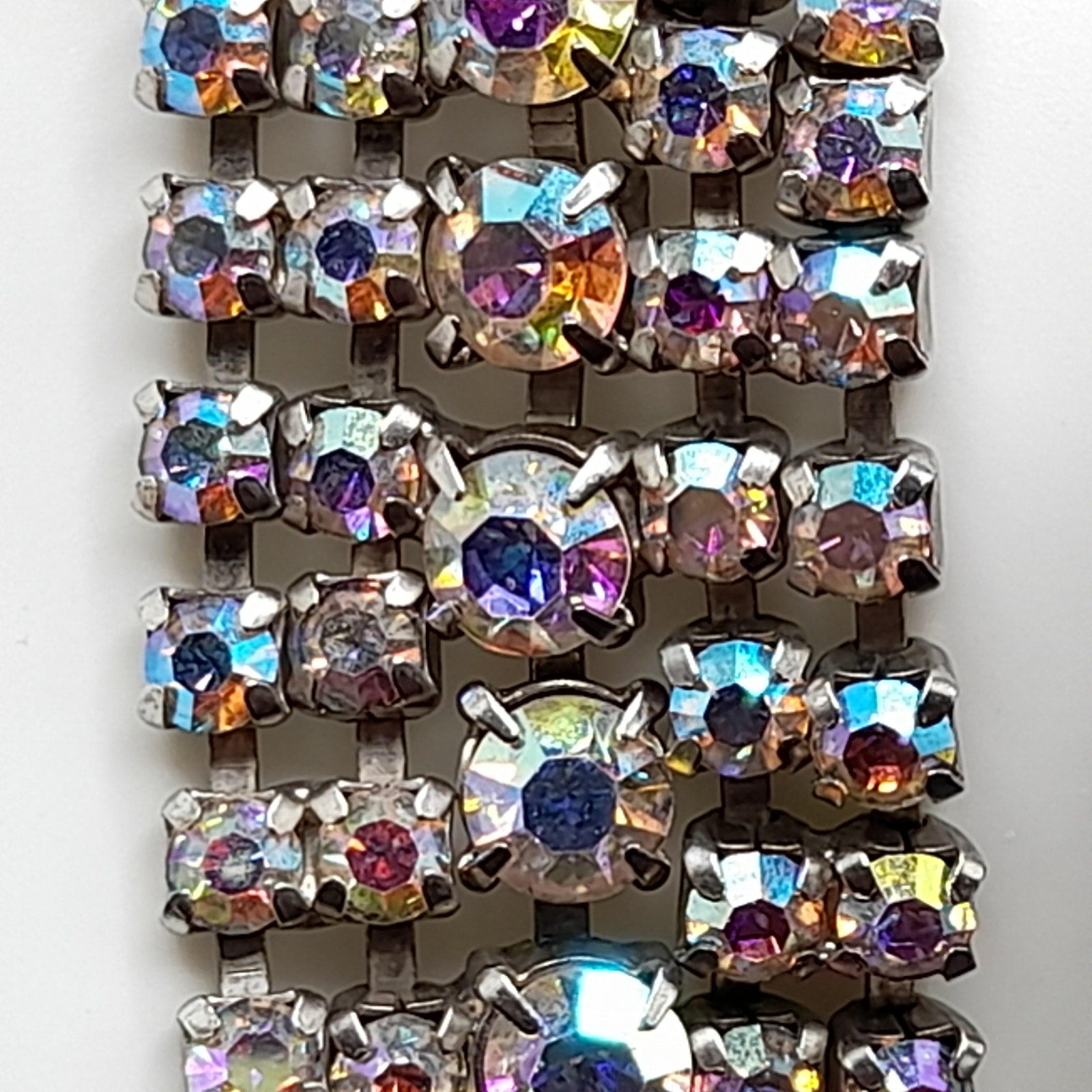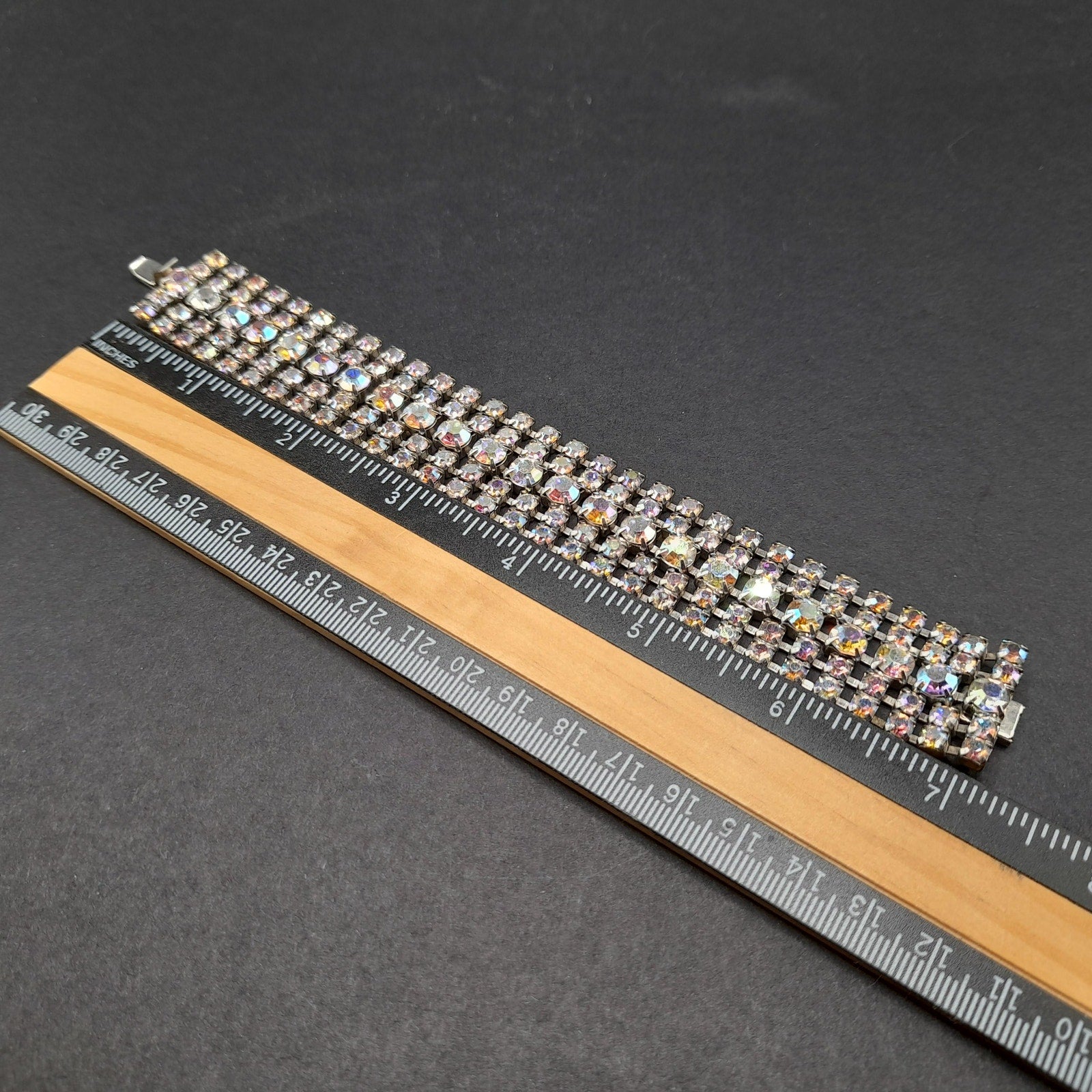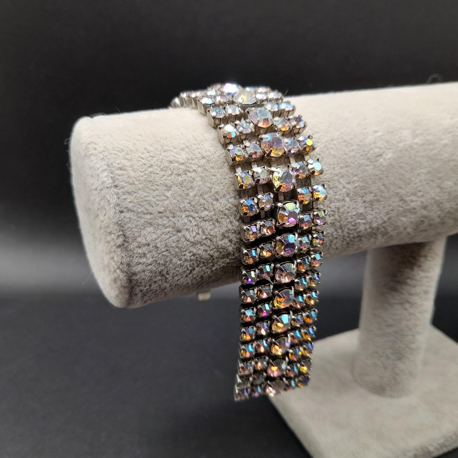 *Description: This is a gorgeous mid-century aurora borealis rhinestone bracelet which is wonderful as a wedding or formal bracelet from the 1960s. The bracelet has five rows of rhinestones running down the length of the bracelet with the center row a larger rhinestone. The AB rhinestones are full of sparkle. The rhinestones are on a silver tone background. This would be a great addition to your vintage jewelry collection or make a great vintage gift!