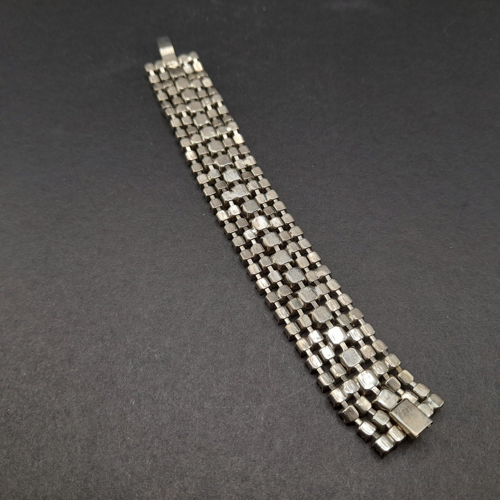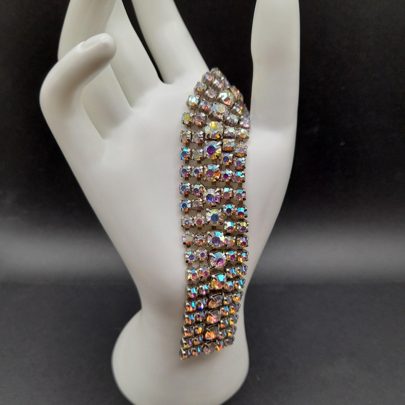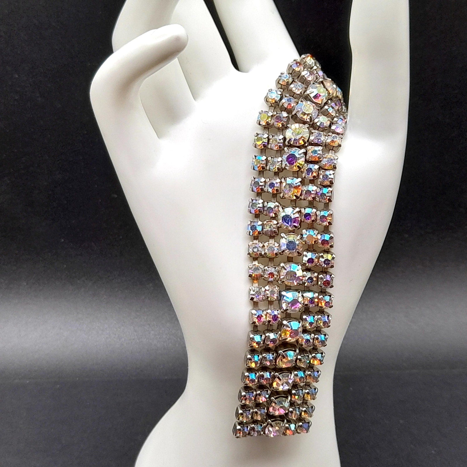 *Description: This is a gorgeous mid-century aurora borealis rhinestone bracelet which is wonderful as a wedding or formal bracelet from the 1960s. The bracelet has five rows of rhinestones running down the length of the bracelet with the center row a larger rhinestone. The AB rhinestones are full of sparkle. The rhinestones are on a silver tone background. This would be a great addition to your vintage jewelry collection or make a great vintage gift!