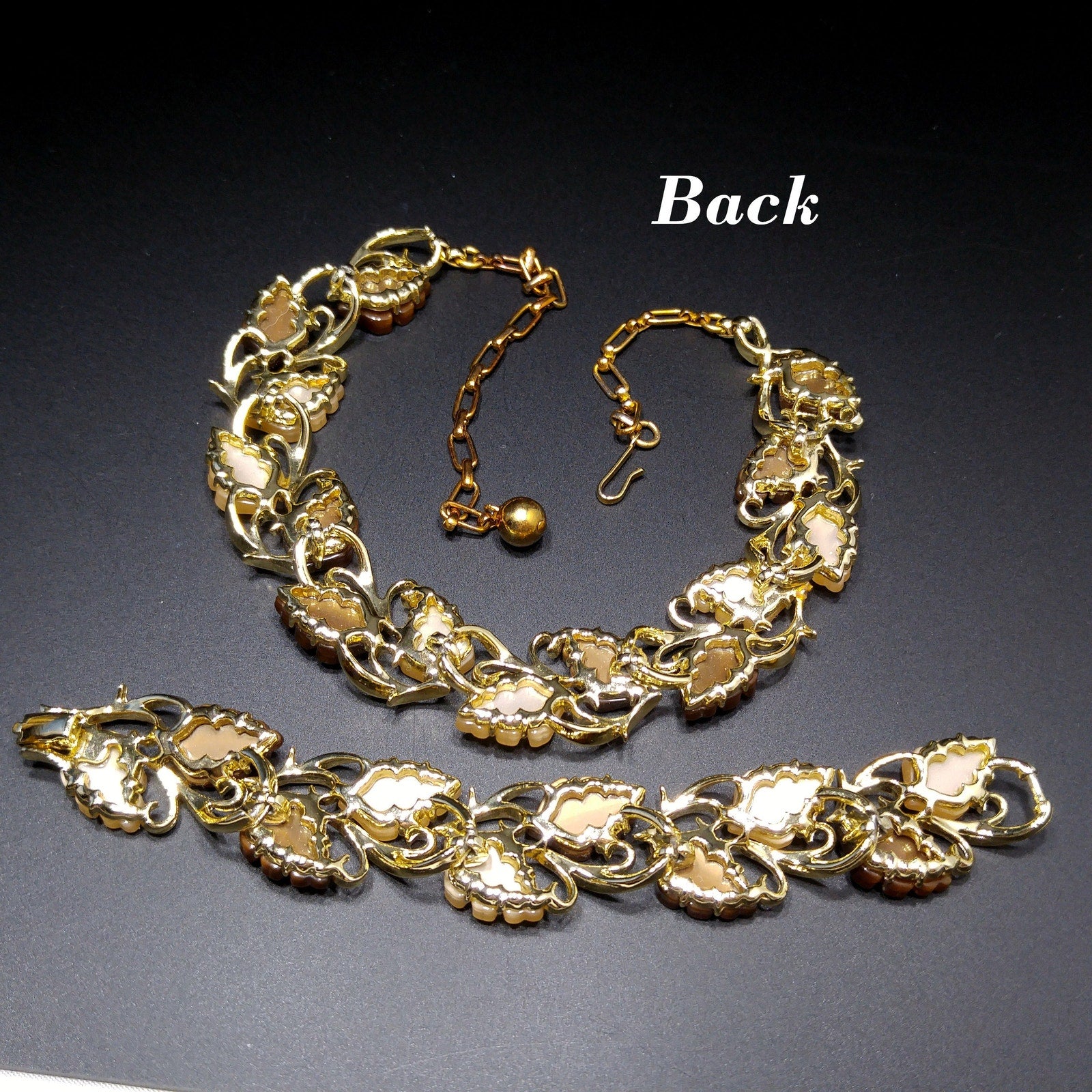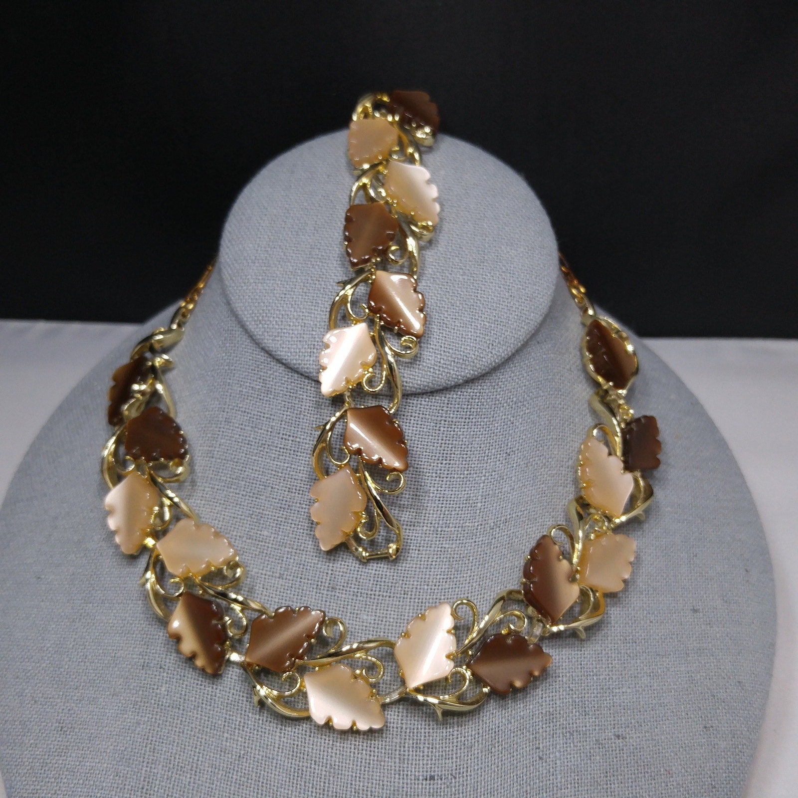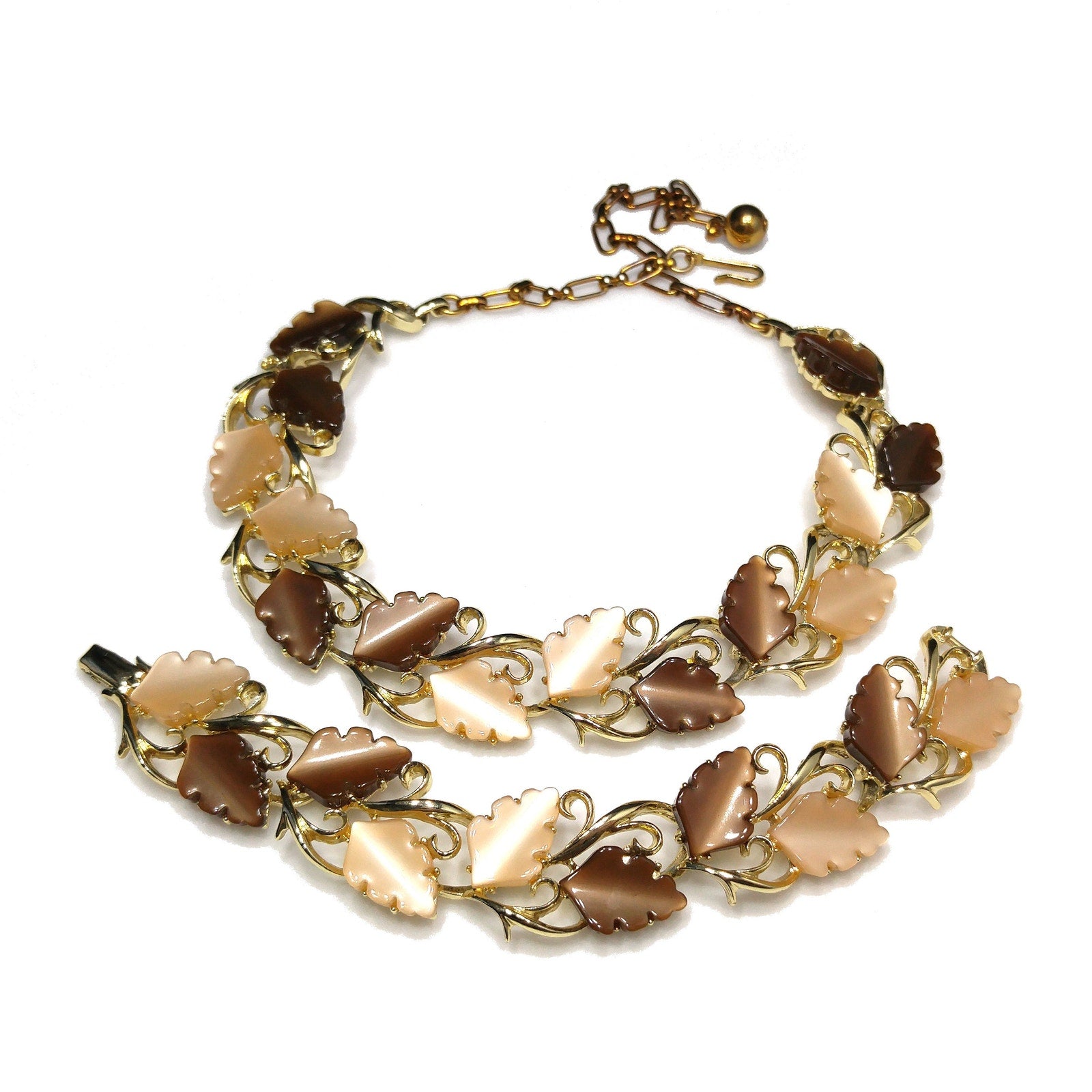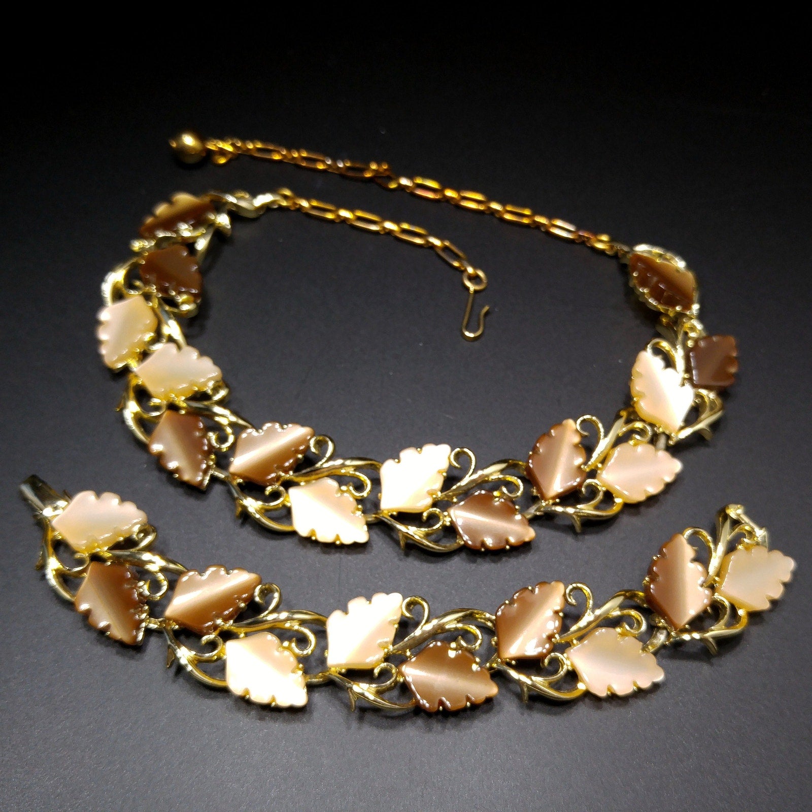 Mid-Century Beige Brown Moonglow Leaves Necklace Bracelet Set, Lucite Jewelry, 1950s Vintage Jewelry