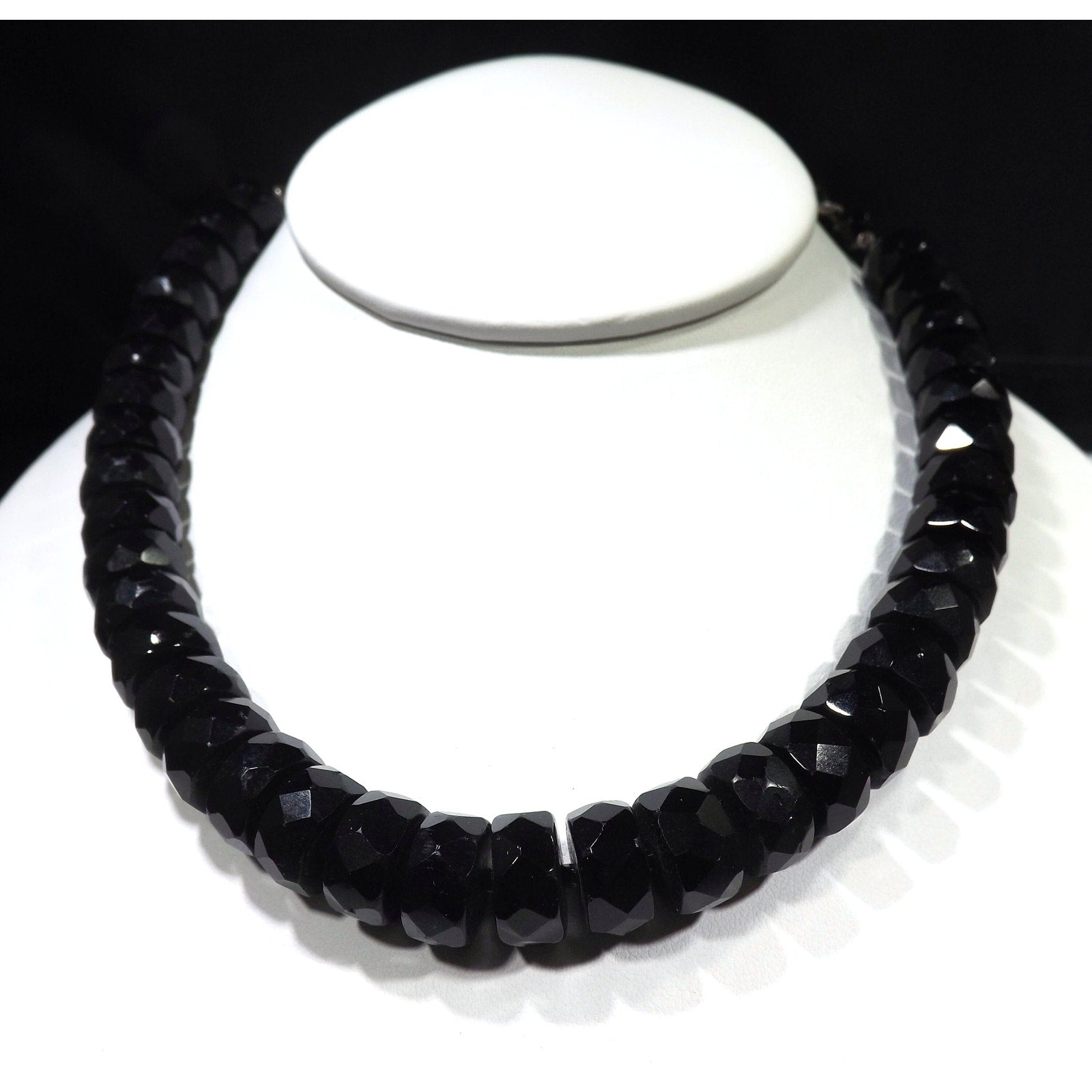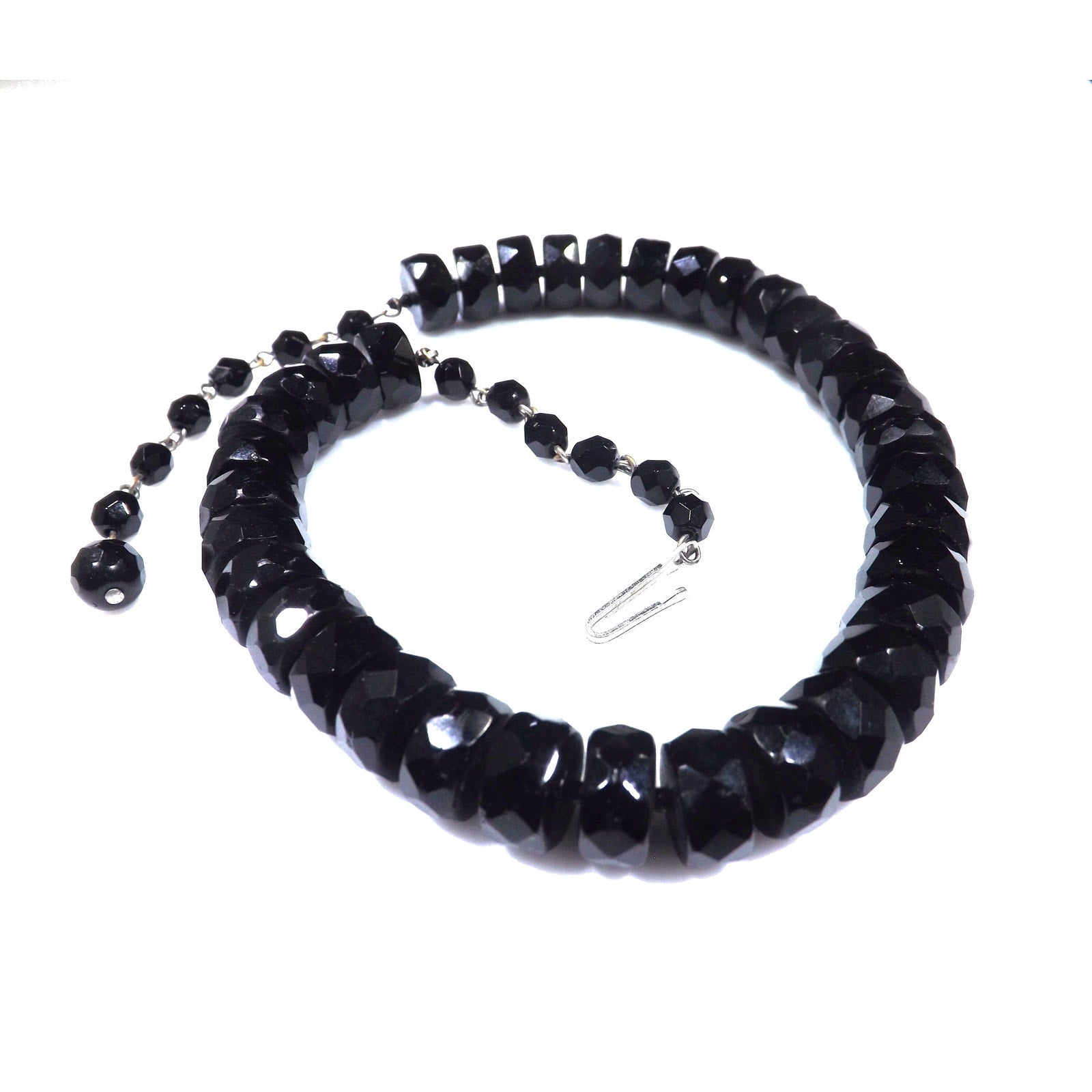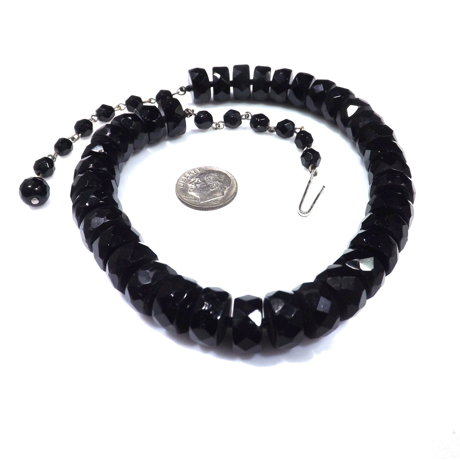 *Description: This is a beautiful black crystal choker necklace with unique cut beads from the 1950s. Each of the larger beads are 12mm wide and 6mm thick and look to be hand cut. They are strung on black silk thread with a black seed bead in between. The beads could be black crystal or onyx. You can see the hand cutting between the beads. These are the perfect beads to wear with your little black dress or your favorite outfit. This would be a great addition to your vintage jewelry collection or make a great vintage gift!