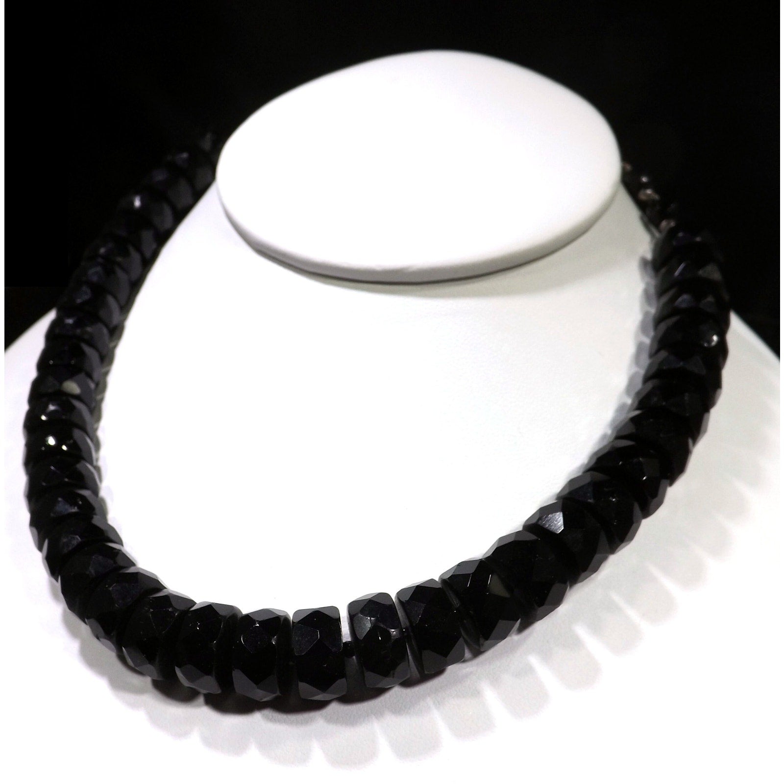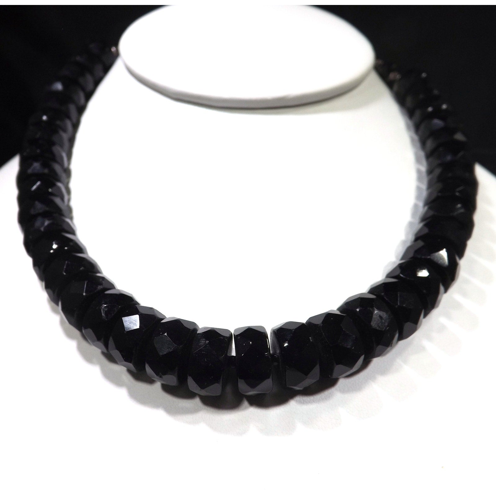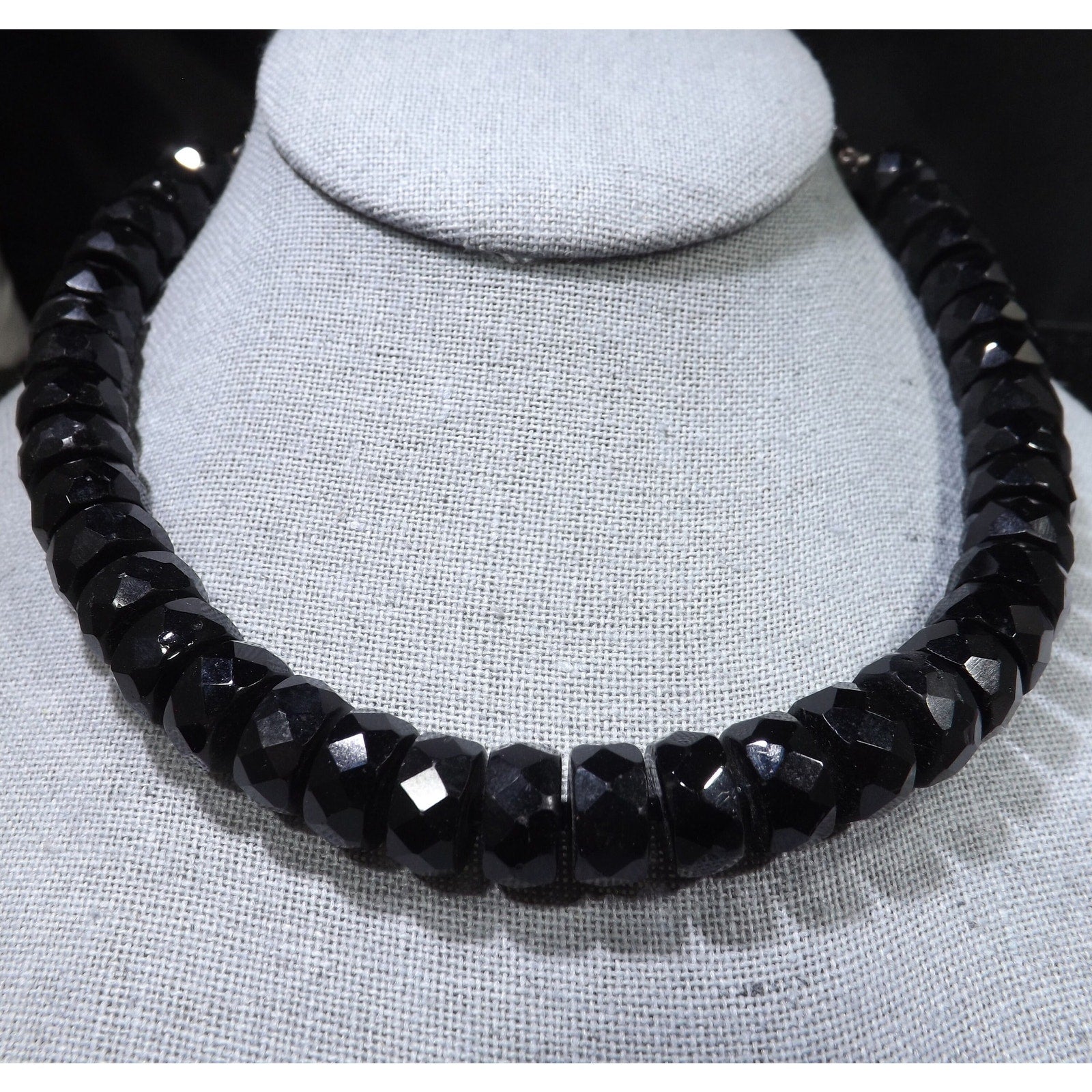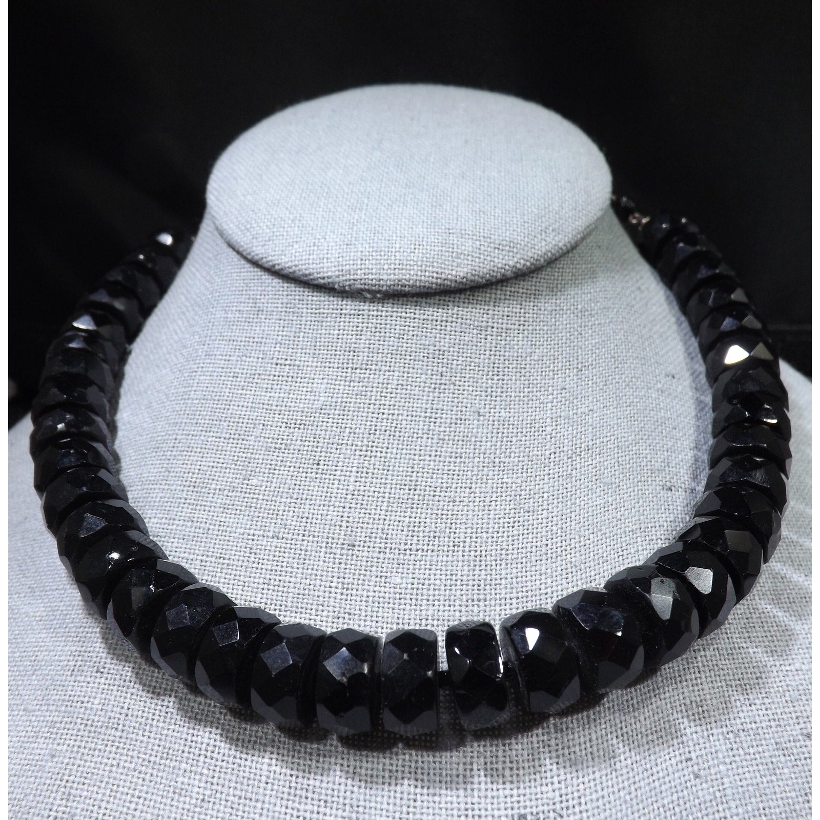 *Description: This is a beautiful black crystal choker necklace with unique cut beads from the 1950s. Each of the larger beads are 12mm wide and 6mm thick and look to be hand cut. They are strung on black silk thread with a black seed bead in between. The beads could be black crystal or onyx. You can see the hand cutting between the beads. These are the perfect beads to wear with your little black dress or your favorite outfit. This would be a great addition to your vintage jewelry collection or make a great vintage gift!