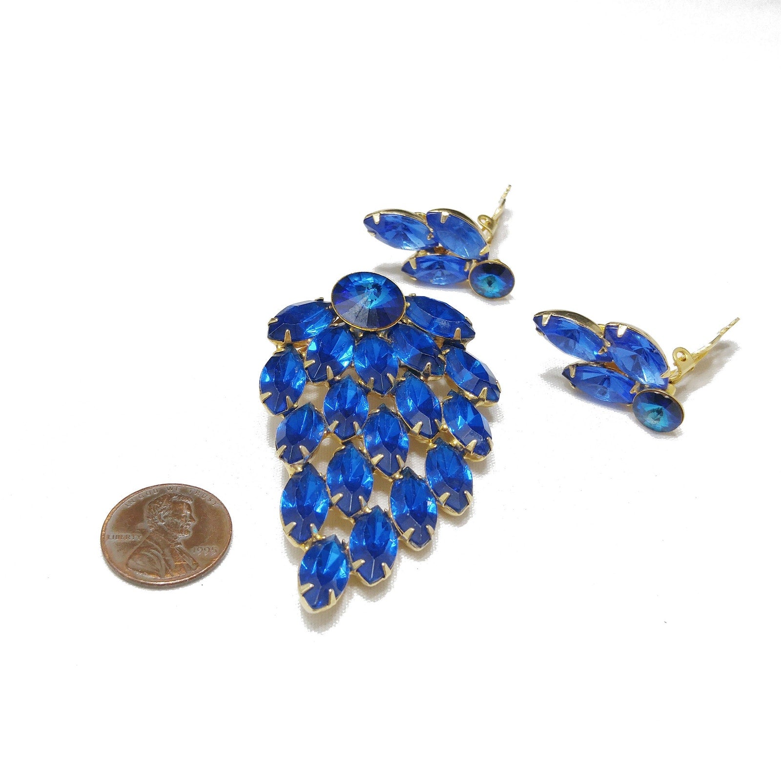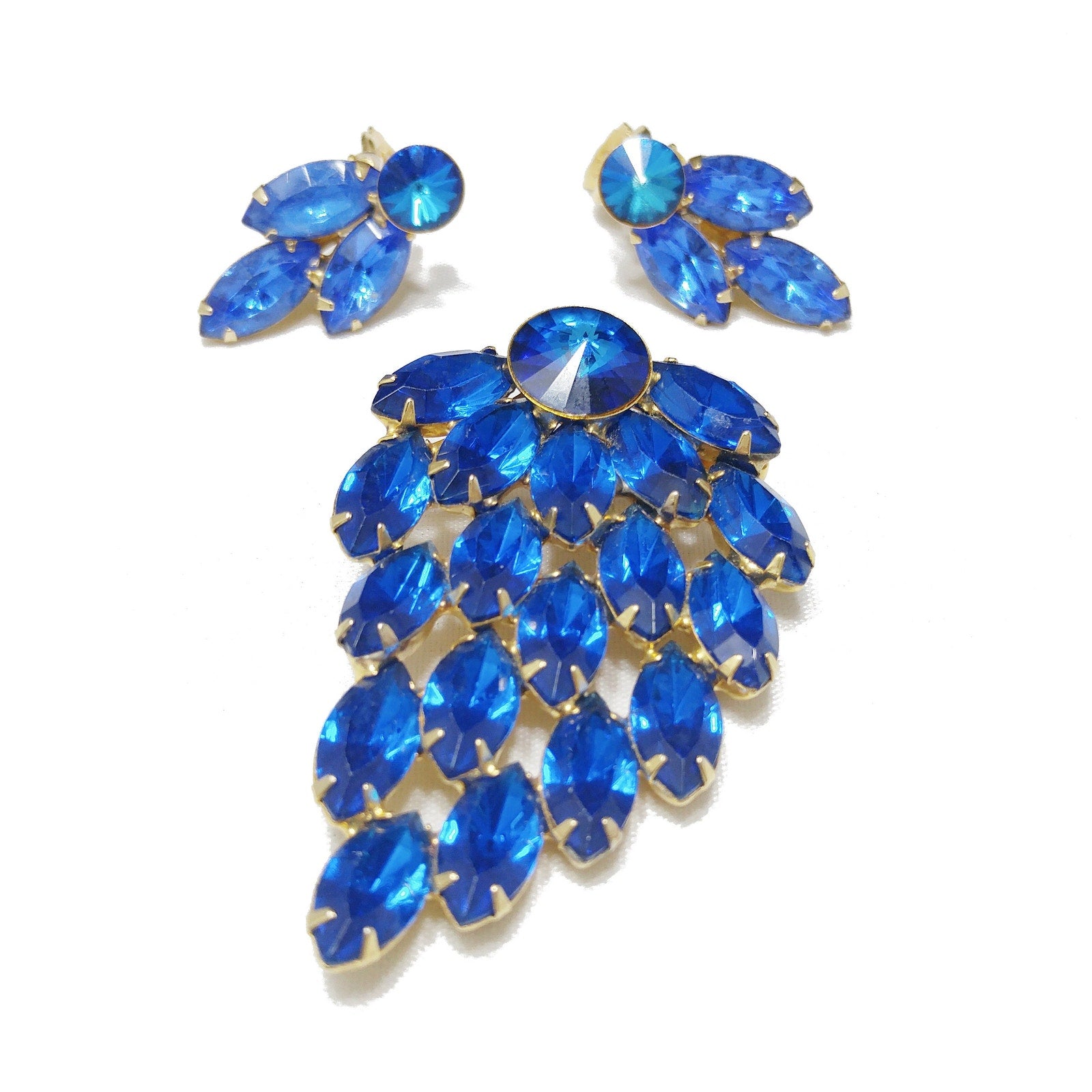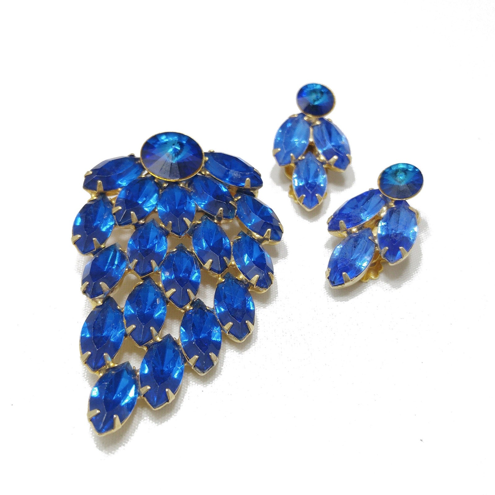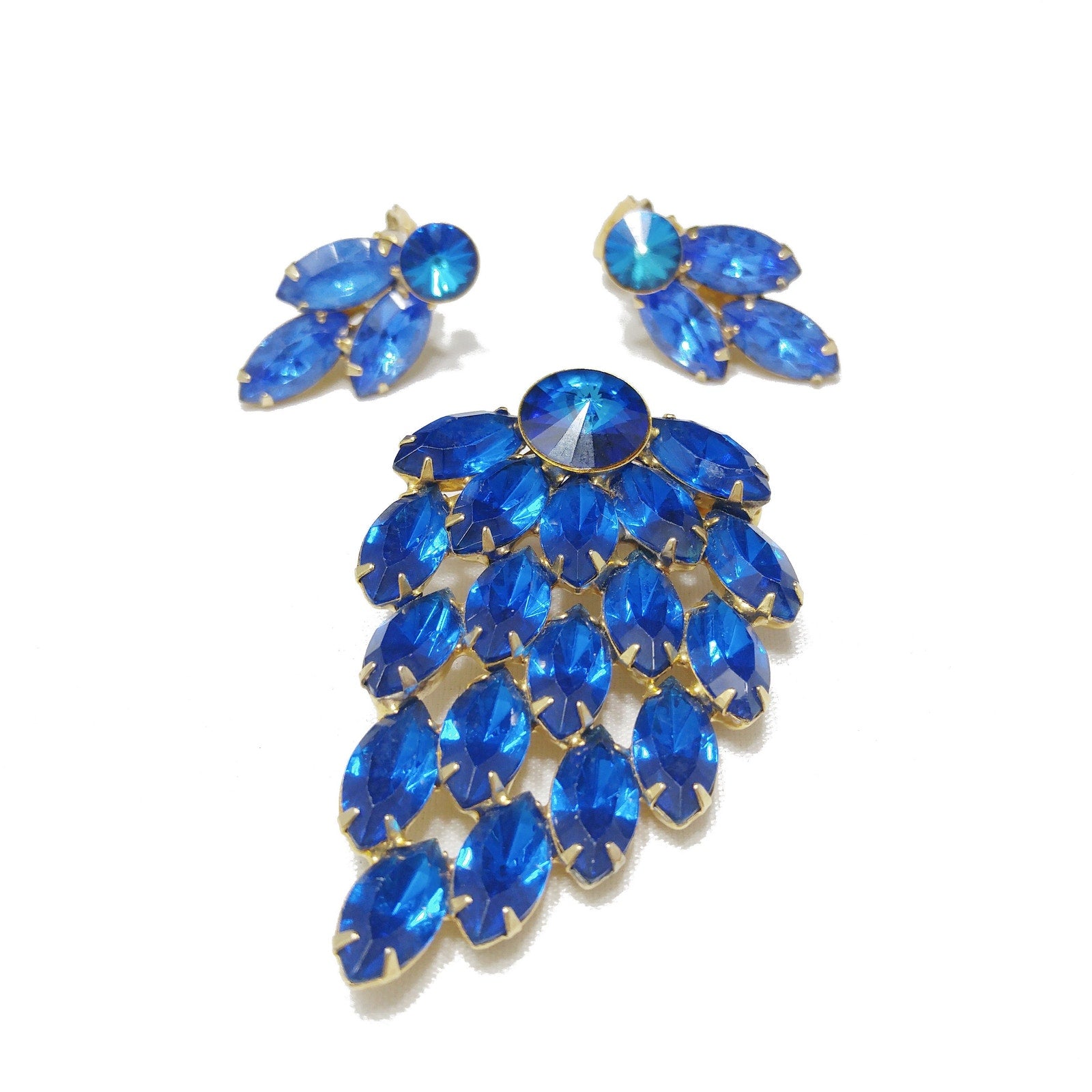 *Description: This is a gorgeous mid-century floral spray topped with a sparkling rivoli rhinestone on both the brooch and clip on earrings from the 1960s. The blue, with a touch of green, rivoili rhinestone is at the top of the design with blue marquise cut rhinetones completing the floral spray on the brooch. The matching clip on earrings have a smaller matching rivoli rhinestone with three blue marquise cut rhinestones as leaves. The rivoli rhinestones on all pieces are the same color. The marquise cut rhinestones on the earrings are a slight shade lighter blue which accentuates the rivoli stone. Each piece is gold plated on the back and each rhinestone is prong set. This is a beautiful shade of blue. It would be a great addition to your vintage jewelry collection or make a great vintage gift!