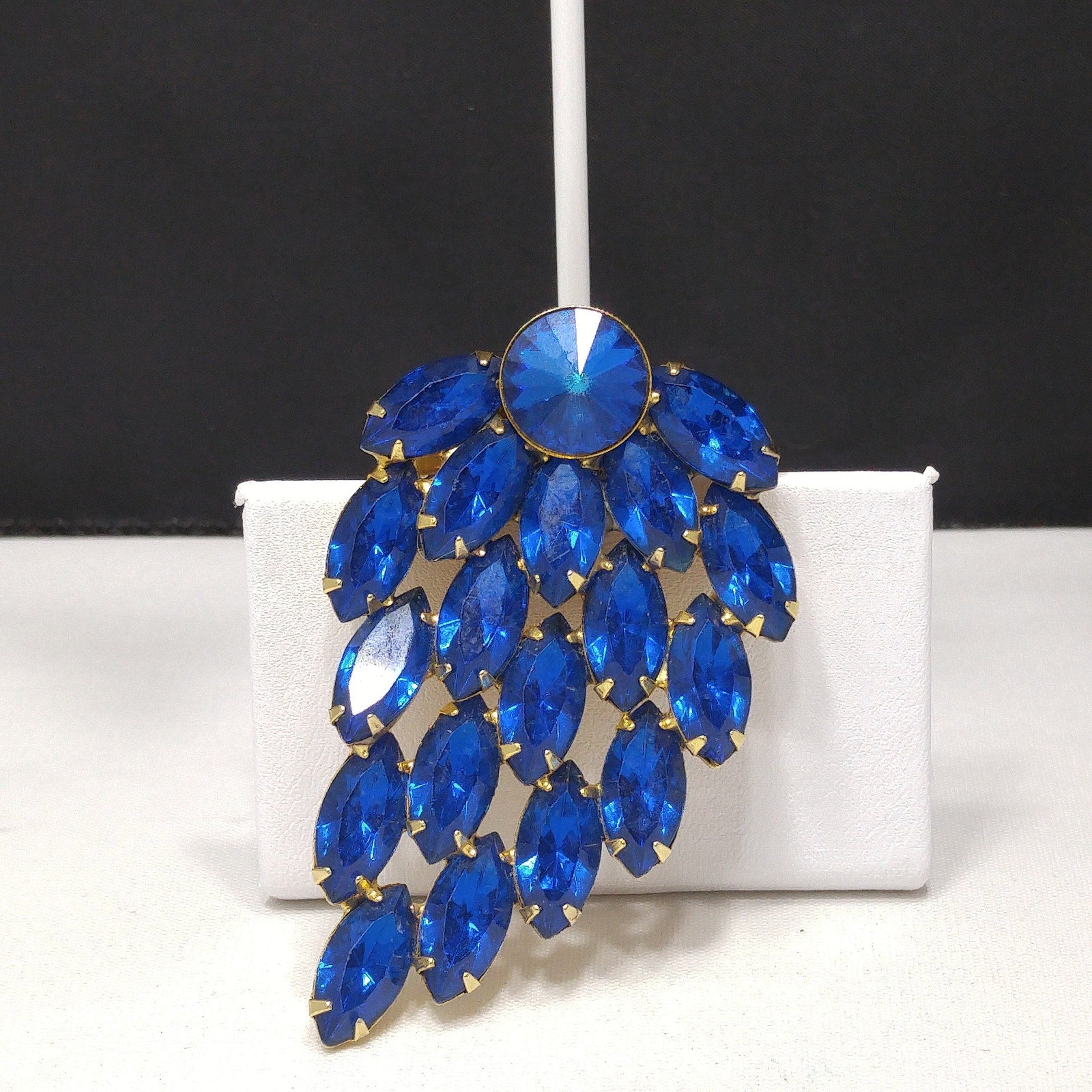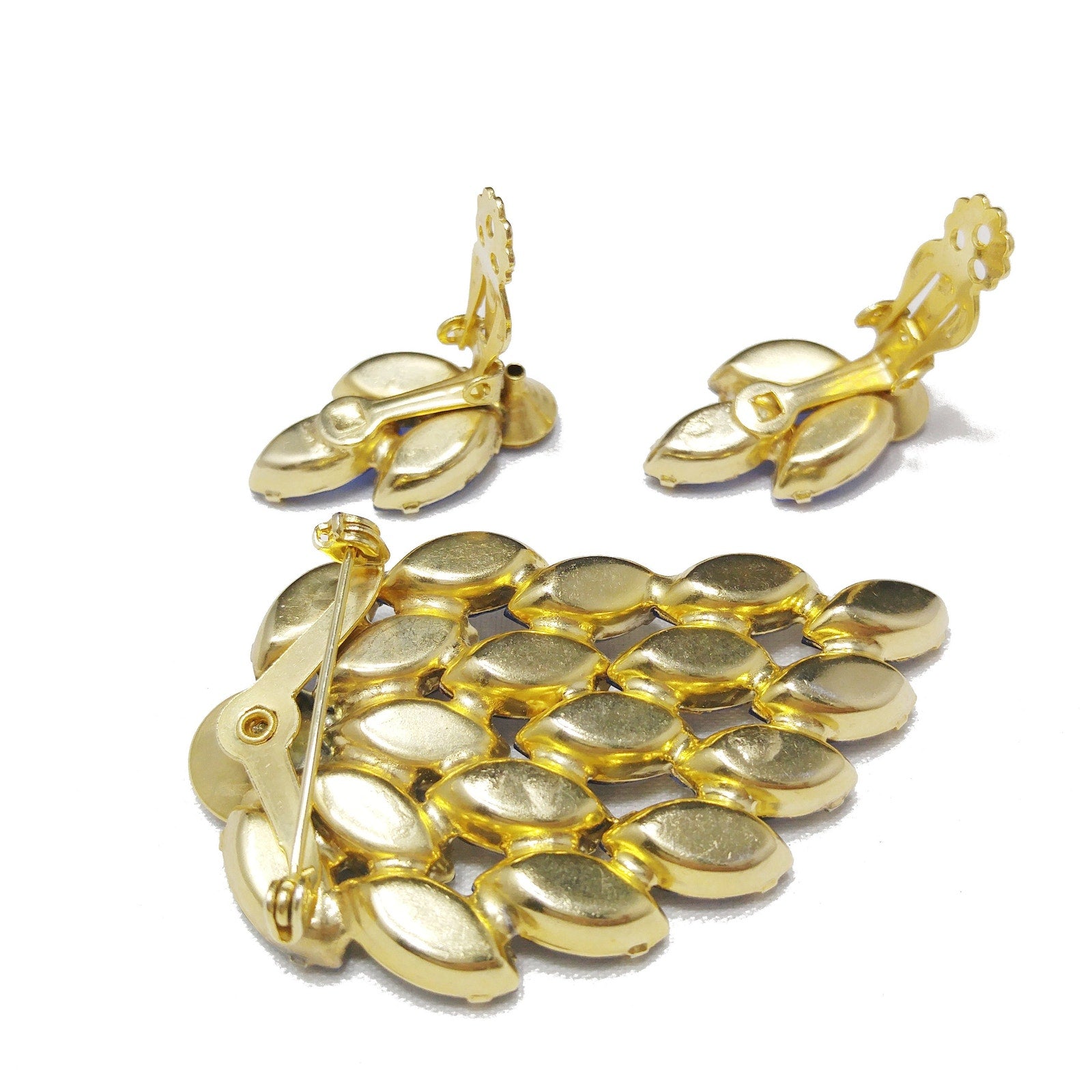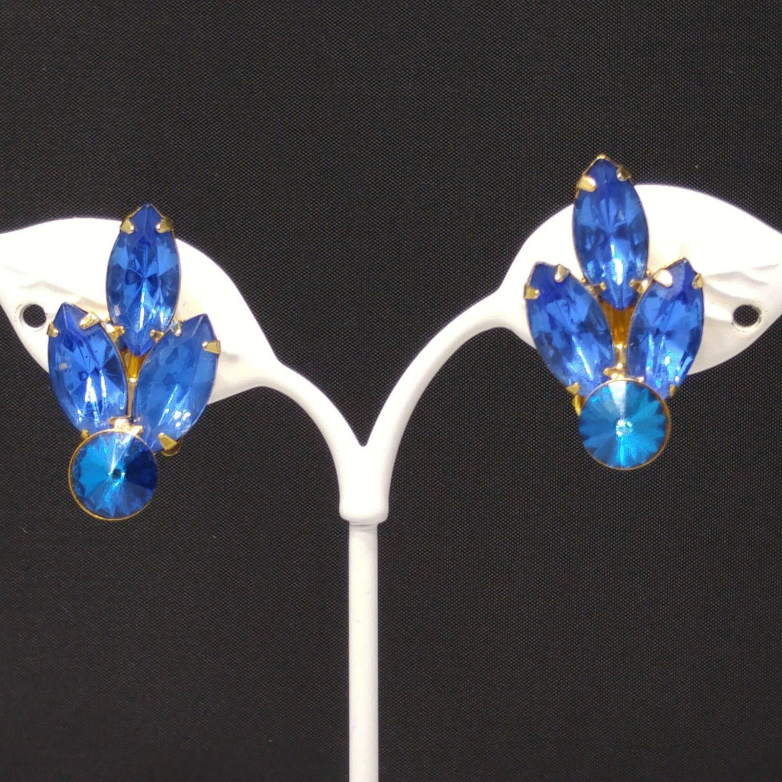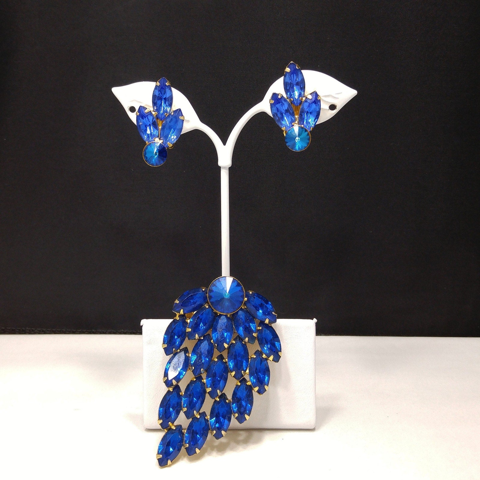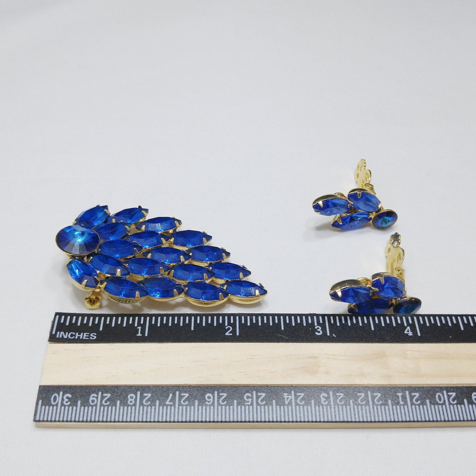*Description: This is a gorgeous mid-century floral spray topped with a sparkling rivoli rhinestone on both the brooch and clip on earrings from the 1960s. The blue, with a touch of green, rivoili rhinestone is at the top of the design with blue marquise cut rhinetones completing the floral spray on the brooch. The matching clip on earrings have a smaller matching rivoli rhinestone with three blue marquise cut rhinestones as leaves. The rivoli rhinestones on all pieces are the same color. The marquise cut rhinestones on the earrings are a slight shade lighter blue which accentuates the rivoli stone. Each piece is gold plated on the back and each rhinestone is prong set. This is a beautiful shade of blue. It would be a great addition to your vintage jewelry collection or make a great vintage gift!